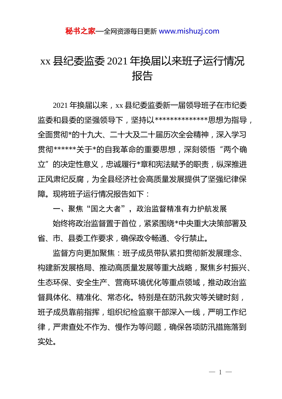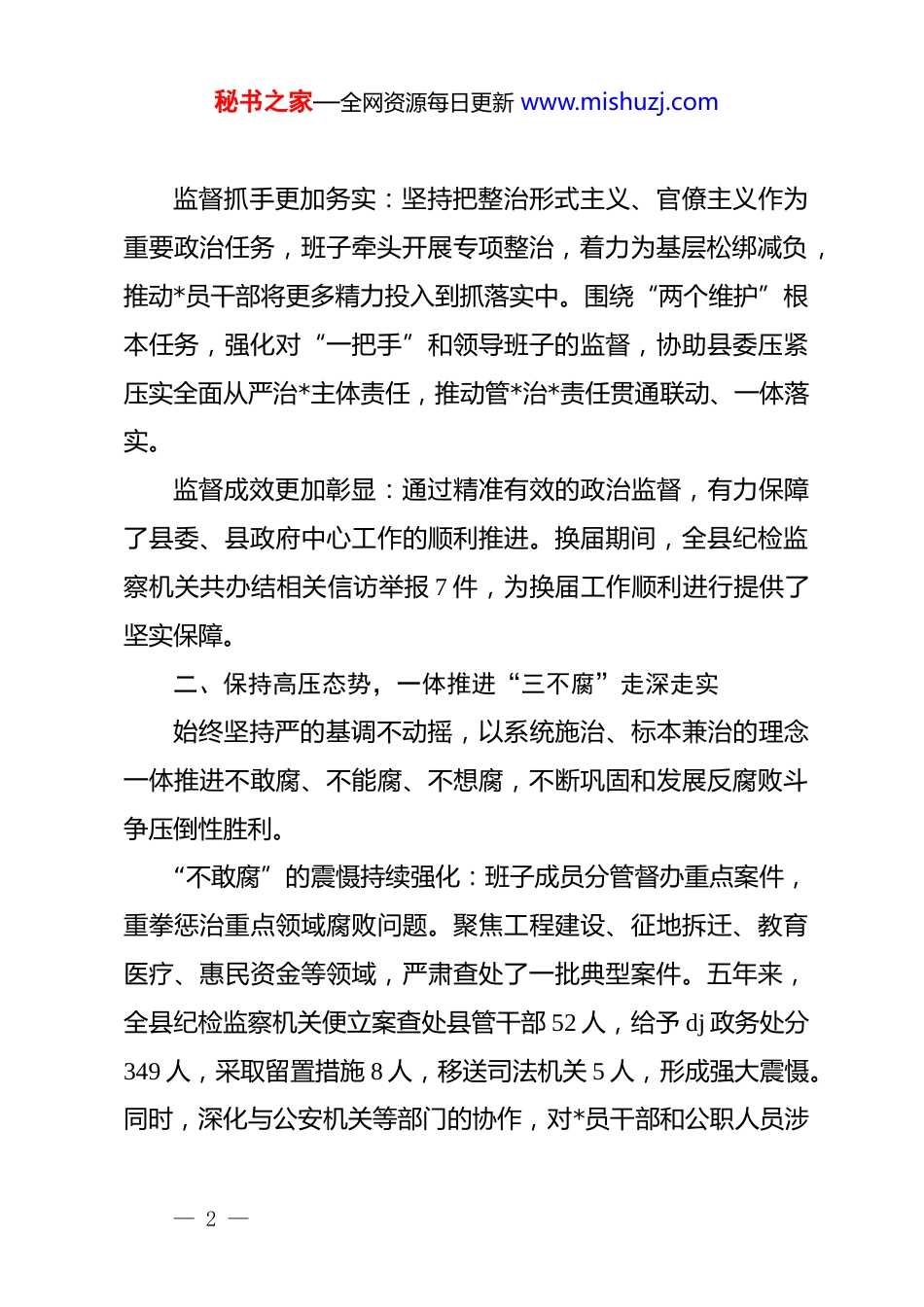 秘书之家—全网资源每日更新 www.mishuzj.comxx 县纪委监委 2021 年换届以来班子运行情况报告2021 年换届以来,xx 县纪委监委新一届领导班子在市纪委监委和县委的坚强领导下,坚持以**************思想为指导,全面贯彻*的十九大、二十大及二十届历次全会精神,深入学习贯彻******关于*的自我革命的重要思想,深刻领悟“两个确立”的决定性意义,忠诚履行*章和宪法赋予的职责,纵深推进正风肃纪反腐,为全县经济社会高质量发展提供了坚强纪律保障。现将班子运行情况报告如下:一、聚焦“国之大者”,政治监督精准有力护航发展始终将政治监督置于首位,紧紧围绕*中央重大决策部署及省、市、县委工作要求,确保政令畅通、令行禁止。监督方向更加聚焦:班子成员带队紧扣贯彻新发展理念、构建新发展格局、推动高质量发展等重大战略,聚焦乡村振兴、生态环保、安全生产、营商环境优化等重点领域,推动政治监督具体化、精准化、常态化。特别是在防汛救灾等关键时刻,班子成员靠前指挥,组织纪检监察干部深入一线,严明工作纪律,严肃查处不作为、慢作为等问题,确保各项防汛措施落到实处。— 1 —秘书之家—全网资源每日更新 www.mishuzj.com监督抓手更加务实:坚持把整治形式主义、官僚主义作为重要政治任务,班子牵头开展专项整治,着力为基层松绑减负,推动*员干部将更多精力投入到抓落实中。围绕“两个维护”根本任务,强化对“一把手”和领导班子的监督,协助县委压紧压实全面从严治*主体责任,推动管*治*责任贯通联动、一体落实。监督成效更加彰显:通过精准有效的政治监督,有力保障了县委、县政府中心工作的顺利推进。换届期间,全县纪检监察机关共办结相关信访举报 7 件,为换届工作顺利进行提供了坚实保障。二、保持高压态势,一体推进“三不腐”走深走实始终坚持严的基调不动摇,以系统施治、标本兼治的理念一体推进不敢腐、不能腐、不想腐,不断巩固和发展反腐败斗争压倒性胜利。“不敢腐”的震慑持续强化:班子成员分管督办重点案件,重拳惩治重点领域腐败问题。聚焦工程建设、征地拆迁、教育医疗、惠民资金等领域,严肃查处了一批典型案件。五年来,全县纪检监察机关便立案查处县管干部 52 人,给予 dj 政务处分349 人,采取留置措施 8 人,移送司法机关 5 人,形成强大震慑。同时,深化与公安机关等部门的协作,对*员干部和公职人员涉— 2 —秘书之家—全网资源每日更新 www.mishuzj.com赌等问题进行联合查处,净化社会风气。“不能腐”的笼子持续扎紧:坚持以案促改、以案促治,针对案件暴露的制度漏洞和监管短板,精准制发纪检监察建议,督促相关单位建章立制、堵塞漏洞。班子成员带队深入研判政治生态,推动建立健全权力运行监督制约机制。规范“三重一大”事项决策程序,加强对决策过程的监督,防止权力滥用。“不想腐”的自觉持续增强:班子高度重视廉洁文化建设,筑牢拒腐防变思想防线。组织开展形式多样的警示教育活动,如下发典型案例通报、召开警示教育大会、组织观看警示教育片等,用身边事教育身边人。创新开展廉政勤政提问谈话,对重点岗位干部进行常态化提醒,引导*员干部知敬畏、存戒惧、守底线。三、坚持纠树并举,作风建设常态长效向上向好始终把落实中央八项规定精神作为长期有效的铁规矩、硬杠杠,驰而不息纠治“四风”,推动*风政风持续向好,带动社风民风不断改善。常态化纠治享乐奢靡之风:紧盯重要节点、重点场所,班子成员带队开展明察暗访,严肃查处违规吃喝、违规收送礼品礼金、公车私用等顽瘴痼疾。创新运用科技手段,通过调阅监控等方式,精准发现和查处公车私用等隐形变异问题,让“四— 3 —秘书之家—全网资源每日更新 www.mishuzj.com风”问题无处遁形。精准化整治群众身边腐败和作风问题:班子成员牵头部署开展群众身边不正之风和腐败问题集中整治,以“小切口”专项监督为抓手,聚焦教育医疗、养老社保、生态环保、惠农补贴等领域,严肃查处了一批侵害群众利益的“蝇贪蚁腐”。严肃查处了侵占森林生态效益补偿资金、套取扶贫项目资金、挪用群众补助款等典型案件,切实维护了群众的切身利益。通过“小切口”专...