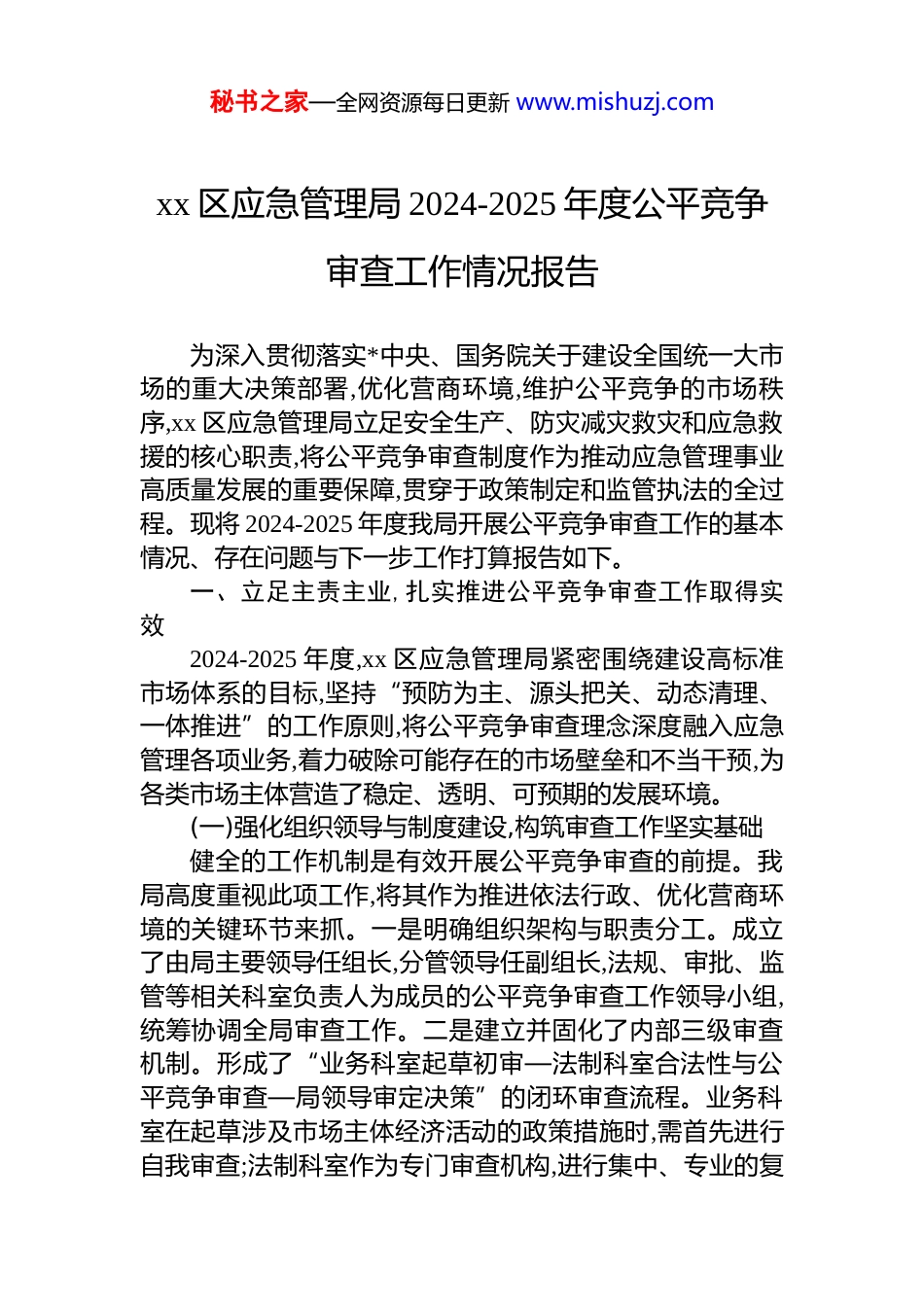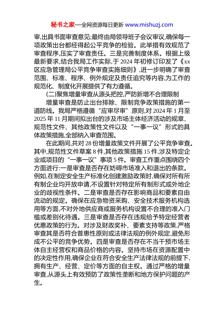 秘书之家—全网资源每日更新 www.mishuzj.comxx 区应急管理局 2024-2025 年度公平竞争审查工作情况报告为深入贯彻落实*中央、国务院关于建设全国统一大市场的重大决策部署,优化营商环境,维护公平竞争的市场秩序,xx 区应急管理局立足安全生产、防灾减灾救灾和应急救援的核心职责,将公平竞争审查制度作为推动应急管理事业高质量发展的重要保障,贯穿于政策制定和监管执法的全过程。现将 2024-2025 年度我局开展公平竞争审查工作的基本情况、存在问题与下一步工作打算报告如下。一、立足主责主业,扎实推进公平竞争审查工作取得实效2024-2025 年度,xx 区应急管理局紧密围绕建设高标准市场体系的目标,坚持“预防为主、源头把关、动态清理、一体推进”的工作原则,将公平竞争审查理念深度融入应急管理各项业务,着力破除可能存在的市场壁垒和不当干预,为各类市场主体营造了稳定、透明、可预期的发展环境。(一)强化组织领导与制度建设,构筑审查工作坚实基础健全的工作机制是有效开展公平竞争审查的前提。我局高度重视此项工作,将其作为推进依法行政、优化营商环境的关键环节来抓。一是明确组织架构与职责分工。成立了由局主要领导任组长,分管领导任副组长,法规、审批、监管等相关科室负责人为成员的公平竞争审查工作领导小组,统筹协调全局审查工作。二是建立并固化了内部三级审查机制。形成了“业务科室起草初审—法制科室合法性与公平竞争审查—局领导审定决策”的闭环审查流程。业务科室在起草涉及市场主体经济活动的政策措施时,需首先进行自我审查;法制科室作为专门审查机构,进行集中、专业的复秘书之家—全网资源每日更新 www.mishuzj.com审,出具书面审查意见;最终由局领导班子会议审议,确保每一项政策出台都经得起公平竞争的检验。此举措有效规范了审查程序,压实了审查责任。三是完善制度体系。根据上级最新要求,结合我局工作实际,于 2024 年初修订印发了《xx区应急管理局公平竞争审查实施细则》,进一步明确了审查范围、标准、程序、例外规定及责任追究等内容,为工作的规范化、制度化开展提供了有力遵循。(二)聚焦增量审查从源头把控,严防新增不合理限制增量审查是防止出台排除、限制竞争政策措施的第一道防线。我局严格遵循“应审尽审”原则,对 2024 年 1 月至2025 年 11 月期间拟出台的涉及市场主体经济活动的规章、规范性文件、其他政策性文件以及“一事一议”形式的具体政策措施,全部纳入审查范围。在此期间,共对 28 份增量政策文件开展了公平竞争审查。其中,规范性文件草案 8 件,其他政策措施 15 件,涉及特定企业或项目的“一事一议”事项 5 件。审查工作重点围绕四个方面进行:一是审查是否存在妨碍市场准入和退出的条款。例如,在制定安全生产标准化创建激励政策时,确保对所有所有制企业均开放申请,不设置针对特定所有制形式或外地企业的歧视性条件。二是审查是否存在影响商品和要素自由流动的规定。确保在应急物资采购、安全技术服务机构选用等方面,不对外地供应商或服务机构设置不合理的准入门槛或差别化待遇。三是审查是否存在违规给予特定经营者优惠政策的行为。对涉及财政奖补、要素支持等政策,严格审查其是否符合普惠性原则或法律法规的例外规定,避免形成不公平的竞争优势。四是审查是否存在不当干预市场主体自主经营权和商品价格的内容。坚持市场在资源配置中的决定性作用,确保企业在符合安全生产法律法规的前提下,拥有生产、经营、定价等方面的自主权。通过严格的增量审查,从源头上有效预防了政策性垄断和地方保护问题的产生。秘书之家—全网资源每日更新 www.mishuzj.com(三)深化存量清理与动态评估,持续优化既有政策环境为系统性维护市场公平,我局不仅严把“增量”入口,同样重视对“存量”政策的清理与评估。2024 年下半年,我局组织开展了覆盖 2024 年以前现行有效政策措施的全面梳理与集中清理工作。共计对 115 份存量文件进行了逐一筛查和评估。清理工作聚焦于是否存在设置不合理市场准入壁垒违规给予特定企业优惠、实行地方保护、指定交易等妨碍统一市场和公平竞争的内容。经过评估,发现有 5 份文件中存在部分表述可能引发歧义或...