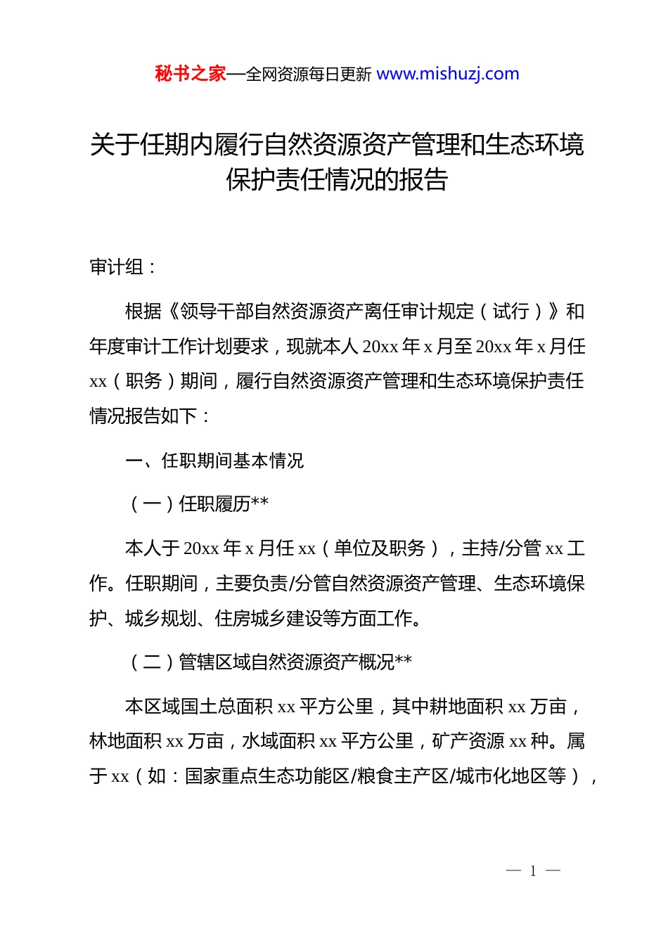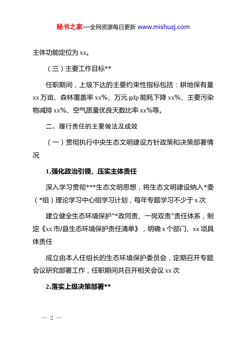 秘书之家—全网资源每日更新 www.mishuzj.com关于任期内履行自然资源资产管理和生态环境保护责任情况的报告审计组:根据《领导干部自然资源资产离任审计规定(试行)》和年度审计工作计划要求,现就本人 20xx 年 x 月至 20xx 年 x 月任xx(职务)期间,履行自然资源资产管理和生态环境保护责任情况报告如下:一、任职期间基本情况(一)任职履历**本人于 20xx 年 x 月任 xx(单位及职务),主持/分管 xx 工作。任职期间,主要负责/分管自然资源资产管理、生态环境保护、城乡规划、住房城乡建设等方面工作。(二)管辖区域自然资源资产概况**本区域国土总面积 xx 平方公里,其中耕地面积 xx 万亩,林地面积 xx 万亩,水域面积 xx 平方公里,矿产资源 xx 种。属于 xx(如:国家重点生态功能区/粮食主产区/城市化地区等),— 1 —秘书之家—全网资源每日更新 www.mishuzj.com主体功能定位为 xx。(三)主要工作目标**任职期间,上级下达的主要约束性指标包括:耕地保有量xx 万亩、森林覆盖率 xx%、万元 gdp 能耗下降 xx%、主要污染物减排 xx%、空气质量优良天数比率 xx%等。二、履行责任的主要做法及成效(一)贯彻执行中央生态文明建设方针政策和决策部署情况1.强化政治引领,压实主体责任深入学习贯彻***生态文明思想,将生态文明建设纳入*委(*组)理论学习中心组学习计划,每年专题学习不少于 x 次建立健全生态环境保护"*政同责、一岗双责"责任体系,制定《xx 市/县生态环境保护责任清单》,明确 x 个部门、xx 项具体责任成立由本人任组长的生态环境保护委员会,定期召开专题会议研究部署工作,任职期间共召开相关会议 xx 次2.落实上级决策部署**— 2 —秘书之家—全网资源每日更新 www.mishuzj.com坚决贯彻*中央、国务院关于打好污染防治攻坚战的决策部署,制定实施方案,明确时间表、路线图、责任人认真落实中央生态环境保护督察反馈意见,完成整改任务xx 项,整改完成率 xx%严格执行国家主体功能区战略,划定并严守生态保护红线xx 平方公里,占国土面积 xx%(二)遵守自然资源资产管理和生态环境保护法律法规情况1.坚持依法决策**严格执行《环境保护法》《土地管理法》《水污染防治法》等法律法规,重大事项均经过合法性审查建立重大行政决策程序制度,涉及自然资源资产和生态环境的重大决策,严格执行公众参与、专家论证、风险评估、合法性审查、集体讨论决定等程序任职期间,未发生因违法决策导致的重大生态环境损害事件2 规范行政执法— 3 —秘书之家—全网资源每日更新 www.mishuzj.com深化生态环境保护综合行政执法改革,整合执法力量,提升执法效能任职期间,共查处环境违法案件 xx 起,罚款金额 xx 万元,移送司法机关 xx 起严格落实"双随机、一公开"监管制度,执法信息公开率100%(三)自然资源资产管理和生态环境保护重大决策情况1.科学编制规划-组织编制《xx 市/县国土空间总体规划(20xx-20xx 年)》,划定"三区三线",优化国土空间开发保护格局-编制《xx 市/县生态文明建设规划》《xx 市/县"十四五"生态环境保护规划》等专项规划 x 项-建立规划实施评估机制,定期开展规划实施情况评估2.推进重大生态工程**组织实施 xx 生态修复工程,修复治理面积 xx 平方公里,投入资金 xx 亿元推进山水林田湖草沙一体化保护和系统治理,实施 xx 流域— 4 —秘书之家—全网资源每日更新 www.mishuzj.com综合治理项目-建设 xx 湿地公园/森林公园/自然保护区,新增受保护面积xx 平方公里3.优化产业布局**严格执行环境准入制度,任职期间否决不符合环保要求的项目 xx 个,涉及投资 xx 亿元推动产业转型升级,淘汰落后产能 xx 万吨,关停"散乱污"企业 xx 家发展绿色产业,培育省级以上绿色工厂 xx 家,绿色建筑占比达到 xx%(四)完成自然资源资产管理和生态环境保护目标情况1.约束性指标完成情况**|指标名称|目标值|完成值|完成情况||---------|--------|--------|----------||耕地保有量|xx 万亩|xx 万亩|完成/超额完成||森林覆盖率|xx%|xx%|完成/超额完成||万元 gdp 能耗下...