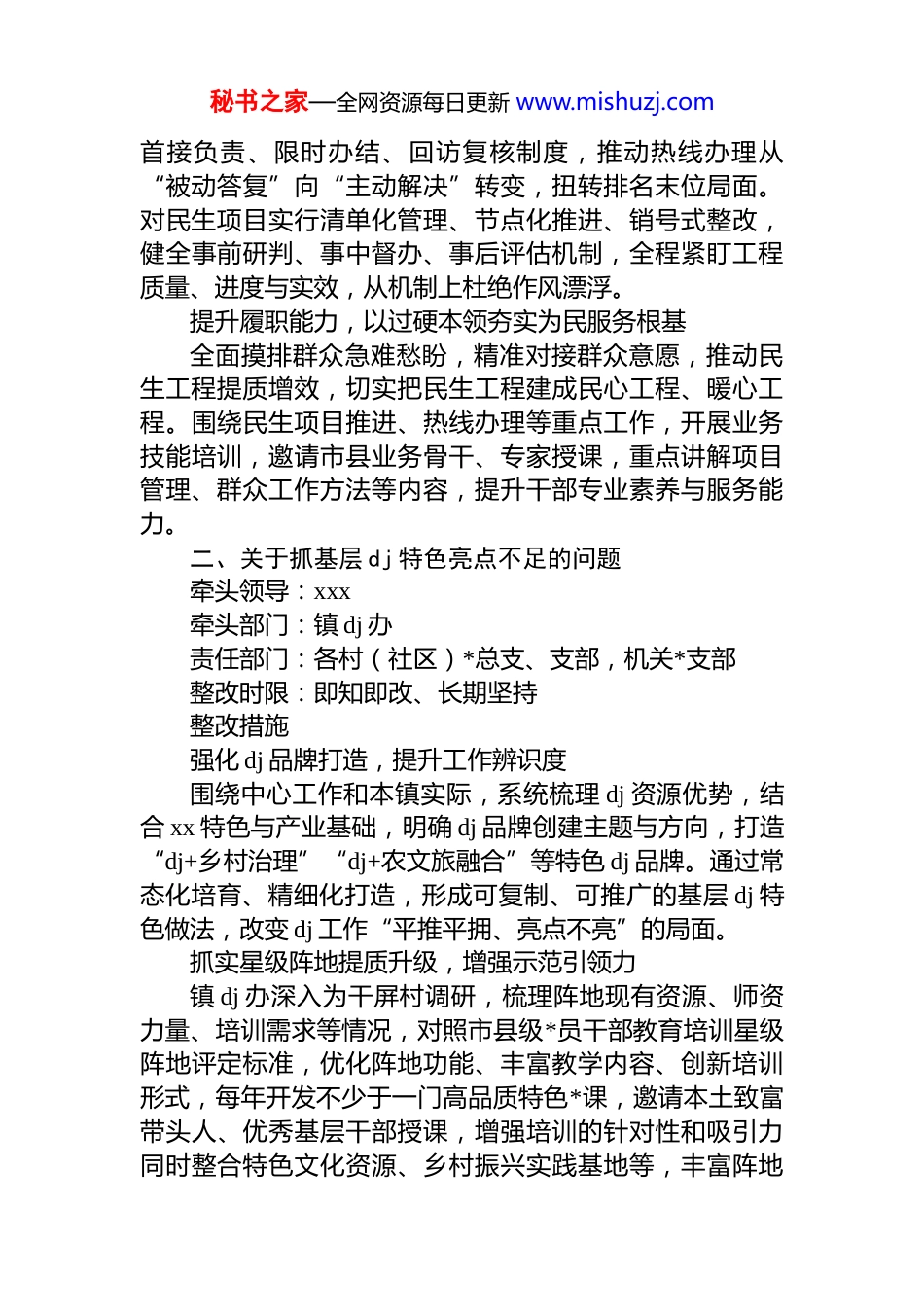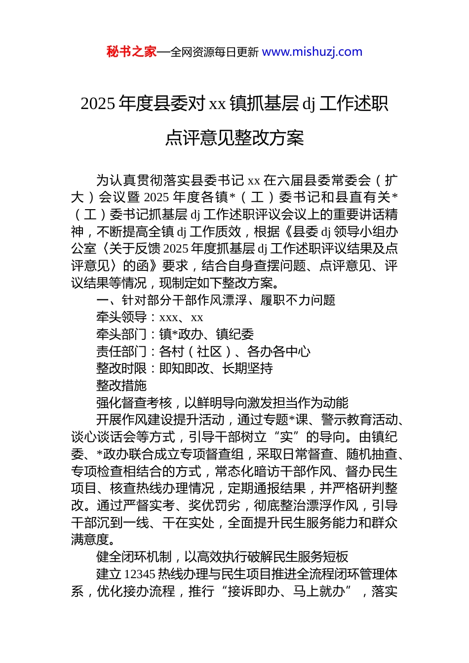 秘书之家—全网资源每日更新 www.mishuzj.com2025 年度县委对 xx 镇抓基层 dj 工作述职点评意见整改方案为认真贯彻落实县委书记 xx 在六届县委常委会(扩大)会议暨 2025 年度各镇*(工)委书记和县直有关*(工)委书记抓基层 dj 工作述职评议会议上的重要讲话精神,不断提高全镇 dj 工作质效,根据《县委 dj 领导小组办公室〈关于反馈 2025 年度抓基层 dj 工作述职评议结果及点评意见〉的函》要求,结合自身查摆问题、点评意见、评议结果等情况,现制定如下整改方案。一、针对部分干部作风漂浮、履职不力问题牵头领导:xxx、xx牵头部门:镇*政办、镇纪委责任部门:各村(社区)、各办各中心整改时限:即知即改、长期坚持整改措施强化督查考核,以鲜明导向激发担当作为动能开展作风建设提升活动,通过专题*课、警示教育活动、谈心谈话会等方式,引导干部树立“实”的导向。由镇纪委、*政办联合成立专项督查组,采取日常督查、随机抽查、专项检查相结合的方式,常态化暗访干部作风、督办民生项目、核查热线办理情况,定期通报结果,并严格研判整改。通过严督实考、奖优罚劣,彻底整治漂浮作风,引导干部沉到一线、干在实处,全面提升民生服务能力和群众满意度。健全闭环机制,以高效执行破解民生服务短板建立 12345 热线办理与民生项目推进全流程闭环管理体系,优化接办流程,推行“接诉即办、马上就办”,落实秘书之家—全网资源每日更新 www.mishuzj.com首接负责、限时办结、回访复核制度,推动热线办理从“被动答复”向“主动解决”转变,扭转排名末位局面。对民生项目实行清单化管理、节点化推进、销号式整改,健全事前研判、事中督办、事后评估机制,全程紧盯工程质量、进度与实效,从机制上杜绝作风漂浮。提升履职能力,以过硬本领夯实为民服务根基全面摸排群众急难愁盼,精准对接群众意愿,推动民生工程提质增效,切实把民生工程建成民心工程、暖心工程。围绕民生项目推进、热线办理等重点工作,开展业务技能培训,邀请市县业务骨干、专家授课,重点讲解项目管理、群众工作方法等内容,提升干部专业素养与服务能力。二、关于抓基层 dj 特色亮点不足的问题牵头领导:xxx牵头部门:镇 dj 办责任部门:各村(社区)*总支、支部,机关*支部整改时限:即知即改、长期坚持整改措施强化 dj 品牌打造,提升工作辨识度围绕中心工作和本镇实际,系统梳理 dj 资源优势,结合 xx 特色与产业基础,明确 dj 品牌创建主题与方向,打造“dj+乡村治理”“dj+农文旅融合”等特色 dj 品牌。通过常态化培育、精细化打造,形成可复制、可推广的基层 dj 特色做法,改变 dj 工作“平推平拥、亮点不亮”的局面。抓实星级阵地提质升级,增强示范引领力镇 dj 办深入为干屏村调研,梳理阵地现有资源、师资力量、培训需求等情况,对照市县级*员干部教育培训星级阵地评定标准,优化阵地功能、丰富教学内容、创新培训形式,每年开发不少于一门高品质特色*课,邀请本土致富带头人、优秀基层干部授课,增强培训的针对性和吸引力同时整合特色文化资源、乡村振兴实践基地等,丰富阵地秘书之家—全网资源每日更新 www.mishuzj.com培训载体,切实把阵地优势转化为 dj 亮点和工作实效。健全总结宣传机制,扩大 dj 影响力建立 dj 工作定期梳理、经验总结、对外宣传机制,及时挖掘优秀基层*组织典型案例、经验做法和优秀*员先进事迹,通过上报宣传信息、“xxxx”视频号等多渠道加强宣传展示,推动基层 dj 从“做了”向“做好、做精、做优”转变,不断提升 xx 镇 dj 工作知名度和影响力。三、关于农文旅融合发展后劲不足的问题牵头领导:xx、xx牵头部门:镇 dj 办、镇农业综合服务中心责任部门:各村(社区)整改时限:即知即改、长期坚持整改措施盘活资源要素,凝聚融合合力统筹盘、杏、桃核心资源,构建“赏花+文旅+产业”农文旅融合模式,重塑全文化体验与消费新场景。配合县文化广电体育旅游局,加快推进 xx 湿地公园提档升级。对镇域范围内的民宿进行全面摸排,实现“一宿一档”动态管理,盘活木井桃源内民宿建设及民风民宿,以场景化、体验式开发...
