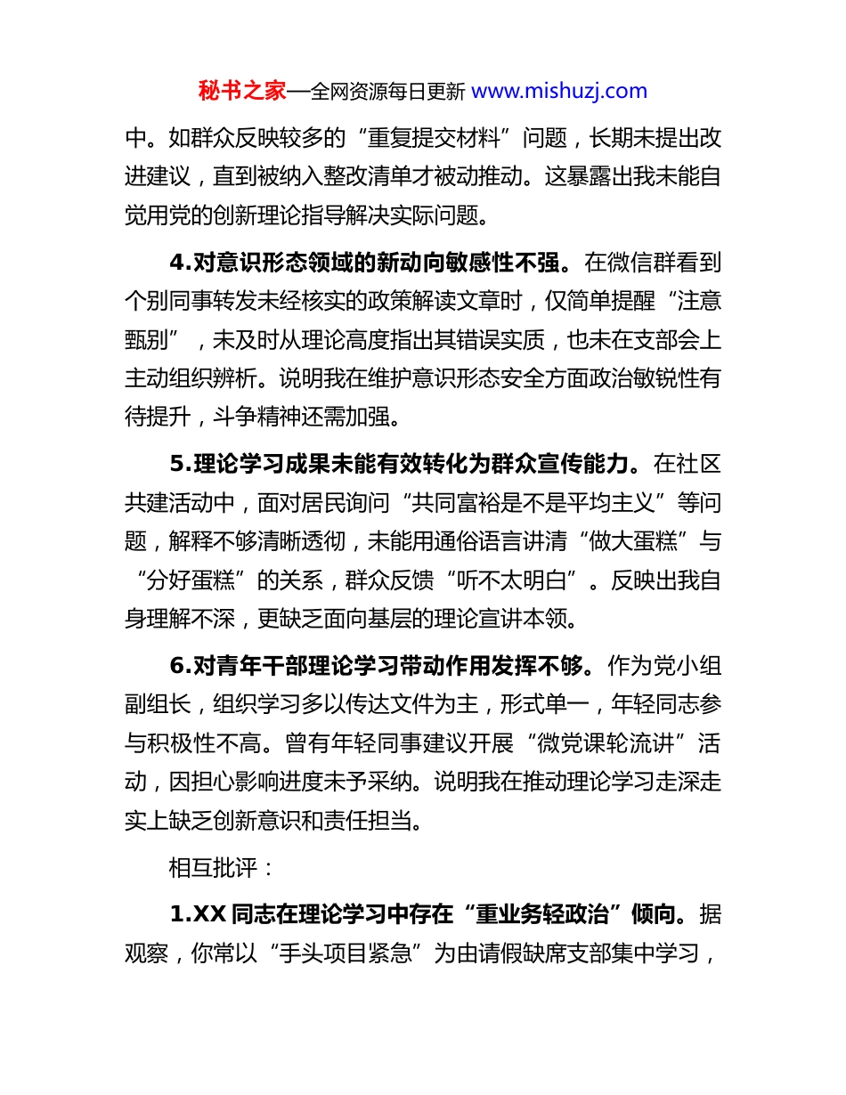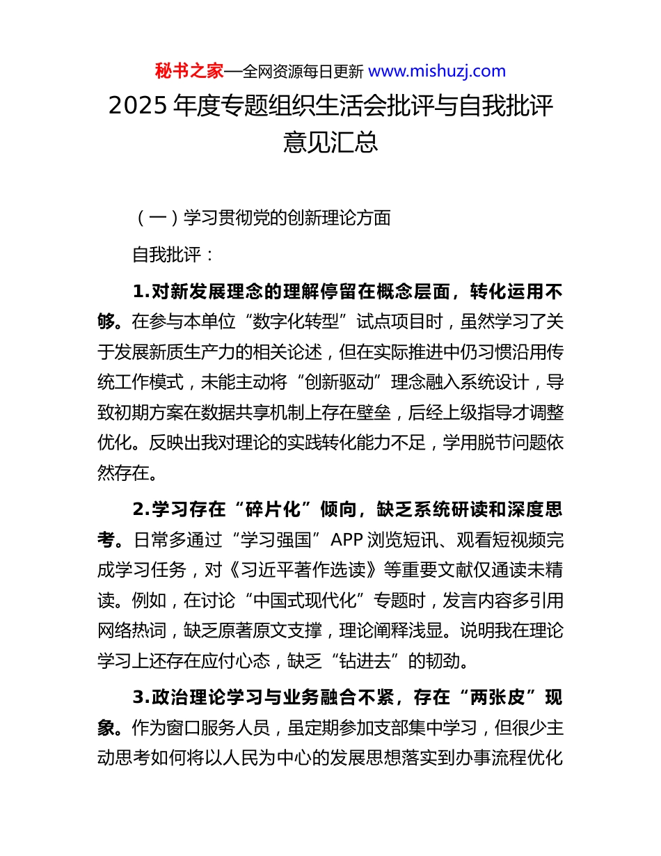 秘书之家—全网资源每日更新 www.mishuzj.com2025 年度专题组织生活会批评与自我批评意见汇总(一)学习贯彻党的创新理论方面自我批评:1.对新发展理念的理解停留在概念层面,转化运用不够。在参与本单位“数字化转型”试点项目时,虽然学习了关于发展新质生产力的相关论述,但在实际推进中仍习惯沿用传统工作模式,未能主动将“创新驱动”理念融入系统设计,导致初期方案在数据共享机制上存在壁垒,后经上级指导才调整优化。反映出我对理论的实践转化能力不足,学用脱节问题依然存在。2.学习存在“碎片化”倾向,缺乏系统研读和深度思考。日常多通过“学习强国”APP 浏览短讯、观看短视频完成学习任务,对《习近平著作选读》等重要文献仅通读未精读。例如,在讨论“中国式现代化”专题时,发言内容多引用网络热词,缺乏原著原文支撑,理论阐释浅显。说明我在理论学习上还存在应付心态,缺乏“钻进去”的韧劲。3.政治理论学习与业务融合不紧,存在“两张皮”现象。作为窗口服务人员,虽定期参加支部集中学习,但很少主动思考如何将以人民为中心的发展思想落实到办事流程优化秘书之家—全网资源每日更新 www.mishuzj.com中。如群众反映较多的“重复提交材料”问题,长期未提出改进建议,直到被纳入整改清单才被动推动。这暴露出我未能自觉用党的创新理论指导解决实际问题。4.对意识形态领域的新动向敏感性不强。在微信群看到个别同事转发未经核实的政策解读文章时,仅简单提醒“注意甄别”,未及时从理论高度指出其错误实质,也未在支部会上主动组织辨析。说明我在维护意识形态安全方面政治敏锐性有待提升,斗争精神还需加强。5.理论学习成果未能有效转化为群众宣传能力。在社区共建活动中,面对居民询问“共同富裕是不是平均主义”等问题,解释不够清晰透彻,未能用通俗语言讲清“做大蛋糕”与“分好蛋糕”的关系,群众反馈“听不太明白”。反映出我自身理解不深,更缺乏面向基层的理论宣讲本领。6.对青年干部理论学习带动作用发挥不够。作为党小组副组长,组织学习多以传达文件为主,形式单一,年轻同志参与积极性不高。曾有年轻同事建议开展“微党课轮流讲”活动,因担心影响进度未予采纳。说明我在推动理论学习走深走实上缺乏创新意识和责任担当。相互批评:1.XX 同志在理论学习中存在“重业务轻政治”倾向。据观察,你常以“手头项目紧急”为由请假缺席支部集中学习,秘书之家—全网资源每日更新 www.mishuzj.com全年缺勤达 3 次,且补学记录不完整。上次专题研讨拟提交的发言提纲仅 800 字,内容空泛。建议今后合理统筹工学矛盾,真正把理论学习作为提升政治能力的必修课。2.XX 同志对党的最新政策理解有时出现偏差。在一次科室例会上,你谈到“高质量发展就是少搞基建”,这一理解明显片面。当时我没有及时纠正,现在提出来希望引起重视。建议加强对中央经济工作会议精神的系统学习,准确把握“稳中求进、以进促稳”的深刻内涵。3.XX 同志理论联系实际的能力有待提升。你在撰写年度总结时,大段引用党的二十大报告原文,但结合岗位履职的具体分析较少,显得“贴标签”式套用。比如谈“科技自立自强”,却未提及本部门技术卡点攻关情况。建议增强问题意识,让理论真正“落地”。4.XX 同志在集体学习中发言主动性不足。多次专题研讨中,你基本处于“沉默状态”,即使点名发言也较为简短。这种“只听不说”的参与方式不利于思想碰撞和共同提高。建议增强主体意识,积极分享学习体会,促进互学共进。5.XX 同志对年轻同志理论辅导不够耐心。有新入职同事反映,请教你“两个确立”的决定性意义时,你回答“自己去查资料”,态度略显生硬。作为老党员,应主动承担起“传帮带”责任,帮助青年夯实理论根基。秘书之家—全网资源每日更新 www.mishuzj.com6.XX 同志对线上学习平台使用不充分。“共产党员网”推出的“主题教育每日一测”活动,你连续三周未参与,支部通报排名靠后。建议养成每日登录习惯,利用碎片时间巩固学习成果,避免临时突击应付检查。(二)加强党性锻炼方面自我批评:1.政治判断力有待提升,在复杂问题前立场不够坚定。前期单位内部讨论某项改革...