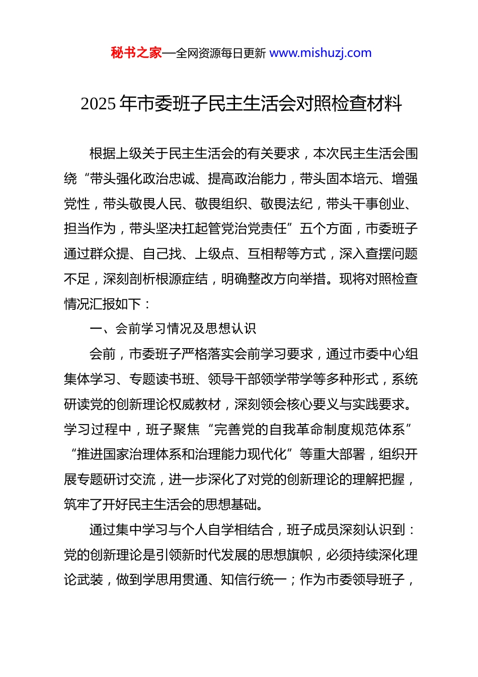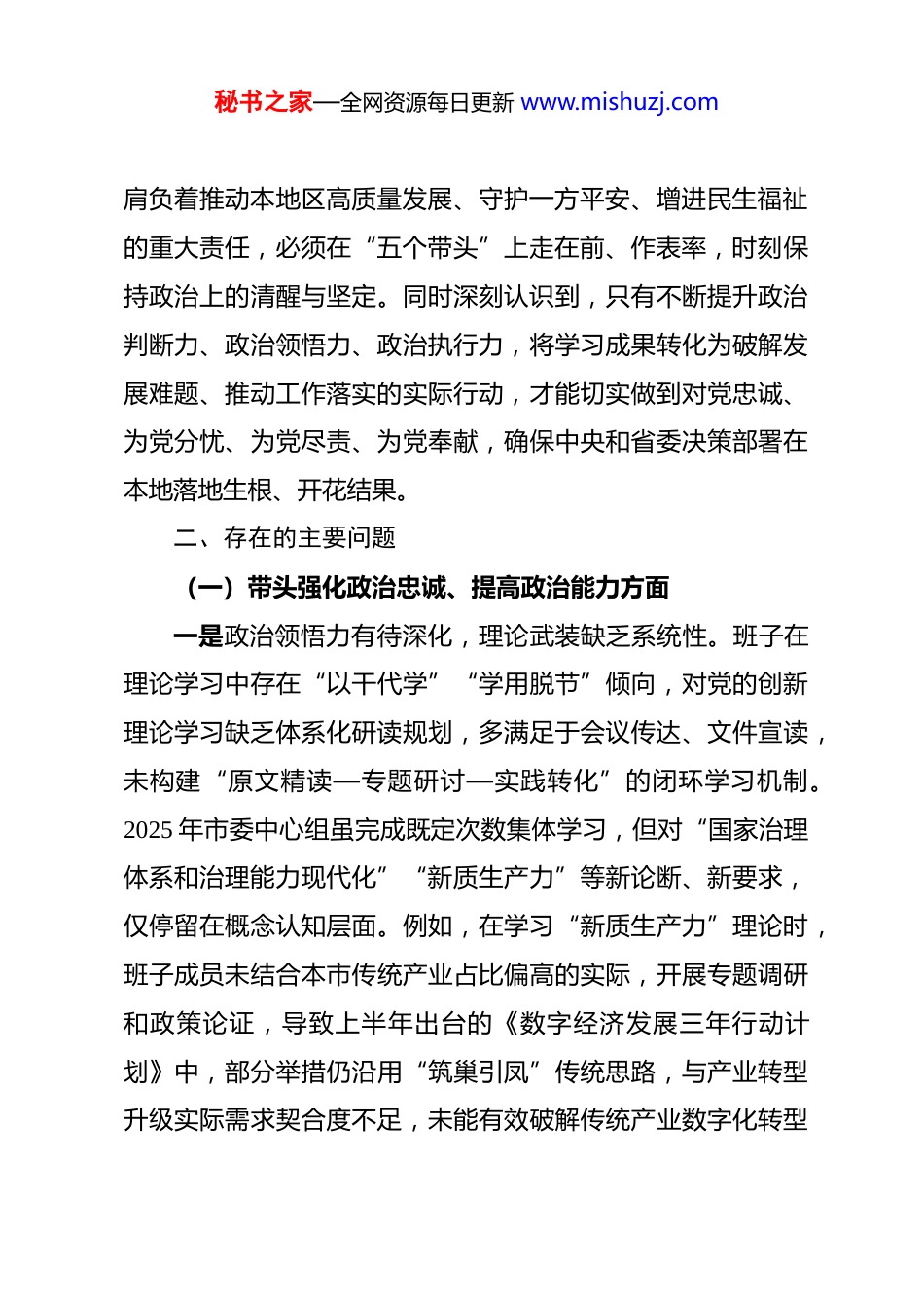 秘书之家—全网资源每日更新 www.mishuzj.com2025 年市委班子民主生活会对照检查材料根据上级关于民主生活会的有关要求,本次民主生活会围绕“带头强化政治忠诚、提高政治能力,带头固本培元、增强党性,带头敬畏人民、敬畏组织、敬畏法纪,带头干事创业、担当作为,带头坚决扛起管党治党责任”五个方面,市委班子通过群众提、自己找、上级点、互相帮等方式,深入查摆问题不足,深刻剖析根源症结,明确整改方向举措。现将对照检查情况汇报如下:一、会前学习情况及思想认识会前,市委班子严格落实会前学习要求,通过市委中心组集体学习、专题读书班、领导干部领学带学等多种形式,系统研读党的创新理论权威教材,深刻领会核心要义与实践要求。学习过程中,班子聚焦“完善党的自我革命制度规范体系”“推进国家治理体系和治理能力现代化”等重大部署,组织开展专题研讨交流,进一步深化了对党的创新理论的理解把握,筑牢了开好民主生活会的思想基础。通过集中学习与个人自学相结合,班子成员深刻认识到:党的创新理论是引领新时代发展的思想旗帜,必须持续深化理论武装,做到学思用贯通、知信行统一;作为市委领导班子,秘书之家—全网资源每日更新 www.mishuzj.com肩负着推动本地区高质量发展、守护一方平安、增进民生福祉的重大责任,必须在“五个带头”上走在前、作表率,时刻保持政治上的清醒与坚定。同时深刻认识到,只有不断提升政治判断力、政治领悟力、政治执行力,将学习成果转化为破解发展难题、推动工作落实的实际行动,才能切实做到对党忠诚、为党分忧、为党尽责、为党奉献,确保中央和省委决策部署在本地落地生根、开花结果。二、存在的主要问题(一)带头强化政治忠诚、提高政治能力方面一是政治领悟力有待深化,理论武装缺乏系统性。班子在理论学习中存在“以干代学”“学用脱节”倾向,对党的创新理论学习缺乏体系化研读规划,多满足于会议传达、文件宣读,未构建“原文精读—专题研讨—实践转化”的闭环学习机制。2025 年市委中心组虽完成既定次数集体学习,但对“国家治理体系和治理能力现代化”“新质生产力”等新论断、新要求,仅停留在概念认知层面。例如,在学习“新质生产力”理论时,班子成员未结合本市传统产业占比偏高的实际,开展专题调研和政策论证,导致上半年出台的《数字经济发展三年行动计划》中,部分举措仍沿用“筑巢引凤”传统思路,与产业转型升级实际需求契合度不足,未能有效破解传统产业数字化转型秘书之家—全网资源每日更新 www.mishuzj.com难题。二是政治执行力存在温差,决策部署落地成效不佳。贯彻落实中央“推动经济实现质的有效提升和量的合理增长”要求及省委部署时,存在“上下一般粗”“照搬照抄”现象,缺乏结合本地实际的差异化落实举措。在落实省委“营商环境优化年”部署中,虽制定多项改革措施,但牵头部门简单套用省级方案,未充分考量本市中小微企业占比超九成的实际情况,部分政策条款设置门槛偏高、流程繁琐,导致政策落地出现“中梗阻”。2025 年市级重点项目库中,部分项目因前期调研不充分、配套政策跟进不及时,推进进度滞后于预期,影响了整体发展质效。三是政治敏锐性需再提升,风险防范应对不够主动。班子对分管领域存在的潜在风险排查不够全面、预判不够精准,缺乏前瞻性应对思维。面对意识形态领域、经济领域等潜在风险,多采取“被动应对”模式,未建立常态化风险排查研判机制,对一些苗头性、倾向性问题发现不及时、处置不果断,未能牢牢掌握风险防控主动权,给全市发展稳定大局带来一定隐患。(二)带头固本培元、增强党性方面一是党性修养锤炼不够经常,自我革命精神有所弱化。班子在党性锤炼上存在“时紧时松”现象,对照党章党规党纪开秘书之家—全网资源每日更新 www.mishuzj.com展经常性检视的主动性不足,民主生活会批评与自我批评存在“辣味不足”问题,多以工作建议代替思想交锋,自我批评避重就轻,相互批评碍于情面。部分班子成员双重组织生活制度执行不够严格,参加所在支部组织生活时存在“走过场”情况,带头开展自我革命、直面问题的勇气和韧劲仍需加强。二是理想信念教育不够深入,思...