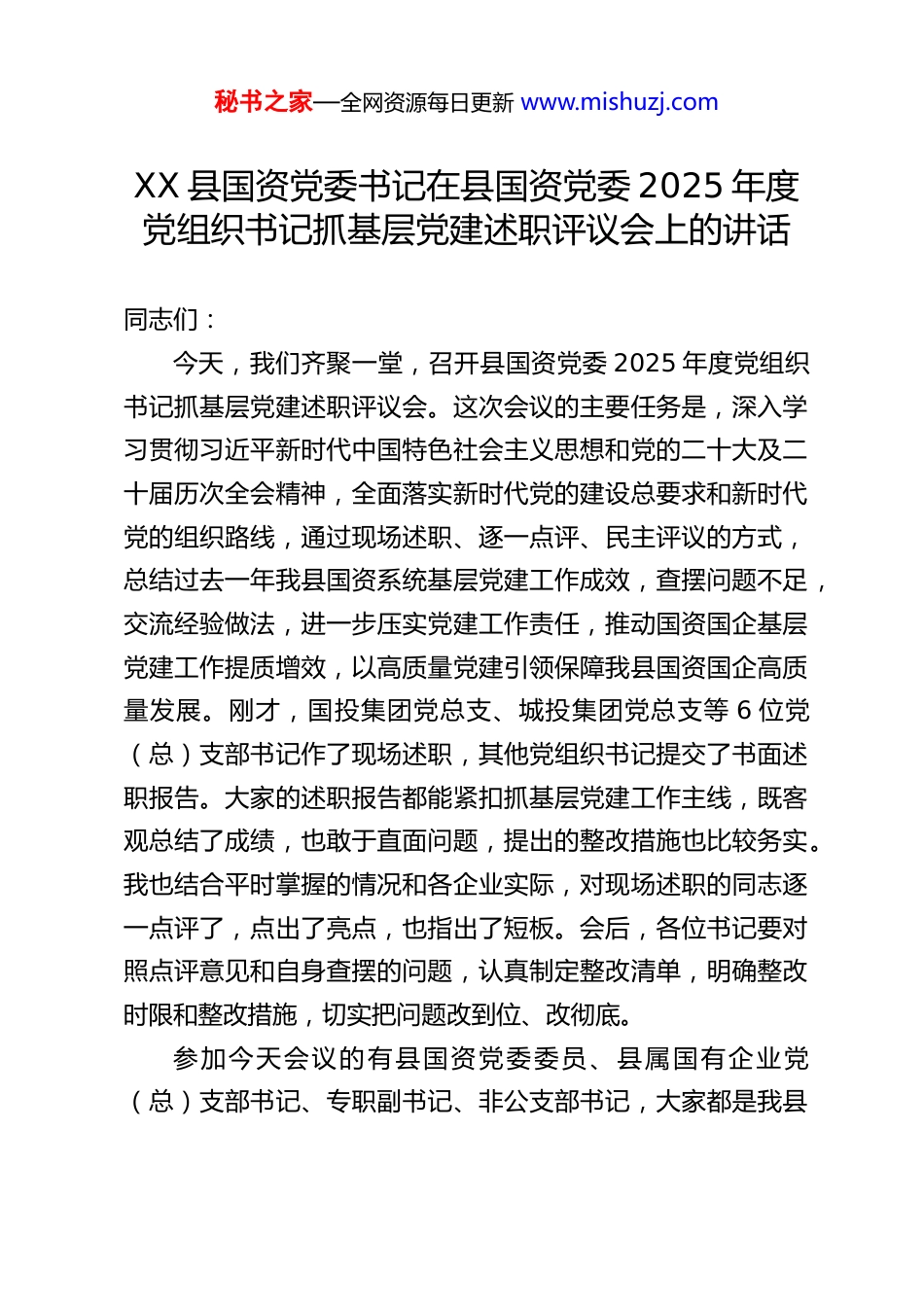 秘书之家—全网资源每日更新 www.mishuzj.comXX 县国资党委书记在县国资党委 2025 年度党组织书记抓基层党建述职评议会上的讲话同志们:今天,我们齐聚一堂,召开县国资党委 2025 年度党组织书记抓基层党建述职评议会。这次会议的主要任务是,深入学习贯彻习近平新时代中国特色社会主义思想和党的二十大及二十届历次全会精神,全面落实新时代党的建设总要求和新时代党的组织路线,通过现场述职、逐一点评、民主评议的方式,总结过去一年我县国资系统基层党建工作成效,查摆问题不足,交流经验做法,进一步压实党建工作责任,推动国资国企基层党建工作提质增效,以高质量党建引领保障我县国资国企高质量发展。刚才,国投集团党总支、城投集团党总支等 6 位党(总)支部书记作了现场述职,其他党组织书记提交了书面述职报告。大家的述职报告都能紧扣抓基层党建工作主线,既客观总结了成绩,也敢于直面问题,提出的整改措施也比较务实。我也结合平时掌握的情况和各企业实际,对现场述职的同志逐一点评了,点出了亮点,也指出了短板。会后,各位书记要对照点评意见和自身查摆的问题,认真制定整改清单,明确整改时限和整改措施,切实把问题改到位、改彻底。参加今天会议的有县国资党委委员、县属国有企业党(总)支部书记、专职副书记、非公支部书记,大家都是我县秘书之家—全网资源每日更新 www.mishuzj.com国资系统党建工作的直接组织者、推动者和实践者,国资国企党建工作能不能抓出成效、抓出特色,关键在大家。2025 年,是我县加快推动高质量发展的关键一年,也是国资国企深化改革、提质增效的攻坚之年。面对新形势新任务新要求,我们必须把党的建设摆在更加突出的位置,以更高标准、更实举措抓好基层党建工作,让党旗在国资国企改革发展一线高高飘扬。下面,我结合本次述职评议情况,讲三点意见。一、肯定成绩、坚定信心,充分认识 2025 年国资系统基层党建工作取得的新成效2025 年以来,县国资党委始终坚持以习近平新时代中国特色社会主义思想为指导,深入贯彻落实中央、省委、市委和县委关于国有企业党建工作的各项决策部署,牢牢把握“两个一以贯之”要求,以提升组织力为重点,突出政治功能,持续用力抓基层、打基础、强堡垒,推动国资系统基层党建工作取得了一系列新进展、新成效,为我县国资国企改革发展提供了坚强的政治保障和组织保障。一是政治建设铸魂走深走实,国企发展方向更加坚定。全系统各级党组织始终把党的政治建设摆在首位,严格落实“第一议题”制度,坚持把学习习近平新时代中国特色社会主义思想、习近平总书记关于国企改革发展和党的建设的重要论述作为各级党组织会议的第一内容,通过中心组学习、“三会一课”、主题党日、专题研讨等多种形式,推动党的创新理论进秘书之家—全网资源每日更新 www.mishuzj.com基层、进岗位、进职工心间。国投集团、城投集团等企业党组织结合自身业务特点,开展专题学习研讨活动,把学习成果转化为谋划工作的思路、推动工作的举措。同时,我们严格规范党组织前置研究程序,全面推行党组织书记、董事长“一肩挑”和领导班子交叉任职,进一步明确了党组织在公司治理中的法定地位,把党的领导全面融入公司治理各环节、全过程,确保国资国企发展始终沿着正确政治方向前进。二是基层堡垒建设提质增效,组织基础更加坚实。我们紧扣国有企业业务布局,坚持“应建尽建、设置规范、运行有效”原则,动态优化党支部、党小组设置,把党组织的触角延伸至生产一线、项目现场、关键岗位,实现了组织覆盖和工作覆盖“双覆盖”。矿投集团党总支针对矿山生产、项目建设等一线特点,在重点项目部设立党小组,让党员在项目攻坚中当先锋、作表率;文旅公司党支部结合文旅产业服务群众的特点,在景区服务窗口设立党员先锋岗,提升服务质量。全系统各级党组织严格落实“三会一课”、组织生活会、民主评议党员、主题党日等基本制度,不断创新组织生活形式和内容,摒弃形式主义,注重实际效果,让组织生活真正成为锤炼党员党性的“大熔炉”。同时,我们持续推进基层党组织标准化规范化建设,以标准化促规范化,以规范化提战斗力,基层...