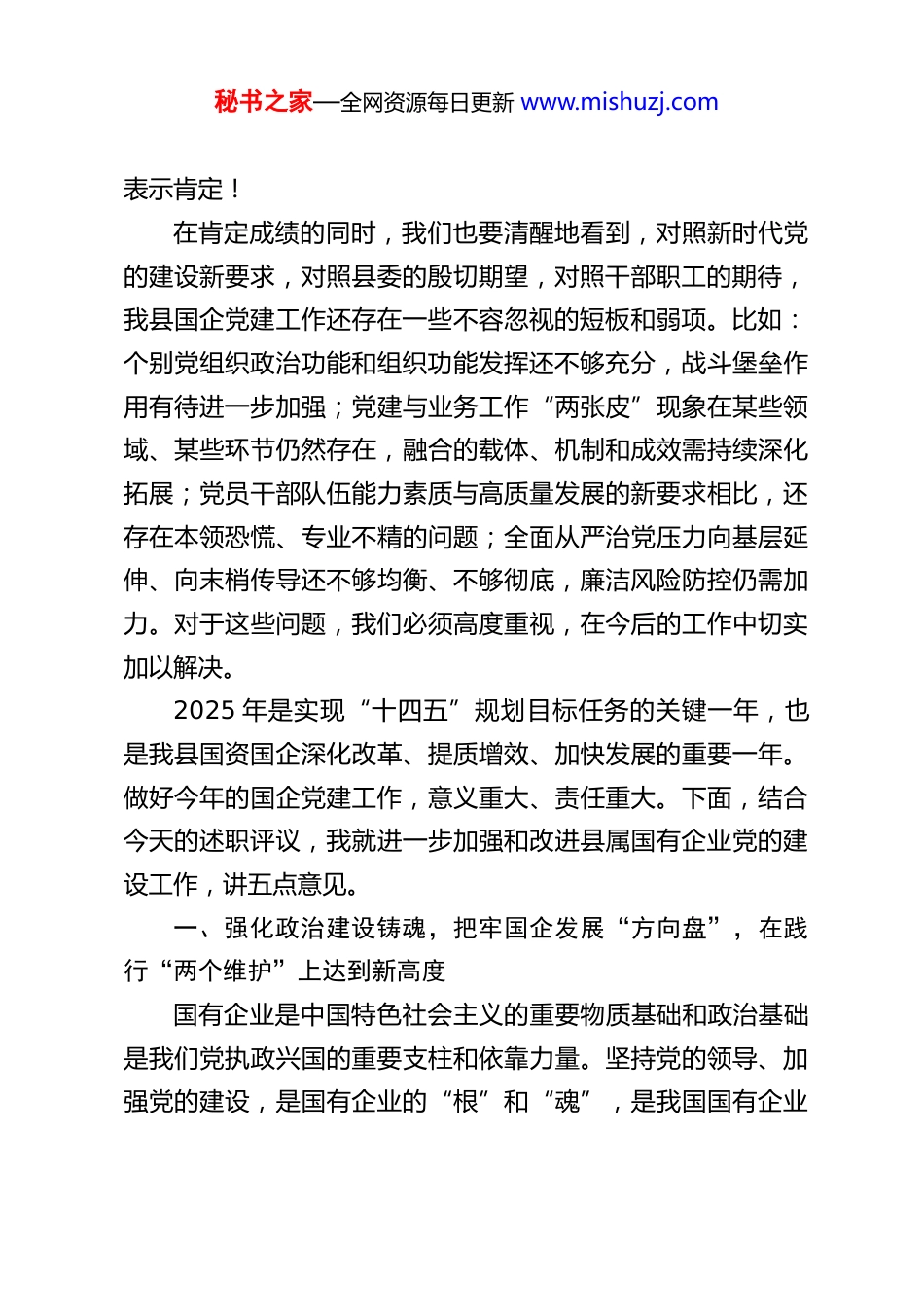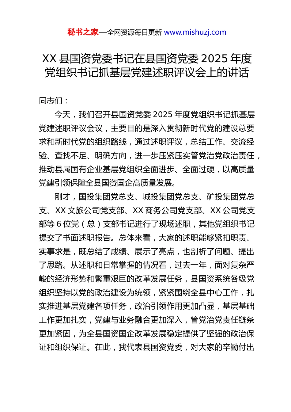 秘书之家—全网资源每日更新 www.mishuzj.comXX 县国资党委书记在县国资党委 2025 年度党组织书记抓基层党建述职评议会上的讲话同志们:今天,我们召开县国资党委 2025 年度党组织书记抓基层党建述职评议会议,主要目的是深入贯彻新时代党的建设总要求和新时代党的组织路线,通过述职评议,总结工作、交流经验、查找不足、明确方向,进一步压紧压实管党治党政治责任,推动县属国有企业基层党组织全面进步、全面过硬,以高质量党建引领保障全县国资国企高质量发展。刚才,国投集团党总支、城投集团党总支、矿投集团党总支、XX 文旅公司党支部、XX 商务公司党支部、XX 公司党支部等 6 位党(总)支部书记进行了现场述职,其他党组织书记提交了书面述职报告。总体来看,大家的述职能够紧扣职责、实事求是,既总结了成绩、展示了亮点,也剖析了问题、提出了思路。从述职和日常掌握的情况看,过去一年,面对复杂严峻的经济形势和繁重艰巨的改革发展任务,县国资系统各级党组织坚持以党的政治建设为统领,紧紧围绕全县中心工作,扎实推进基层党建各项任务,政治引领作用更加凸显,基层基础工作更加扎实,党建与业务融合更加深入,管党治党责任链条更加紧固,为全县国资国企改革发展稳定提供了坚强的政治保证和组织保证。在此,我代表县国资党委,对大家的辛勤付出秘书之家—全网资源每日更新 www.mishuzj.com表示肯定!在肯定成绩的同时,我们也要清醒地看到,对照新时代党的建设新要求,对照县委的殷切期望,对照干部职工的期待,我县国企党建工作还存在一些不容忽视的短板和弱项。比如:个别党组织政治功能和组织功能发挥还不够充分,战斗堡垒作用有待进一步加强;党建与业务工作“两张皮”现象在某些领域、某些环节仍然存在,融合的载体、机制和成效需持续深化拓展;党员干部队伍能力素质与高质量发展的新要求相比,还存在本领恐慌、专业不精的问题;全面从严治党压力向基层延伸、向末梢传导还不够均衡、不够彻底,廉洁风险防控仍需加力。对于这些问题,我们必须高度重视,在今后的工作中切实加以解决。2025 年是实现“十四五”规划目标任务的关键一年,也是我县国资国企深化改革、提质增效、加快发展的重要一年。做好今年的国企党建工作,意义重大、责任重大。下面,结合今天的述职评议,我就进一步加强和改进县属国有企业党的建设工作,讲五点意见。一、强化政治建设铸魂,把牢国企发展“方向盘”,在践行“两个维护”上达到新高度国有企业是中国特色社会主义的重要物质基础和政治基础是我们党执政兴国的重要支柱和依靠力量。坚持党的领导、加强党的建设,是国有企业的“根”和“魂”,是我国国有企业秘书之家—全网资源每日更新 www.mishuzj.com的独特优势。一要持续强化理论武装,筑牢思想根基。各级党组织必须始终把党的政治建设摆在首位,严格落实“第一议题”制度。要坚持把学习贯彻党的创新理论作为首要政治任务,深入学习领会其核心要义、精神实质、丰富内涵和实践要求,特别是要深刻把握关于国有企业改革发展和党的建设的重要论述。要坚持读原著、学原文、悟原理,做到学思用贯通、知信行统一。要通过党委理论学习中心组学习、专题研讨、“三会一课”、主题党日等多种形式,推动党的创新理论进基层、进岗位、进班组、进每位企业职工的心间。要大力弘扬理论联系实际的学风,引导广大党员干部职工自觉运用党的创新理论观察新形势、研究新情况、解决新问题,切实把学习成果转化为推动企业改革发展的清晰思路、有效举措和实际成效,转化为做强做优做大国有资本和国有企业的强大动力。二要坚决做到“两个维护”,把准政治方向。要教育引导全体党员干部职工深刻领悟“两个确立”的决定性意义,不断增强“四个意识”、坚定“四个自信”、做到“两个维护”,始终在政治立场、政治方向、政治原则、政治道路上同党中央保持高度一致。要严明党的政治纪律和政治规矩,严格执行重大事项请示报告制度,确保党中央各项决策部署和省委、市委、县委的工作要求不折不扣、精准高效地在县属国有企业落地生根、开花结果。要提高政治判断力、政治领悟力、政治执行力,秘书之家—全网...