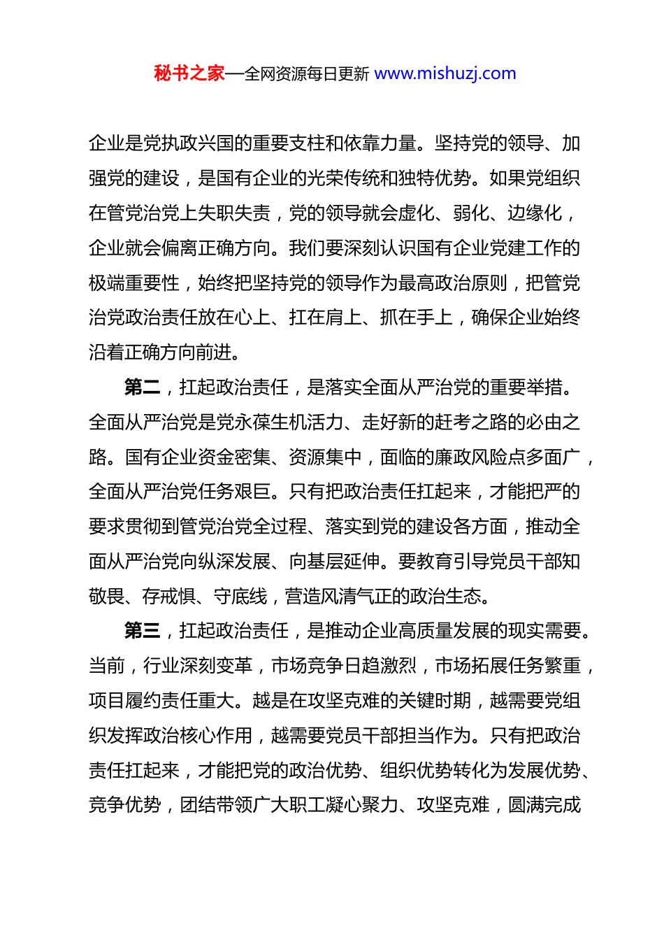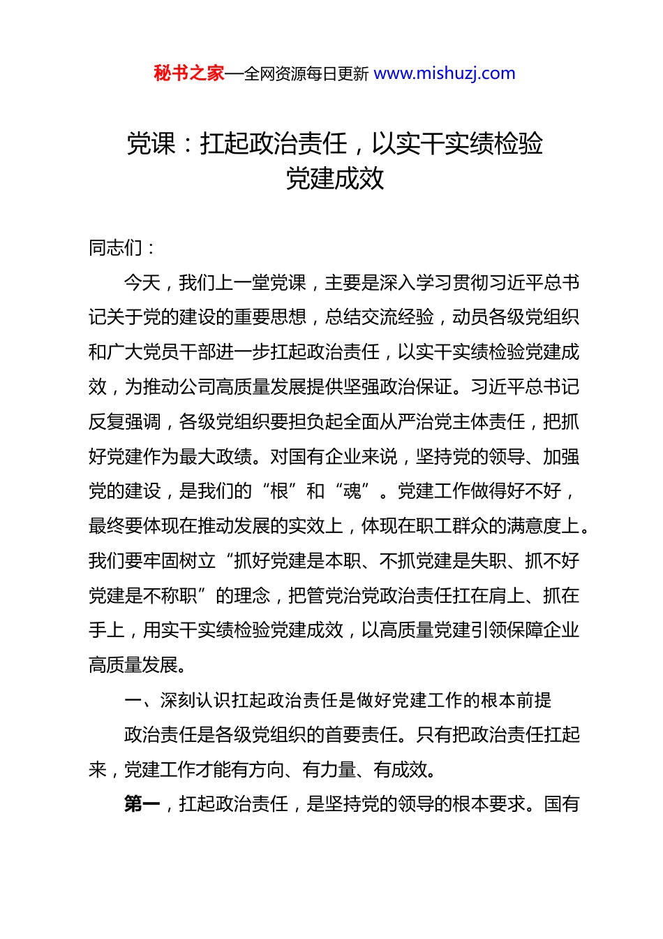 秘书之家—全网资源每日更新 www.mishuzj.com党课:扛起政治责任,以实干实绩检验党建成效 同志们:今天,我们上一堂党课,主要是深入学习贯彻习近平总书记关于党的建设的重要思想,总结交流经验,动员各级党组织和广大党员干部进一步扛起政治责任,以实干实绩检验党建成效,为推动公司高质量发展提供坚强政治保证。习近平总书记反复强调,各级党组织要担负起全面从严治党主体责任,把抓好党建作为最大政绩。对国有企业来说,坚持党的领导、加强党的建设,是我们的“根”和“魂”。党建工作做得好不好,最终要体现在推动发展的实效上,体现在职工群众的满意度上。我们要牢固树立“抓好党建是本职、不抓党建是失职、抓不好党建是不称职”的理念,把管党治党政治责任扛在肩上、抓在手上,用实干实绩检验党建成效,以高质量党建引领保障企业高质量发展。一、深刻认识扛起政治责任是做好党建工作的根本前提政治责任是各级党组织的首要责任。只有把政治责任扛起来,党建工作才能有方向、有力量、有成效。第一,扛起政治责任,是坚持党的领导的根本要求。国有秘书之家—全网资源每日更新 www.mishuzj.com企业是党执政兴国的重要支柱和依靠力量。坚持党的领导、加强党的建设,是国有企业的光荣传统和独特优势。如果党组织在管党治党上失职失责,党的领导就会虚化、弱化、边缘化,企业就会偏离正确方向。我们要深刻认识国有企业党建工作的极端重要性,始终把坚持党的领导作为最高政治原则,把管党治党政治责任放在心上、扛在肩上、抓在手上,确保企业始终沿着正确方向前进。第二,扛起政治责任,是落实全面从严治党的重要举措。全面从严治党是党永葆生机活力、走好新的赶考之路的必由之路。国有企业资金密集、资源集中,面临的廉政风险点多面广,全面从严治党任务艰巨。只有把政治责任扛起来,才能把严的要求贯彻到管党治党全过程、落实到党的建设各方面,推动全面从严治党向纵深发展、向基层延伸。要教育引导党员干部知敬畏、存戒惧、守底线,营造风清气正的政治生态。第三,扛起政治责任,是推动企业高质量发展的现实需要。当前,行业深刻变革,市场竞争日趋激烈,市场拓展任务繁重,项目履约责任重大。越是在攻坚克难的关键时期,越需要党组织发挥政治核心作用,越需要党员干部担当作为。只有把政治责任扛起来,才能把党的政治优势、组织优势转化为发展优势、竞争优势,团结带领广大职工凝心聚力、攻坚克难,圆满完成秘书之家—全网资源每日更新 www.mishuzj.com年度各项目标任务。第四,扛起政治责任,是检验干部担当作为的重要标尺。政治责任是检验党员干部党性修养、能力素质的试金石。一个干部有没有担当、能不能作为,首先要看政治上是否过硬、责任上是否落实。要把扛起政治责任作为评价干部的重要标准,教育引导党员干部在其位、谋其政、尽其责,以对党忠诚、为党分忧、为党尽职、为民造福的政治担当,奋力开创各项工作新局面。二、准确把握扛起政治责任的核心要义扛起政治责任,不是一句空洞的口号,而是有着丰富内涵和明确要求的实践课题。第一,扛起政治责任,就要把牢政治方向。方向是根本。要始终把政治建设摆在首位,教育引导党员干部深刻领悟“两个确立”的决定性意义,增强“四个意识”、坚定“四个自信”、做到“两个维护”。要坚持用习近平新时代中国特色社会主义思想武装头脑、指导实践、推动工作,确保党中央决策部署和上级党委工作要求在企业不折不扣落地生根。要严明政治纪律和政治规矩,在大是大非面前头脑清醒、立场坚定,在复杂考验面前稳得住心神、管得住行为。第二,扛起政治责任,就要服务中心大局。发展是第一要秘书之家—全网资源每日更新 www.mishuzj.com务。党建工作必须围绕中心、服务大局,不能搞“两张皮”。要把党建工作与市场拓展、项目履约、技术创新、风险防控等中心任务紧密结合起来,找准切入点和着力点。市场拓展口的党组织要围绕市场开拓发挥战斗堡垒作用,项目上的党组织要围绕工程履约发挥先锋模范作用,技术口的党组织要围绕科技创新发挥攻关引领作用。要把党建工作成效体现到推动企业高质量发展上,用发展成果检验党建成效。第三,扛...
