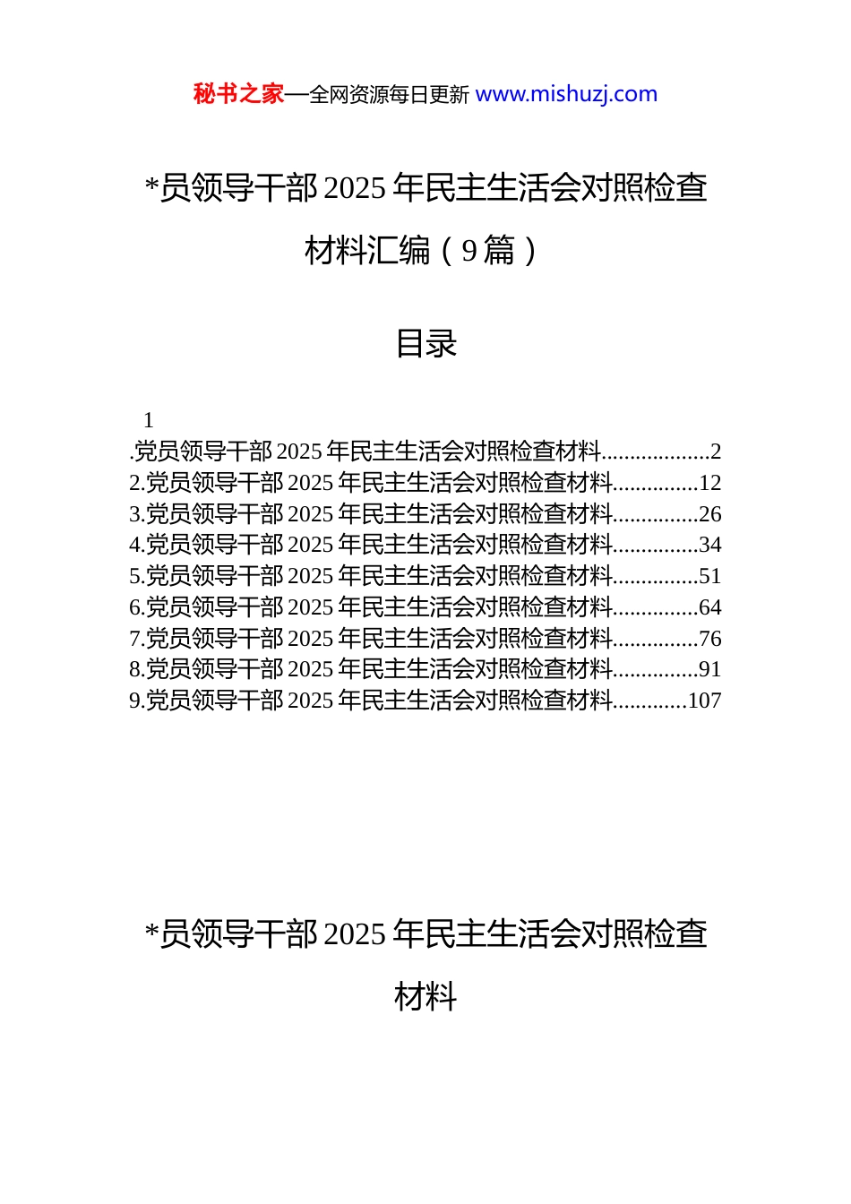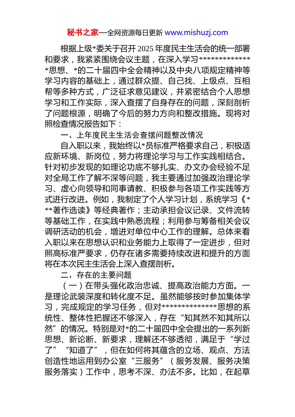 秘书之家—全网资源每日更新 www.mishuzj.com*员领导干部 2025 年民主生活会对照检查材料汇编(9 篇)目录1.党员领导干部 2025 年民主生活会对照检查材料...................22.党员领导干部 2025 年民主生活会对照检查材料...............123.党员领导干部 2025 年民主生活会对照检查材料...............264.党员领导干部 2025 年民主生活会对照检查材料...............345.党员领导干部 2025 年民主生活会对照检查材料...............516.党员领导干部 2025 年民主生活会对照检查材料...............647.党员领导干部 2025 年民主生活会对照检查材料...............768.党员领导干部 2025 年民主生活会对照检查材料...............919.党员领导干部 2025 年民主生活会对照检查材料.............107*员领导干部 2025 年民主生活会对照检查材料秘书之家—全网资源每日更新 www.mishuzj.com根据上级*委关于召开 2025 年度民主生活会的统一部署和要求,我紧紧围绕会议主题,在深入学习**************思想、*的二十届四中全会精神以及中央八项规定精神等学习内容的基础上,通过群众提、自己找、上级点、互相帮等多种方式,广泛征求意见建议,并紧密结合个人思想学习和工作实际,深入查摆了自身存在的问题,深刻剖析了问题根源,明确了今后的努力方向和整改措施。现将对照检查情况报告如下:一、上年度民主生活会查摆问题整改情况自入职以来,我始终以*员标准严格要求自己,积极适应新环境、新岗位,努力将理论学习与工作实践相结合。针对初步发现的如理论功底不够扎实、办文办会经验不足对全局工作了解不深等问题,我主要通过加强政治理论学习、虚心向领导和同事请教、积极参与各项工作实践等方式进行改进。例如,我制定了个人学习计划,系统学习《***著作选读》等经典著作;主动承担会议记录、文件流转等基础工作,在实践中熟悉流程;利用参与筹备相关会议调研活动的机会,增进对单位中心工作的理解。总体来看入职以来在思想认识和业务能力上取得了一定进步,但对照高标准严要求,仍存在诸多需要持续改进和提升的方面将在本次民主生活会上深入查摆剖析。二、存在的主要问题(一)在带头强化政治忠诚、提高政治能力方面。一是理论武装深度和转化度不足。虽然能够按时参加集体学习,完成规定的学习任务,但对**************思想的系统性、整体性把握还不够深入,存在“知其然不知其所以然”的情况。特别是对*的二十届四中全会提出的一系列新思想、新论断、新要求,理解还不够透彻,满足于“学过了”“知道了”,但在如何将其蕴含的立场、观点、方法创造性地运用到办公室“三服务”(服务发展、服务决策服务落实)工作中,思考不深、办法不多。比如,在起草秘书之家—全网资源每日更新 www.mishuzj.com一些文稿时,有时会不自觉地套用固定表述,结合本单位本地区实际进行深化、细化和转化不够,导致文稿的针对性、指导性有待加强,理论学习的“溢出效应”未能充分显现。二是政治敏锐性和鉴别力有待加强。作为新同志,对复杂情况的辨别能力和对潜在风险的预见性还需提升。有时看待问题、分析情况,习惯于从业务角度出发,从政治高度观察、分析和处理问题的意识不够强。例如,在处理一些信息报送或网络舆情线索时,有时更多关注事实本身,对其可能蕴含的政治风险和产生的政治影响研判不够及时、深入,政治“探头”作用发挥不充分。三是贯彻执行决策部署的“穿透力”有欠缺。对中央和上级的决策部署能够做到坚决拥护、迅速传达,但在推动落实的“最后一公里”上,有时存在“中梗阻”现象。由于对基层实际情况了解不够深入,在将宏观政策要求转化为具体落实举措时,有时显得办法不多、措施不硬,未能完全做到与上级要求同频共振、同向发力。在协助督查督办方面,有时对工作进展和实际效果的跟踪问效不够紧密,存在“重部署、轻落实”的倾向。(二)在带头固本培元、增强*性方面。一是*性锤炼的主动性和常态化不够。有时存在“事务主义”倾向,忙于日常具体工作较多,静下心来系统进行*性锻炼、反躬自省的时间相对不足。参加组织生活时,虽然能够完成规定动作,...