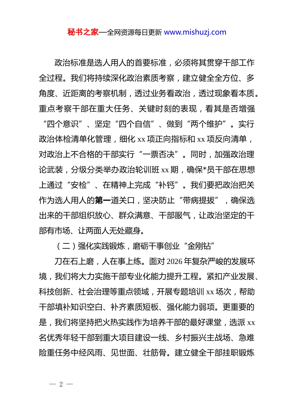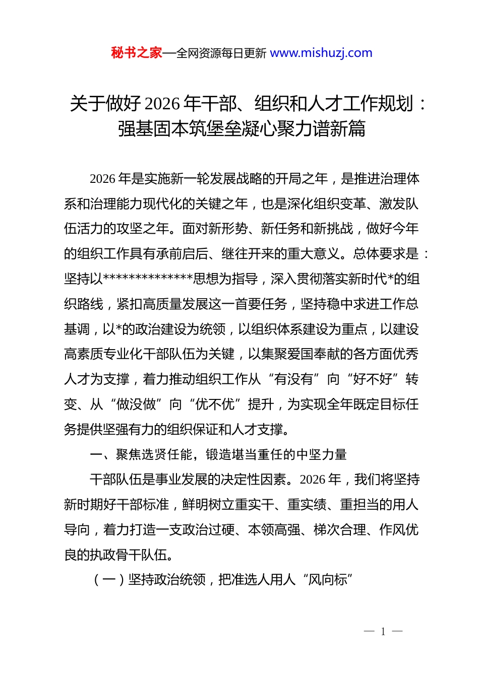 秘书之家—全网资源每日更新 www.mishuzj.com关于做好 2026 年干部、组织和人才工作规划:强基固本筑堡垒凝心聚力谱新篇2026 年是实施新一轮发展战略的开局之年,是推进治理体系和治理能力现代化的关键之年,也是深化组织变革、激发队伍活力的攻坚之年。面对新形势、新任务和新挑战,做好今年的组织工作具有承前启后、继往开来的重大意义。总体要求是:坚持以**************思想为指导,深入贯彻落实新时代*的组织路线,紧扣高质量发展这一首要任务,坚持稳中求进工作总基调,以*的政治建设为统领,以组织体系建设为重点,以建设高素质专业化干部队伍为关键,以集聚爱国奉献的各方面优秀人才为支撑,着力推动组织工作从“有没有”向“好不好”转变、从“做没做”向“优不优”提升,为实现全年既定目标任务提供坚强有力的组织保证和人才支撑。一、聚焦选贤任能,锻造堪当重任的中坚力量干部队伍是事业发展的决定性因素。2026 年,我们将坚持新时期好干部标准,鲜明树立重实干、重实绩、重担当的用人导向,着力打造一支政治过硬、本领高强、梯次合理、作风优良的执政骨干队伍。(一)坚持政治统领,把准选人用人“风向标”— 1 —秘书之家—全网资源每日更新 www.mishuzj.com政治标准是选人用人的首要标准,必须将其贯穿干部工作全过程。我们将持续深化政治素质考察,建立健全全方位、多角度、近距离的考察机制,透过业务看政治,透过现象看本质。重点考察干部在重大任务、关键时刻的表现,看其是否增强“四个意识”、坚定“四个自信”、做到“两个维护”。实行政治体检清单化管理,细化 xx 项正向指标和 xx 项反向清单,对政治上不合格的干部实行“一票否决”。同时,加强政治理论武装,分级分类举办政治轮训班 xx 期,确保*员干部在思想上通过“安检”、在精神上完成“补钙”。我们要把政治把关作为选人用人的第一道关口,坚决防止“带病提拔”,确保选出来的干部组织放心、群众满意、干部服气,让政治坚定的干部有市场、让两面人无处藏身。(二)强化实践锻炼,磨砺干事创业“金刚钻”刀在石上磨,人在事上练。面对 2026 年复杂严峻的发展环境,我们将大力实施干部专业化能力提升工程。紧扣产业发展、科技创新、社会治理等重点领域,开展专题培训 xx 场次,帮助干部填补知识空白、补齐素质短板、强化能力弱项。更重要的是,我们将坚持把火热实践作为培养干部的最好课堂,选派 xx名优秀年轻干部到重大项目建设一线、乡村振兴主战场、急难险重任务中经风雨、见世面、壮筋骨。建立健全干部挂职锻炼— 2 —秘书之家—全网资源每日更新 www.mishuzj.com和轮岗交流常态化机制,打破部门壁垒和条块分割,让机关干部下得去、基层干部上得来、专业干部流得动。通过多岗位历练,使干部在解决实际问题中增长才干,练就敢于斗争、善于斗争的硬脊梁、铁肩膀和真本事。(三)优化队伍结构,注入源头活水“蓄水池”遵循干部成长规律,统筹抓好各年龄段干部选拔使用,既用好各年龄段的骨干力量,又大力发现培养选拔优秀年轻干部。2026 年,我们将启动新一轮“青年英才储备计划”,建立 xx 人的优秀年轻干部信息库,实行动态管理、优进绌退。打破论资排辈、平衡照顾的隐形台阶,对那些看得准、有潜力、尤其是经过重大斗争考验的优秀苗子,敢于给台阶、压担子,大胆使用到关键岗位上来。同时,统筹做好女干部、少数民族干部和*外干部培养选拔工作,确保比例达标、结构合理。我们要着眼未来 5 年乃至 10 年的长远发展,保持干部队伍的生机与活力,形成青蓝相继、薪火相传的生动局面,确*和国家事业后继有人。(四)严管厚爱结合,念好纪律规矩“紧箍咒”好干部是选出来的,更是管出来的。我们将坚持全周期管理理念,把从严管理监督贯穿干部日常。加强对“一把手”和领导班子的监督,重点紧盯权力集中、资金密集、资源富集领域的关键岗位,综合运用巡视巡察、审计监督、选人用人专项— 3 —秘书之家—全网资源每日更新 www.mishuzj.com检查等手段,及早发现和纠正苗头性倾向性问题。常态化开展谈心谈话,对干部存在的轻微违规问题及时“咬耳扯袖”。在从严管理的同时...