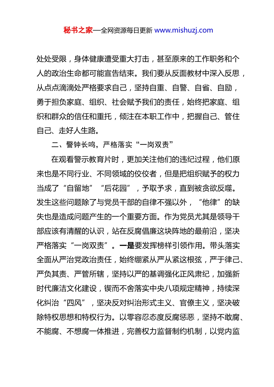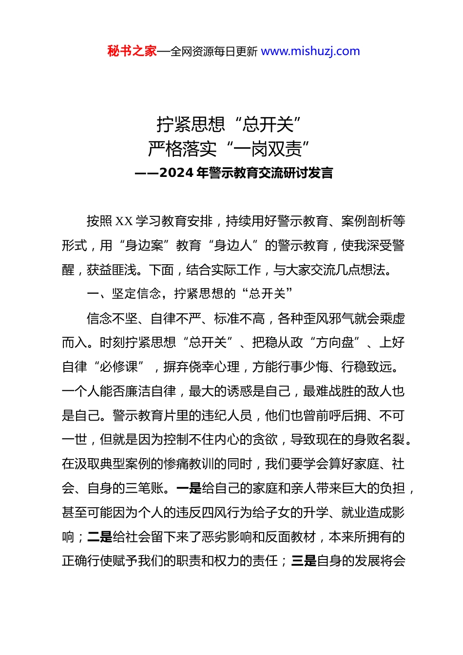 秘书之家—全网资源每日更新 www.mishuzj.com拧紧思想“总开关”严格落实“一岗双责”——2024 年警示教育交流研讨发言按照 XX 学习教育安排,持续用好警示教育、案例剖析等形式,用“身边案”教育“身边人”的警示教育,使我深受警醒,获益匪浅。下面,结合实际工作,与大家交流几点想法。一、坚定信念,拧紧思想的“总开关”信念不坚、自律不严、标准不高,各种歪风邪气就会乘虚而入。时刻拧紧思想“总开关”、把稳从政“方向盘”、上好自律“必修课”,摒弃侥幸心理,方能行事少悔、行稳致远。一个人能否廉洁自律,最大的诱惑是自己,最难战胜的敌人也是自己。警示教育片里的违纪人员,他们也曾前呼后拥、不可一世,但就是因为控制不住内心的贪欲,导致现在的身败名裂。在汲取典型案例的惨痛教训的同时,我们要学会算好家庭、社会、自身的三笔账。一是给自己的家庭和亲人带来巨大的负担,甚至可能因为个人的违反四风行为给子女的升学、就业造成影响;二是给社会留下来了恶劣影响和反面教材,本来所拥有的正确行使赋予我们的职责和权力的责任;三是自身的发展将会秘书之家—全网资源每日更新 www.mishuzj.com处处受限,身体健康遭受重大打击,甚至原来的工作职务和个人的政治生命都可能宣告结束。我们要从反面教材中深入反思,从点点滴滴处严格要求自己,坚持自重、自警、自省、自励,勇于担负家庭、组织、社会赋予我们的责任,始终把家庭、组织和群众的信任和重托,倾注在本职工作中,把握自己、管住自己、走好人生路。二、警钟长鸣,严格落实“一岗双责”在观看警示教育片时,更加关注他们的违纪过程,他们原来也是不同行业、不同领域的佼佼者,但是把组织赋予的权力当成了“自留地”“后花园”,予取予求,直到被贪欲反噬。发生这些问题除了与党员干部的自律不强以外,“他律”的缺失也是造成问题产生的一个重要方面。作为党员尤其是领导干部应该有清醒的认识,站在反腐倡廉这块阵地的最前沿,坚决严格落实“一岗双责”。一是要发挥榜样引领作用。带头落实全面从严治党政治责任,始终绷紧从严从紧这根弦,严于律己、严负其责、严管所辖,坚持以严的基调强化正风肃纪,加强新时代廉洁文化建设,锲而不舍落实中央八项规定精神,持续深化纠治“四风”,坚决反对纠治形式主义、官僚主义,坚决破除特权思想和特权行为。以零容忍态度反腐惩恶,坚持不敢腐、不能腐、不想腐一体推进,完善权力监督制约机制,以党内监秘书之家—全网资源每日更新 www.mishuzj.com督为主导,促进各类监督贯通协调。二是要在党内监督上下功夫。要运用好批评武器,让咬耳扯袖、红脸出汗成为常态,使我们的各级领导干部远离底线。要善于通过业务检查、谈心谈话等途径发现党员干部身上存在的苗头性、倾向性、一般性问题。防止小事拖大、大事拖炸,避免问题小变大、一变多,个人问题变成全家问题,违纪问题演变成违法犯罪问题,发现错误苗头就及时谈话提醒、约谈批评,使党员干部时时处处感受到纪律的严格约束,从而尽量减少犯错的可能。三、担当作为,在分管领域防微杜渐要始终高标准、严要求,保持警醒状态,秉持公正之心,在自己分管的工作领域,落实主体责任,树牢反腐墙,拉紧警戒线,在全面从严治党上取得新成效。一是要加强思想建设。进一步把政治理论学习这个主业和基础继续做实做好,坚持学以致用、以用促学,以学 XXX、学 XXX、学系列讲话为重点,进一步加强党规党纪学习,加强党性修养,切实抓好以案明纪警示教育工作的贯彻落实,全面贯彻执行党在反腐倡廉建设的理论和路线方针政策。二是要发挥好堡垒作用。着力加强党组织建设,在组织领导上下功夫,要统一思想,认清形势,切实增强反腐倡廉建设工作的紧迫感和责任感。明确目标任务,突出工作重点,大力加强党风廉政建设宣传教育活动,确保以案秘书之家—全网资源每日更新 www.mishuzj.com明纪警示教育活动取得成效。三是要加强工作作风建设。特别是要发扬依靠群众联系群众的工作作风,保持党的先进性,作为党员干部,要想群众所想,急群众所急,办群众所需;端正对群众的态度,增进对群众的感情;涉及群众切身利益的决策,要充分听取群...