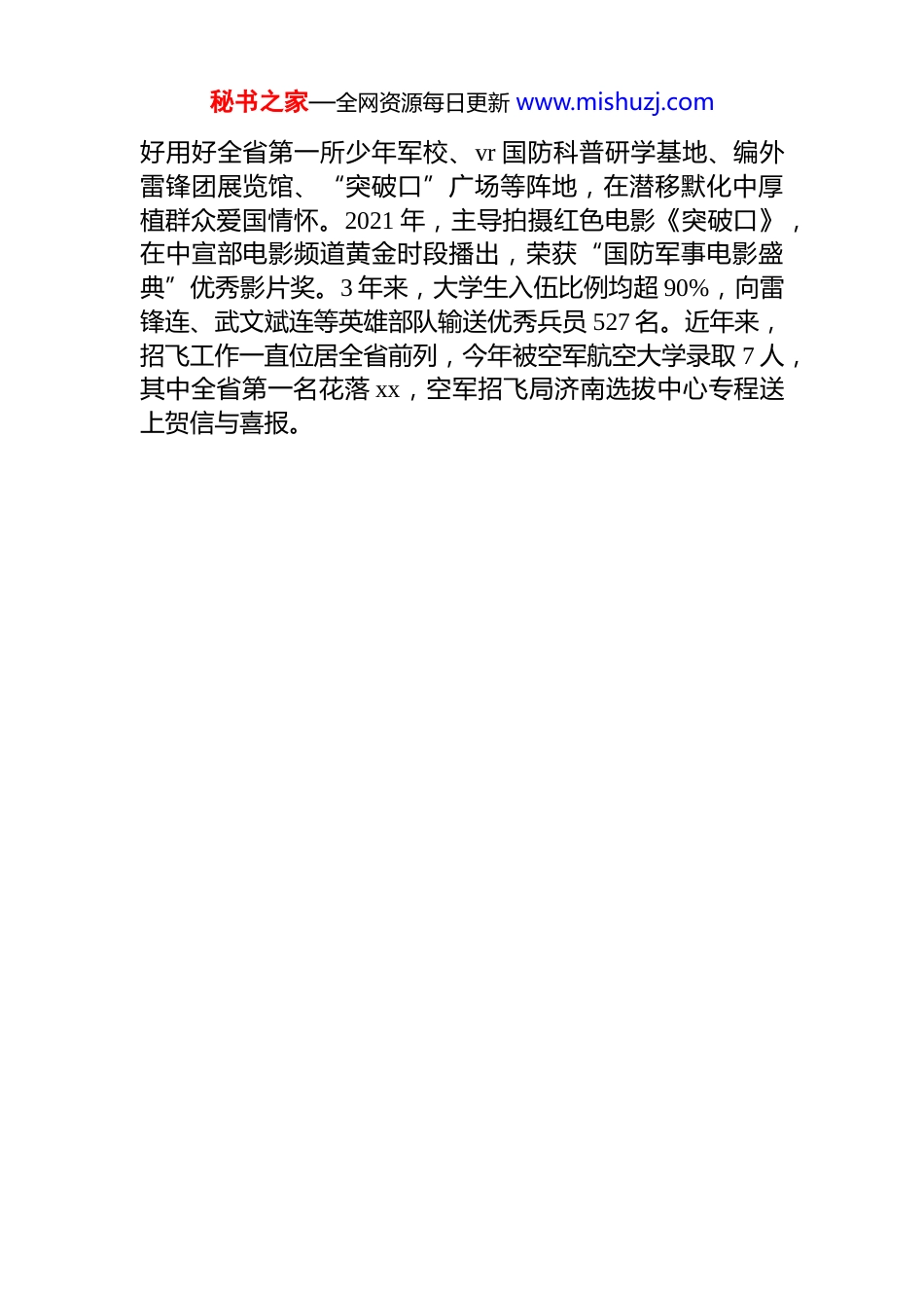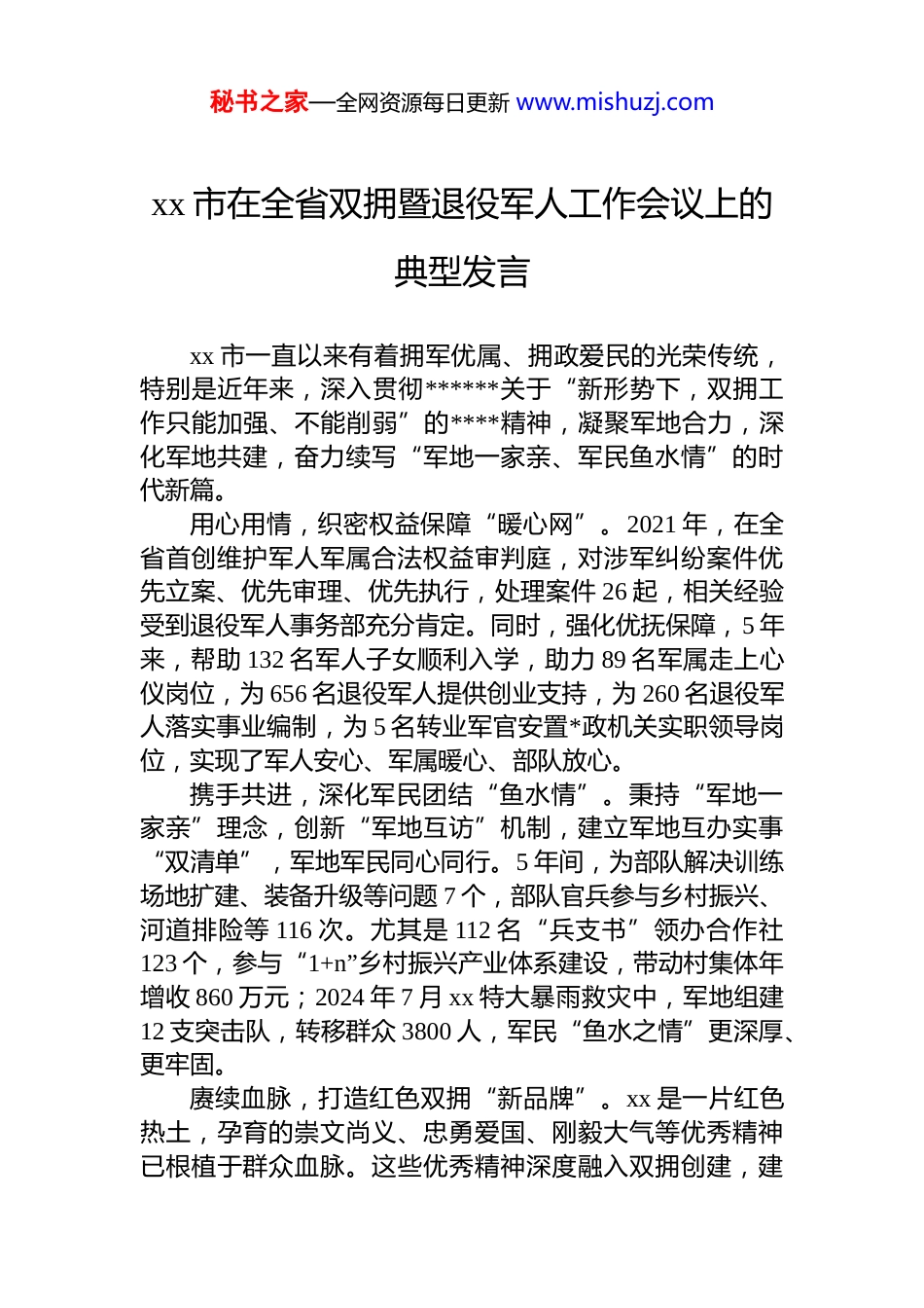 秘书之家—全网资源每日更新 www.mishuzj.comxx 市在全省双拥暨退役军人工作会议上的典型发言xx 市一直以来有着拥军优属、拥政爱民的光荣传统,特别是近年来,深入贯彻******关于“新形势下,双拥工作只能加强、不能削弱”的****精神,凝聚军地合力,深化军地共建,奋力续写“军地一家亲、军民鱼水情”的时代新篇。用心用情,织密权益保障“暖心网”。2021 年,在全省首创维护军人军属合法权益审判庭,对涉军纠纷案件优先立案、优先审理、优先执行,处理案件 26 起,相关经验受到退役军人事务部充分肯定。同时,强化优抚保障,5 年来,帮助 132 名军人子女顺利入学,助力 89 名军属走上心仪岗位,为 656 名退役军人提供创业支持,为 260 名退役军人落实事业编制,为 5 名转业军官安置*政机关实职领导岗位,实现了军人安心、军属暖心、部队放心。携手共进,深化军民团结“鱼水情”。秉持“军地一家亲”理念,创新“军地互访”机制,建立军地互办实事“双清单”,军地军民同心同行。5 年间,为部队解决训练场地扩建、装备升级等问题 7 个,部队官兵参与乡村振兴、河道排险等 116 次。尤其是 112 名“兵支书”领办合作社123 个,参与“1+n”乡村振兴产业体系建设,带动村集体年增收 860 万元;2024 年 7 月 xx 特大暴雨救灾中,军地组建12 支突击队,转移群众 3800 人,军民“鱼水之情”更深厚、更牢固。赓续血脉,打造红色双拥“新品牌”。xx 是一片红色热土,孕育的崇文尚义、忠勇爱国、刚毅大气等优秀精神已根植于群众血脉。这些优秀精神深度融入双拥创建,建秘书之家—全网资源每日更新 www.mishuzj.com好用好全省第一所少年军校、vr 国防科普研学基地、编外雷锋团展览馆、“突破口”广场等阵地,在潜移默化中厚植群众爱国情怀。2021 年,主导拍摄红色电影《突破口》,在中宣部电影频道黄金时段播出,荣获“国防军事电影盛典”优秀影片奖。3 年来,大学生入伍比例均超 90%,向雷锋连、武文斌连等英雄部队输送优秀兵员 527 名。近年来,招飞工作一直位居全省前列,今年被空军航空大学录取 7 人,其中全省第一名花落 xx,空军招飞局济南选拔中心专程送上贺信与喜报。