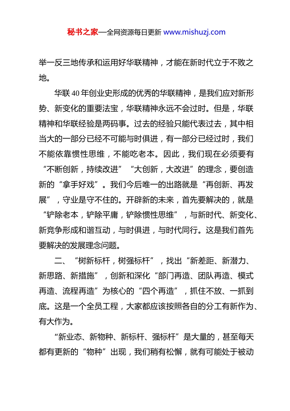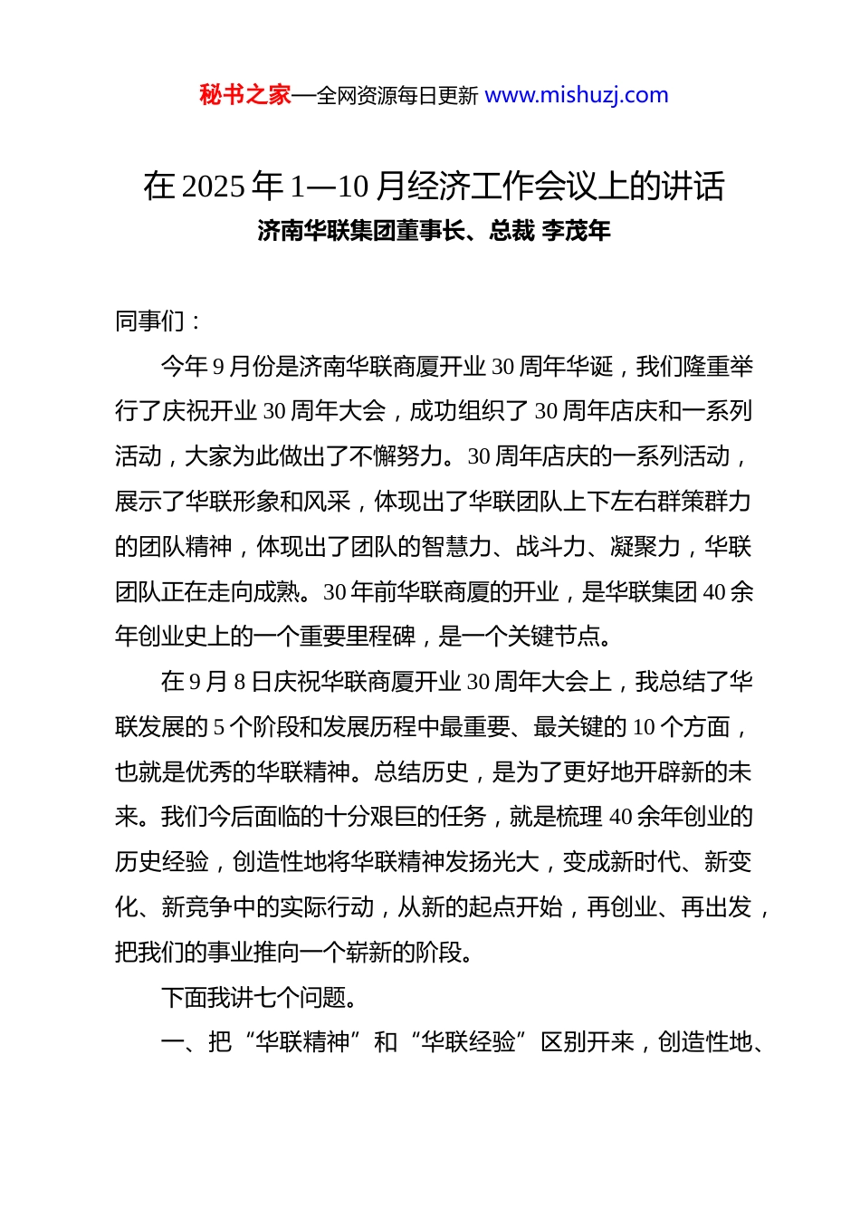 秘书之家—全网资源每日更新 www.mishuzj.com在 2025 年 1—10 月经济工作会议上的讲话济南华联集团董事长、总裁 李茂年同事们:今年 9 月份是济南华联商厦开业 30 周年华诞,我们隆重举行了庆祝开业 30 周年大会,成功组织了 30 周年店庆和一系列活动,大家为此做出了不懈努力。30 周年店庆的一系列活动,展示了华联形象和风采,体现出了华联团队上下左右群策群力的团队精神,体现出了团队的智慧力、战斗力、凝聚力,华联团队正在走向成熟。30 年前华联商厦的开业,是华联集团 40 余年创业史上的一个重要里程碑,是一个关键节点。在 9 月 8 日庆祝华联商厦开业 30 周年大会上,我总结了华联发展的 5 个阶段和发展历程中最重要、最关键的 10 个方面,也就是优秀的华联精神。总结历史,是为了更好地开辟新的未来。我们今后面临的十分艰巨的任务,就是梳理 40 余年创业的历史经验,创造性地将华联精神发扬光大,变成新时代、新变化、新竞争中的实际行动,从新的起点开始,再创业、再出发,把我们的事业推向一个崭新的阶段。下面我讲七个问题。一、把“华联精神”和“华联经验”区别开来,创造性地、秘书之家—全网资源每日更新 www.mishuzj.com举一反三地传承和运用好华联精神,才能在新时代立于不败之地。华联 40 年创业史形成的优秀的华联精神,是我们应对新形势、新变化的重要法宝,华联精神永远不会过时。但是,华联精神和华联经验是两码事。过去的经验只能代表过去,其中相当大的一部分已经不可能与时俱进,有一部分已经过时,我们不能依靠惯性思维,不能吃老本。因此,我们现在必须要有“不断创新,持续改进”“大创新,大改进”的理念,要创造新的“拿手好戏”。我们今后唯一的出路就是“再创新、再发展”,守业是守不住的。开辟新的未来,首先要解决的,就是“铲除老本,铲除平庸,铲除惯性思维”,与新时代、新变化、新竞争形成和谐互动,与时俱进,与时代同行。这是我们首先要解决的发展理念问题。二、“树新标杆,树强标杆”,找出“新差距、新潜力、新思路、新措施”,创新和深化“部门再造、团队再造、模式再造、流程再造”为核心的“四个再造”,抓住不放、一抓到底。这是一个全员工程,大家都应该按照各自的分工有新作为、有大作为。“新业态、新物种、新标杆、强标杆”是大量的,甚至每天都有更新的“物种”出现,我们稍有松懈,就有可能处于被动秘书之家—全网资源每日更新 www.mishuzj.com挨打的境地。必须有更强的“敏捷力、学习力、思考力、创新力”,将“比较经济学”“博弈论”修炼和运用到炉火纯青的程度才能从容应对。“找出差距、找准差距、找关键差距”是提升竞争力的最基础的关键要素。问题是大量的,差距是大量的,潜力是来自方方面面的,关键是找出来、挖出来。用标准化管理的理念,运用科学的、有效的工具和方法找差距、找漏洞、找短板,是一项重要而紧迫的任务。世界级的竞争就是细节的竞争,就是找差距、补短板的竞争,我们都不要“装”了,要瞪起眼来追根究底地找差距、找漏洞、补短板。三、面对新时代、新变化、新竞争,在“树标杆、学标杆、找差距、找漏洞、补短板”的过程中,必须坚定不移地到位解决“学不了、学不好、学不到位”和“赶不上、超不过”的难题。一是从挖掘其中的深层次原因和关键问题短板入手,挖掘其中的“为什么?”,先找准根本的原因,然后才能有“补短板”的有用、管用的办法。这就是“问题追根究底,措施科学到位”的理念。二是在重点问题特别是采购和营运方面的重点问题、关键问题短板上拿出到位的、强有力的措施进行攻关和破局,抓住秘书之家—全网资源每日更新 www.mishuzj.com不放、一抓到底。这里需要特别注意的是,在决策和一系列再决策的过程中,要准确把握“大格局与小格局”“算大账与算小账”“大智慧与小聪明”的辩证关系,不做“因小失大”的蠢事,还是要把握住“吕端大事不糊涂”。三是创新模式和流程的科学设计,坚决淘汰影响目标任务达成的落后模式和过时流程,搬掉“拦路虎”。四是对于“硬骨头”,必须用科学的方法“提不开之壶”,在人、财、物的科学组合方面加大力...