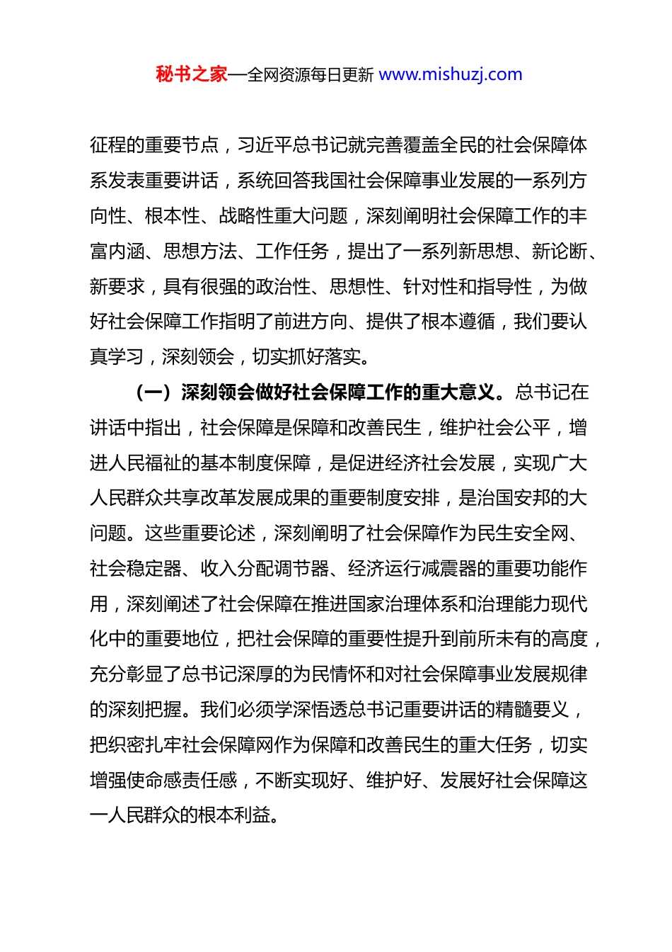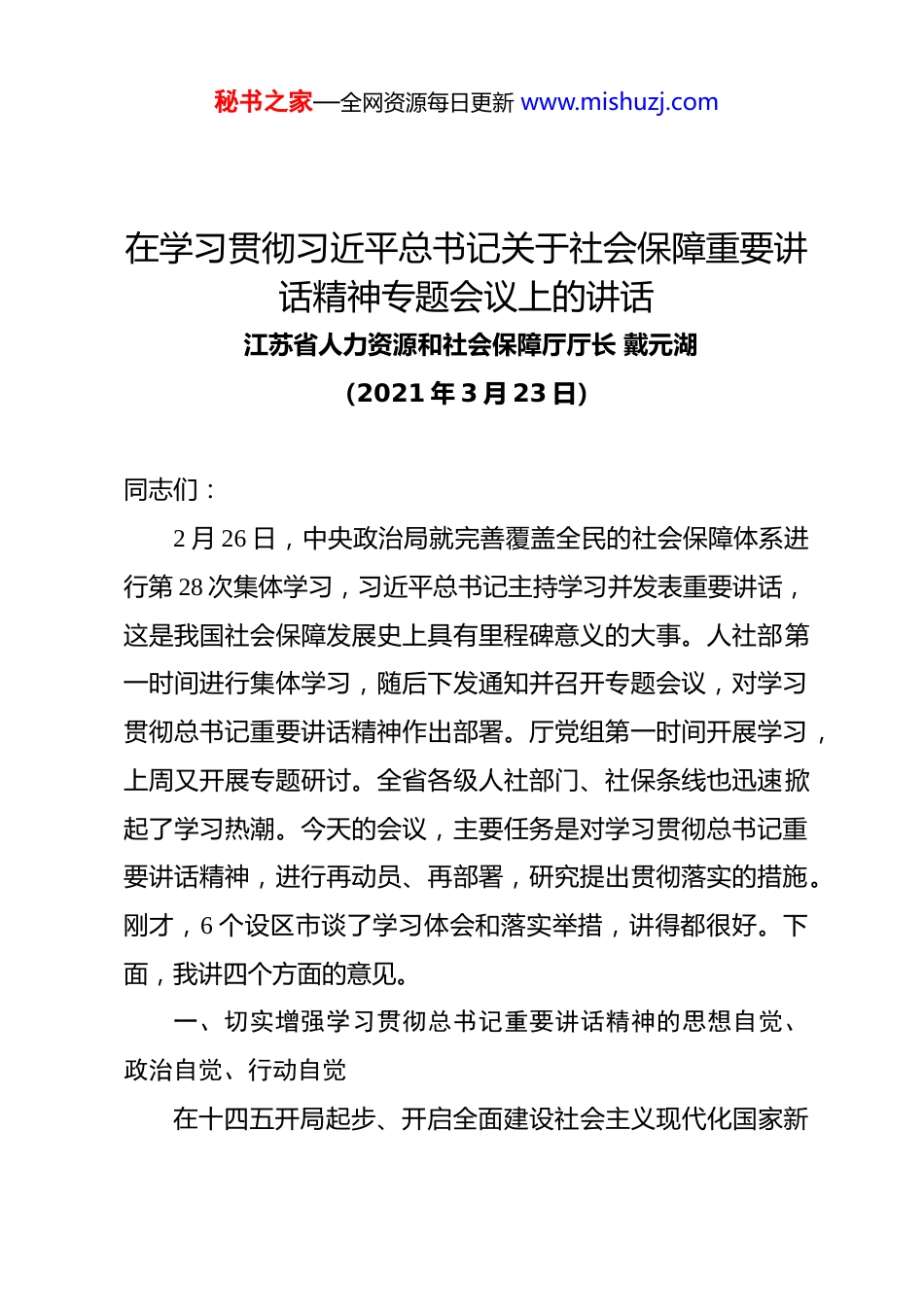 秘书之家—全网资源每日更新 www.mishuzj.com在学习贯彻习近平总书记关于社会保障重要讲话精神专题会议上的讲话 江苏省人力资源和社会保障厅厅长 戴元湖(2021 年 3 月 23 日)同志们:2 月 26 日,中央政治局就完善覆盖全民的社会保障体系进行第 28 次集体学习,习近平总书记主持学习并发表重要讲话,这是我国社会保障发展史上具有里程碑意义的大事。人社部第一时间进行集体学习,随后下发通知并召开专题会议,对学习贯彻总书记重要讲话精神作出部署。厅党组第一时间开展学习,上周又开展专题研讨。全省各级人社部门、社保条线也迅速掀起了学习热潮。今天的会议,主要任务是对学习贯彻总书记重要讲话精神,进行再动员、再部署,研究提出贯彻落实的措施。刚才,6 个设区市谈了学习体会和落实举措,讲得都很好。下面,我讲四个方面的意见。一、切实增强学习贯彻总书记重要讲话精神的思想自觉、政治自觉、行动自觉在十四五开局起步、开启全面建设社会主义现代化国家新秘书之家—全网资源每日更新 www.mishuzj.com征程的重要节点,习近平总书记就完善覆盖全民的社会保障体系发表重要讲话,系统回答我国社会保障事业发展的一系列方向性、根本性、战略性重大问题,深刻阐明社会保障工作的丰富内涵、思想方法、工作任务,提出了一系列新思想、新论断、新要求,具有很强的政治性、思想性、针对性和指导性,为做好社会保障工作指明了前进方向、提供了根本遵循,我们要认真学习,深刻领会,切实抓好落实。(一)深刻领会做好社会保障工作的重大意义。总书记在讲话中指出,社会保障是保障和改善民生,维护社会公平,增进人民福祉的基本制度保障,是促进经济社会发展,实现广大人民群众共享改革发展成果的重要制度安排,是治国安邦的大问题。这些重要论述,深刻阐明了社会保障作为民生安全网、社会稳定器、收入分配调节器、经济运行减震器的重要功能作用,深刻阐述了社会保障在推进国家治理体系和治理能力现代化中的重要地位,把社会保障的重要性提升到前所未有的高度,充分彰显了总书记深厚的为民情怀和对社会保障事业发展规律的深刻把握。我们必须学深悟透总书记重要讲话的精髓要义,把织密扎牢社会保障网作为保障和改善民生的重大任务,切实增强使命感责任感,不断实现好、维护好、发展好社会保障这一人民群众的根本利益。秘书之家—全网资源每日更新 www.mishuzj.com(二)深刻领会社会保障体系建设取得的成就经验。总书记全面阐述了党的十八大以来我国社会保障体系建设的历史性成就,这就是成功建设了具有鲜明中国特色、世界上规模最大、功能完备的社会保障体系,这一巨大成就不仅为人民创造美好生活奠定了坚实基础,为打赢脱贫攻坚战提供了坚强支撑,更为如期全面建成小康社会,实现第一个百年奋斗目标提供了有利条件。总书记同时用“六个坚持”概括了我国社会保障体系建设的宝贵经验,这就是坚持发挥中国共产党领导和社会主义制度的政治优势,坚持人民至上,坚持共同富裕,坚持制度引领,坚持与时俱进,坚持实事求是,既尽力而为,又量力而行。总书记的重要论述,深刻揭示了我国社会保障体系建设取得巨大成功的必然性。我们必须坚定制度自信,增强发展信心,凝聚奋进力量,以更加奋发有为的姿态巩固发展基础,不断开创社会保障工作新局面。(三)深刻领会新阶段社会保障体系建设的目标要求。总书记强调,要加大再分配力度,强化互助共济功能,把更多人纳入社会保障体系,为广大人民群众提供更可靠更充分的保障,不断满足人民群众多层次多样化需求,健全覆盖全民、统筹城乡、公平统一、可持续的多层次社会保障体系,进一步织密社会保障安全网,促进我国社会保障事业高质量发展、可持续发秘书之家—全网资源每日更新 www.mishuzj.com展。总书记同时作出了我国社会保障制度改革已进入系统集成、协同高效阶段的重大判断,提出要坚持系统观念,树立战略眼光,增强风险意识,强化问题导向。这些重要论述,深刻阐明了今后一个时期我国社会保障事业发展的总体目标和原则要求。我们必须主动顺应人民群众对美好生活的新期待,切实找准工作的主攻方向,不断增强工作的前瞻性、主...