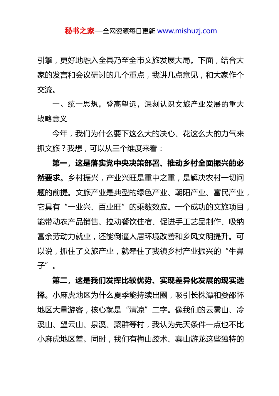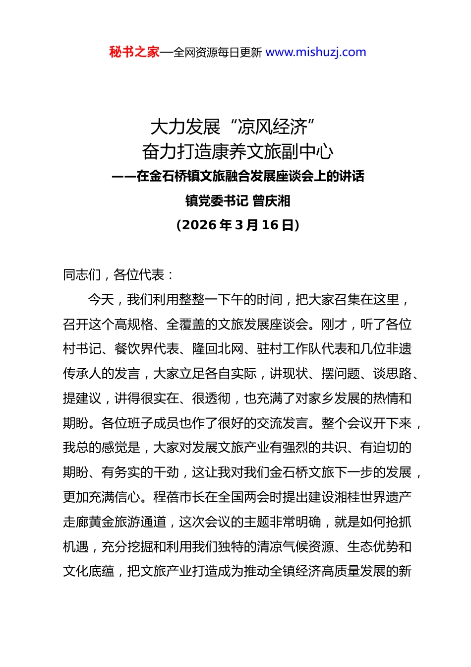 秘书之家—全网资源每日更新 www.mishuzj.com大力发展“凉风经济”奋力打造康养文旅副中心——在金石桥镇文旅融合发展座谈会上的讲话镇党委书记 曾庆湘(2026 年 3 月 16 日)同志们,各位代表:今天,我们利用整整一下午的时间,把大家召集在这里,召开这个高规格、全覆盖的文旅发展座谈会。刚才,听了各位村书记、餐饮界代表、隆回北网、驻村工作队代表和几位非遗传承人的发言,大家立足各自实际,讲现状、摆问题、谈思路、提建议,讲得很实在、很透彻,也充满了对家乡发展的热情和期盼。各位班子成员也作了很好的交流发言。整个会议开下来,我总的感觉是,大家对发展文旅产业有强烈的共识、有迫切的期盼、有务实的干劲,这让我对我们金石桥文旅下一步的发展,更加充满信心。程蓓市长在全国两会时提出建设湘桂世界遗产走廊黄金旅游通道,这次会议的主题非常明确,就是如何抢抓机遇,充分挖掘和利用我们独特的清凉气候资源、生态优势和文化底蕴,把文旅产业打造成为推动全镇经济高质量发展的新秘书之家—全网资源每日更新 www.mishuzj.com引擎,更好地融入全县乃至全市文旅发展大局。下面,结合大家的发言和会议研讨的几个重点,我讲几点意见,和大家作个交流。一、统一思想,登高望远,深刻认识文旅产业发展的重大战略意义今年,我们为什么要下这么大的决心、花这么大的力气来抓文旅?我想,可以从三个维度来看:第一,这是落实党中央决策部署、推动乡村全面振兴的必然要求。乡村振兴,产业兴旺是重中之重,是解决农村一切问题的前提。文旅产业是典型的绿色产业、朝阳产业、富民产业,它具有“一业兴、百业旺”的乘数效应。一个成功的文旅项目,能带动农产品销售、拉动餐饮住宿、促进手工艺品制作、吸纳富余劳动力就业,还能倒逼人居环境改善和乡风文明提升。可以说,抓住了文旅产业,就牵住了我镇乡村产业振兴的“牛鼻子”。第二,这是我们发挥比较优势、实现差异化发展的现实选择。小麻虎地区为什么夏季能持续出圈,吸引长株潭和娄邵怀地区大量游客,核心就是“清凉”二字。像我们的云雾山、冷溪山、望云山、泉溪、聚群等村,我认为先天条件一点也不比小麻虎地区差。同时,我们有梅山跤术、寨山游龙这些独特的秘书之家—全网资源每日更新 www.mishuzj.com省级非物质文化遗产,有深厚的农耕文化和乡土记忆,作为隆回县域副中心,我们不仅拥有相对完善的商业配套,而且交通区位优势明显,尤其是新新高速开通后,极大地降低了长株潭和娄邵怀等地游客来金的时间成本和出行成本。这些要素叠加在一起,构成了我们发展文旅产业的独特优势,是别人想学学不来、想搬搬不走的“金饭碗”。守着这么好的资源,如果不把它用好用活,让老百姓守着青山绿水过穷日子,那就是我们这一班人的失职,就是对历史的不负责任。第三,这是回应人民群众新期待、推动镇域经济实现高质量发展的迫切需要。我们的老百姓盼什么?盼收入更高、盼生活更好、盼家乡更美、盼在家门口就能有活干、有钱赚。发展文旅产业,能直接带来人流、资金流、信息流,能创造大量就业岗位和创业机会,能让老百姓的土特产、老手艺变成钱。同时,发展文旅必然会提升我们城镇管理水平,进一步完善基础设施,改善人居环境,把我们共同的家园建设得更加宜居、宜业、宜游,让老百姓有实实在在的获得感、幸福感。二、正视差距,深挖根源,清醒认识当前面临的突出短板和严峻挑战刚才大家的发言,既盘点了家底,也剖析了问题,这很好说明大家是动了脑筋、想了实事的。我们必须清醒地认识到,秘书之家—全网资源每日更新 www.mishuzj.com虽然我们资源禀赋不错,但要把资源优势真正转化为产业优势、经济优势、发展胜势,还有很长的路要走,还有很多硬骨头要啃。综合大家的意见和我平时调研了解的情况,梳理了一下,当前我们主要面临以下几个方面的堵点难点:一是资源整合“碎片化”,有“星星”没“月亮”。我们每个村可能都有一些不错的资源点:这里有片古树林,那里有股山泉水,这边有个老故事,那边有个旧民居。但是,这些资源基本上是“各村自扫门前雪”,处于各自为战、单打独斗的状态。缺乏统一的规划引领、统一的品牌包装...