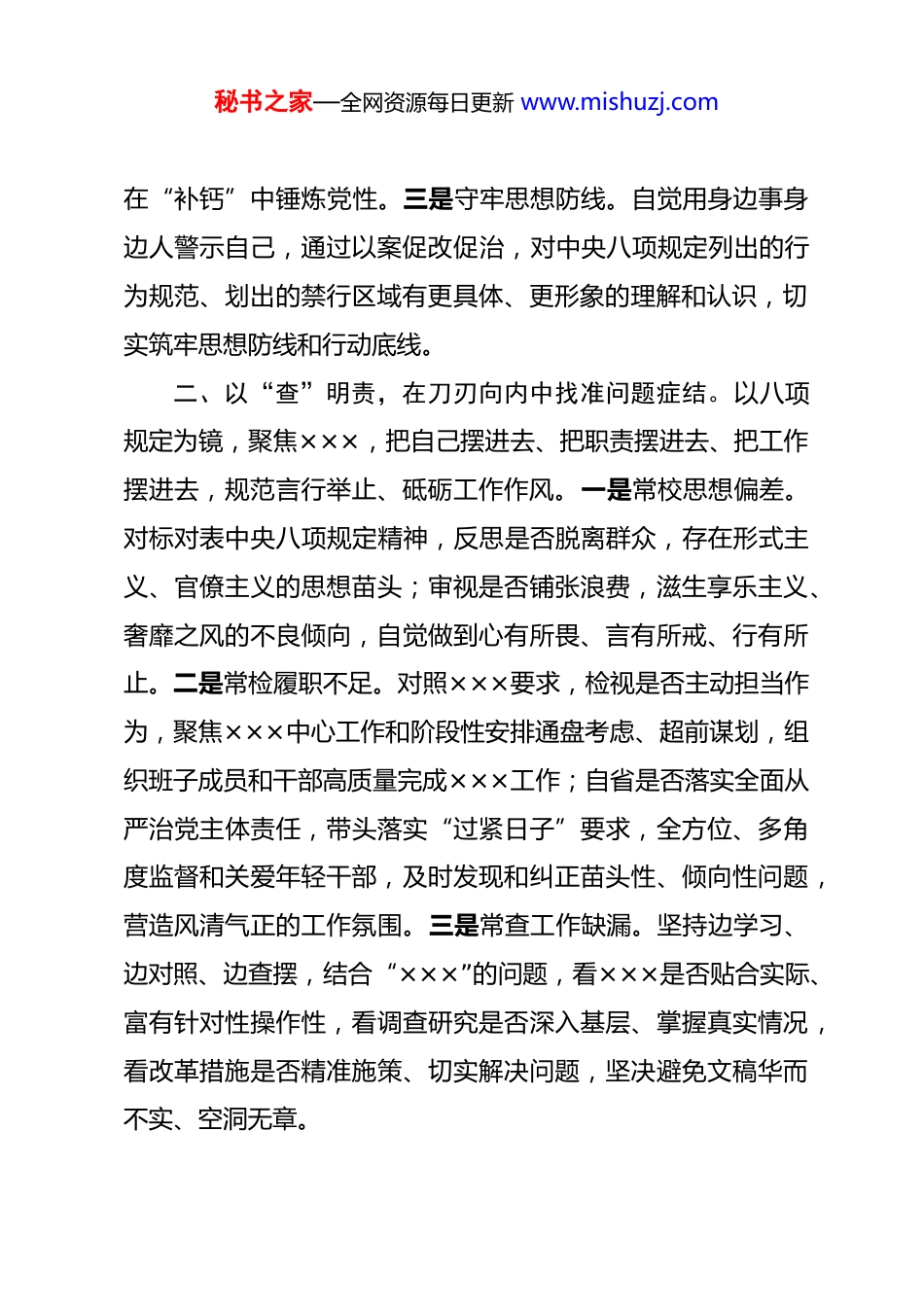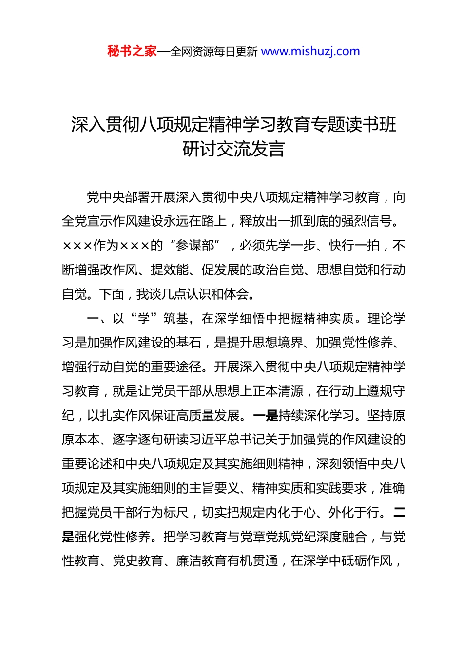 秘书之家—全网资源每日更新 www.mishuzj.com深入贯彻八项规定精神学习教育专题读书班研讨交流发言党中央部署开展深入贯彻中央八项规定精神学习教育,向全党宣示作风建设永远在路上,释放出一抓到底的强烈信号。×××作为×××的“参谋部”,必须先学一步、快行一拍,不断增强改作风、提效能、促发展的政治自觉、思想自觉和行动自觉。下面,我谈几点认识和体会。一、以“学”筑基,在深学细悟中把握精神实质。理论学习是加强作风建设的基石,是提升思想境界、加强党性修养、增强行动自觉的重要途径。开展深入贯彻中央八项规定精神学习教育,就是让党员干部从思想上正本清源,在行动上遵规守纪,以扎实作风保证高质量发展。一是持续深化学习。坚持原原本本、逐字逐句研读习近平总书记关于加强党的作风建设的重要论述和中央八项规定及其实施细则精神,深刻领悟中央八项规定及其实施细则的主旨要义、精神实质和实践要求,准确把握党员干部行为标尺,切实把规定内化于心、外化于行。二是强化党性修养。把学习教育与党章党规党纪深度融合,与党性教育、党史教育、廉洁教育有机贯通,在深学中砥砺作风,秘书之家—全网资源每日更新 www.mishuzj.com在“补钙”中锤炼党性。三是守牢思想防线。自觉用身边事身边人警示自己,通过以案促改促治,对中央八项规定列出的行为规范、划出的禁行区域有更具体、更形象的理解和认识,切实筑牢思想防线和行动底线。二、以“查”明责,在刀刃向内中找准问题症结。以八项规定为镜,聚焦×××,把自己摆进去、把职责摆进去、把工作摆进去,规范言行举止、砥砺工作作风。一是常校思想偏差。对标对表中央八项规定精神,反思是否脱离群众,存在形式主义、官僚主义的思想苗头;审视是否铺张浪费,滋生享乐主义、奢靡之风的不良倾向,自觉做到心有所畏、言有所戒、行有所止。二是常检履职不足。对照×××要求,检视是否主动担当作为,聚焦×××中心工作和阶段性安排通盘考虑、超前谋划,组织班子成员和干部高质量完成×××工作;自省是否落实全面从严治党主体责任,带头落实“过紧日子”要求,全方位、多角度监督和关爱年轻干部,及时发现和纠正苗头性、倾向性问题,营造风清气正的工作氛围。三是常查工作缺漏。坚持边学习、边对照、边查摆,结合“×××”的问题,看×××是否贴合实际、富有针对性操作性,看调查研究是否深入基层、掌握真实情况,看改革措施是否精准施策、切实解决问题,坚决避免文稿华而不实、空洞无章。秘书之家—全网资源每日更新 www.mishuzj.com三、以“改”促治,在真抓实改中推动标本兼治。学习教育开展得好不好,主要看整改问题彻不彻底、到不到位。一是自觉带头改。班子成员要发挥带头作用,紧扣“四风”问题精准靶向纠治,以身作则严守廉洁底线,要求他人做到的自己必先践行,禁止他人做的自己坚决杜绝,以实际行动为全体党员干部立标杆、作表率,带动形成以上率下、上行下效的良好整改氛围。二是督促深入改。聚焦年轻干部易发多发作风问题,督促干部对照查摆出的问题,深刻剖析根源、制定整改措施,立查立改、即知即改。特别是要干部既要在“八小时内”保持良好作风,也要管住“八小时外”的生活圈、社交圈、朋友圈,把更多的闲暇时间用在读书学习上,涵养静气、正气、浩然之气。三是完善制度改。针对本单位×××等工作运行中存在的问题,认真落实中央和省市委相关规定要求,加快补齐制度短板,确保各项工作有章可循、有规可依,推动作风建设常态长效。四、以“行”见效,在服务大局中彰显担当作为。推动学习教育走深走实,关键是把学习成效转化为真抓实干的具体行动。一是聚焦“精炼管用”抓好×××。准确把握中央决策部署和省委工作安排,按照市委工作要求,深入思考全市高质量发展中存在的问题,扎实做好×××工作,确保各类×××能够真实反映情况、解决实际问题。坚持“短实新”导向,突出核心秘书之家—全网资源每日更新 www.mishuzj.com要点,注重总结提炼,去除冗余信息,确保×××简洁精炼,避免空乏空洞。二是聚焦“解决问题”抓好×××。认真落实“×××”制度,围绕起草×××建议和构建良好×××等...