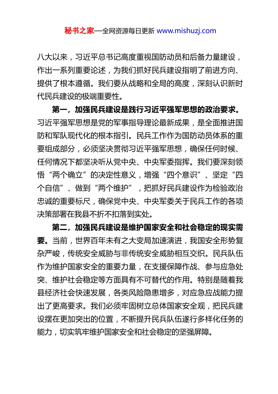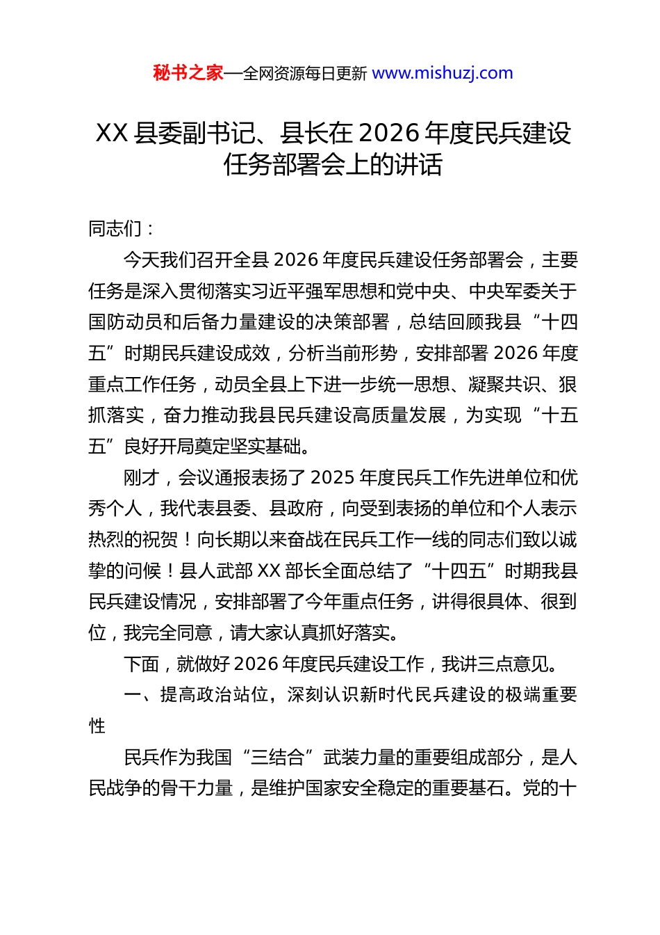 秘书之家—全网资源每日更新 www.mishuzj.comXX 县委副书记、县长在 2026 年度民兵建设任务部署会上的讲话同志们:今天我们召开全县 2026 年度民兵建设任务部署会,主要任务是深入贯彻落实习近平强军思想和党中央、中央军委关于国防动员和后备力量建设的决策部署,总结回顾我县“十四五”时期民兵建设成效,分析当前形势,安排部署 2026 年度重点工作任务,动员全县上下进一步统一思想、凝聚共识、狠抓落实,奋力推动我县民兵建设高质量发展,为实现“十五五”良好开局奠定坚实基础。刚才,会议通报表扬了 2025 年度民兵工作先进单位和优秀个人,我代表县委、县政府,向受到表扬的单位和个人表示热烈的祝贺!向长期以来奋战在民兵工作一线的同志们致以诚挚的问候!县人武部 XX 部长全面总结了“十四五”时期我县民兵建设情况,安排部署了今年重点任务,讲得很具体、很到位,我完全同意,请大家认真抓好落实。下面,就做好 2026 年度民兵建设工作,我讲三点意见。一、提高政治站位,深刻认识新时代民兵建设的极端重要性民兵作为我国“三结合”武装力量的重要组成部分,是人民战争的骨干力量,是维护国家安全稳定的重要基石。党的十秘书之家—全网资源每日更新 www.mishuzj.com八大以来,习近平总书记高度重视国防动员和后备力量建设,作出一系列重要论述,为我们抓好民兵建设指明了前进方向、提供了根本遵循。我们要从战略和全局的高度,深刻认识新时代民兵建设的极端重要性。第一,加强民兵建设是践行习近平强军思想的政治要求。习近平强军思想是党的军事指导理论最新成果,是全面推进国防和军队现代化的根本指引。民兵工作作为国防动员体系的重要组成部分,必须坚决贯彻习近平强军思想,确保任何时候、任何情况下都坚决听从党中央、中央军委指挥。我们要深刻领悟“两个确立”的决定性意义,增强“四个意识”、坚定“四个自信”、做到“两个维护”,把抓好民兵建设作为检验政治忠诚的重要标尺,确保党中央、中央军委关于民兵工作的各项决策部署在我县不折不扣落到实处。第二,加强民兵建设是维护国家安全和社会稳定的现实需要。当前,世界百年未有之大变局加速演进,我国安全形势复杂严峻,传统安全威胁与非传统安全威胁相互交织。民兵队伍作为维护国家安全的重要力量,在支援保障作战、参与应急处突、维护社会稳定等方面具有不可替代的作用。特别是随着我县经济社会快速发展,各类风险隐患增多,对应急应战能力提出了更高要求。我们必须牢固树立总体国家安全观,把民兵建设摆在更加突出的位置,不断提升民兵队伍遂行多样化任务的能力,切实筑牢维护国家安全和社会稳定的坚强屏障。秘书之家—全网资源每日更新 www.mishuzj.com第三,加强民兵建设是推动国防动员和后备力量建设高质量发展的必然选择。“十四五”以来,我县民兵建设取得了显著成效,组织体系更加健全,队伍结构不断优化,训练演练扎实推进,动员能力持续提升。但也要清醒看到,对标新时代强军目标,对照上级部署要求,我县民兵建设还存在一些短板和不足,比如:部分单位重视程度不够、编组质量有待提高、训练实效仍需加强、保障机制不够完善等。当前,我们正处在“十五五”后备力量建设开局起步的关键时期,必须进一步增强责任感和紧迫感,以更高标准、更严要求、更实举措,推动民兵建设实现新的更大突破。二、聚焦备战打仗,全面提升民兵队伍建设质量和水平2026 年是“十五五”规划的开局之年,也是推进国防动员体制改革深化、民兵建设转型升级的关键之年。我们要紧紧围绕党在新时代的强军目标,坚持战斗力这个唯一的根本的标准,着力在优化结构、强化训练、建强队伍、完善保障上下功夫,不断提升民兵队伍应战应急能力。一要优化力量结构,建强民兵队伍。要紧扣应战应急需求,科学制定民兵组织建设规划,进一步优化民兵队伍结构布局。要突出抓好基干民兵队伍建设,严格按照上级下达的编组任务,精准对接潜力资源,优先编组退役军人、专业技术人员、党员骨干,确保队伍结构合理、专业对口、人员在位。要巩固拓展普通民兵队伍建设,结合基层社会治理,依托村(社区)党组秘书之家—全网资源每日更新...