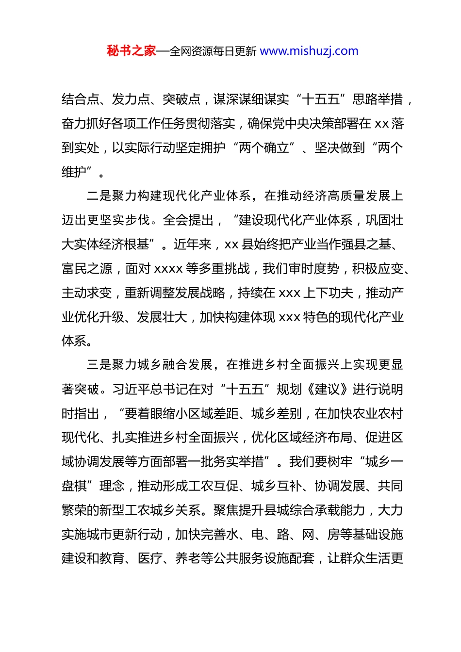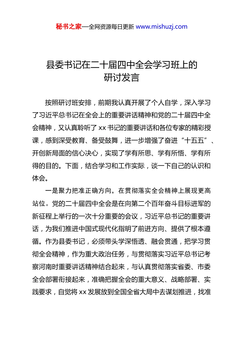秘书之家—全网资源每日更新 www.mishuzj.com县委书记在二十届四中全会学习班上的研讨发言按照研讨班安排,前期我认真开展了个人自学,深入学习了习近平总书记在全会上的重要讲话精神和党的二十届四中全会精神,又认真聆听了 xx 书记的重要讲话和各位专家的精彩授课,感到深受教育、备受鼓舞,进一步增强了奋进“十五五”、开创新局面的信心决心,实现了学有所思、学有所悟、学有所得的目的。下面,结合学习和工作实际,谈一下自己的认识和体会。一是聚力把准正确方向,在贯彻落实全会精神上展现更高站位。党的二十届四中全会是在向第二个百年奋斗目标进军的新征程上举行的一次十分重要的会议,习近平总书记的重要讲话,为我们推进中国式现代化指明了前进方向、提供了根本遵循。作为县委书记,必须带头学深悟透、融会贯通,把学习贯彻全会精神,作为重大政治任务,与贯彻落实习近平总书记考察河南时重要讲话精神结合起来,与认真贯彻落实省委、市委全会部署衔接起来,准确把握全会的重大意义、战略部署、实践要求,自觉将 xx 发展放到全国全省大局中去谋划推进,找准秘书之家—全网资源每日更新 www.mishuzj.com结合点、发力点、突破点,谋深谋细谋实“十五五”思路举措,奋力抓好各项工作任务贯彻落实,确保党中央决策部署在 xx 落到实处,以实际行动坚定拥护“两个确立”、坚决做到“两个维护”。二是聚力构建现代化产业体系,在推动经济高质量发展上迈出更坚实步伐。全会提出,“建设现代化产业体系,巩固壮大实体经济根基”。近年来,xx 县始终把产业当作强县之基、富民之源,面对 xxxx 等多重挑战,我们审时度势,积极应变、主动求变,重新调整发展战略,持续在 xxx 上下功夫,推动产业优化升级、发展壮大,加快构建体现 xxx 特色的现代化产业体系。三是聚力城乡融合发展,在推进乡村全面振兴上实现更显著突破。习近平总书记在对“十五五”规划《建议》进行说明时指出,“要着眼缩小区域差距、城乡差别,在加快农业农村现代化、扎实推进乡村全面振兴,优化区域经济布局、促进区域协调发展等方面部署一批务实举措”。我们要树牢“城乡一盘棋”理念,推动形成工农互促、城乡互补、协调发展、共同繁荣的新型工农城乡关系。聚焦提升县城综合承载能力,大力实施城市更新行动,加快完善水、电、路、网、房等基础设施建设和教育、医疗、养老等公共服务设施配套,让群众生活更秘书之家—全网资源每日更新 www.mishuzj.com加便利、更加舒适;加强城市精细化管理,下足“绣花功夫”,解决市容环境、街面秩序等治理难题,着力打造宜居、韧性、智慧县城。按照全会提出的“提升农业综合生产能力和质量效益,推进宜居宜业和美乡村建设,提高强农惠农富农政策效能”要求,学习运用“千万工程”经验,以宜居宜业和美乡村建设为抓手,统筹推进乡村产业发展、乡村建设、乡村治理。坚决扛稳粮食安全政治责任,有序推进高标准农田建设,稳步提升粮食综合生产能力。因地制宜发展乡村特色产业,大力发展农产品精深加工,培育壮大新型农业经营主体,推动农村一二三产业融合发展;常态化开展人居环境整治,扎实推进垃圾处理、污水治理、村容提升等重点任务,持续提升乡村“颜值”“气质”。持续巩固拓展脱贫攻坚成果,建立完善常态化防止返贫致贫机制,健全常态化帮扶政策体系,坚决守牢不发生规模性返贫致贫底线。四是聚力增进民生福祉,在提升人民生活品质上拿出更务实举措。全会将“坚持人民至上”贯穿始终,对在发展中保障和改善民生、扎实推进共同富裕作出具体安排。我将始终把实现好、维护好、发展好最广大人民根本利益作为一切工作的出发点和落脚点,坚持尽力而为、量力而行,加强普惠性、基础性、兜底性民生建设,集中力量办好一批群众可感可及的实事。秘书之家—全网资源每日更新 www.mishuzj.com重点围绕就业、教育、医疗、社保等群众关切,持续加大投入力度,精准对接群众需求,落实落细就业优先政策,推动城乡教育优质均衡发展,深化紧密型县域医共体建设,健全分层分类的社会救助体系,切实兜好民生保障底线,不断增强群众的获得感、幸福感、满意度。坚持和发展新时代“...