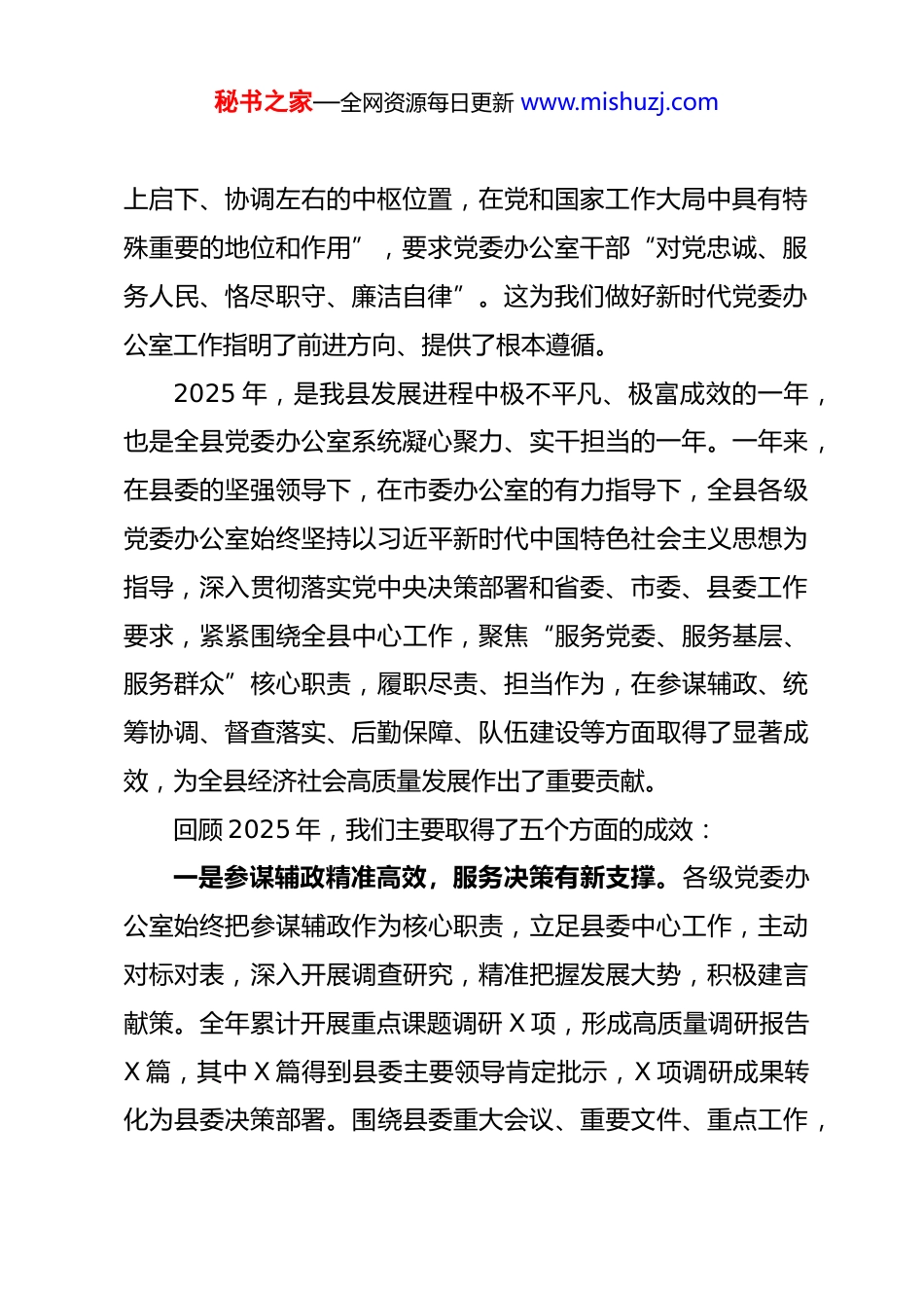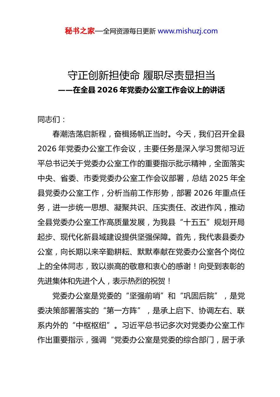 秘书之家—全网资源每日更新 www.mishuzj.com守正创新担使命 履职尽责显担当——在全县 2026 年党委办公室工作会议上的讲话同志们:春潮浩荡启新程,奋楫扬帆正当时。今天,我们召开全县2026 年党委办公室工作会议,主要任务是深入学习贯彻习近平总书记关于党委办公室工作的重要指示批示精神,全面落实中央、省委、市委党委办公室工作会议部署,总结 2025 年全县党委办公室工作,分析当前工作形势,部署 2026 年重点任务,进一步统一思想、凝聚共识、压实责任、改进作风,推动全县党委办公室工作高质量发展,为我县“十五五”规划开局起步、现代化新县域建设提供坚强保障。首先,我代表县委办公室,向长期以来辛勤耕耘、默默奉献在党委办公室各个岗位上的全体同志,致以崇高的敬意和衷心的感谢!向受到表彰的先进集体和先进个人,表示热烈的祝贺!党委办公室是党委的“坚强前哨”和“巩固后院”,是党委决策部署落实的“第一方阵”,是承上启下、协调左右、联系内外的“中枢枢纽”。习近平总书记多次对党委办公室工作作出重要指示,强调“党委办公室是党委的综合部门,居于承秘书之家—全网资源每日更新 www.mishuzj.com上启下、协调左右的中枢位置,在党和国家工作大局中具有特殊重要的地位和作用”,要求党委办公室干部“对党忠诚、服务人民、恪尽职守、廉洁自律”。这为我们做好新时代党委办公室工作指明了前进方向、提供了根本遵循。2025 年,是我县发展进程中极不平凡、极富成效的一年,也是全县党委办公室系统凝心聚力、实干担当的一年。一年来,在县委的坚强领导下,在市委办公室的有力指导下,全县各级党委办公室始终坚持以习近平新时代中国特色社会主义思想为指导,深入贯彻落实党中央决策部署和省委、市委、县委工作要求,紧紧围绕全县中心工作,聚焦“服务党委、服务基层、服务群众”核心职责,履职尽责、担当作为,在参谋辅政、统筹协调、督查落实、后勤保障、队伍建设等方面取得了显著成效,为全县经济社会高质量发展作出了重要贡献。回顾 2025 年,我们主要取得了五个方面的成效:一是参谋辅政精准高效,服务决策有新支撑。各级党委办公室始终把参谋辅政作为核心职责,立足县委中心工作,主动对标对表,深入开展调查研究,精准把握发展大势,积极建言献策。全年累计开展重点课题调研 X 项,形成高质量调研报告X 篇,其中 X 篇得到县委主要领导肯定批示,X 项调研成果转化为县委决策部署。围绕县委重大会议、重要文件、重点工作,秘书之家—全网资源每日更新 www.mishuzj.com精准起草各类文稿 X 篇、讲话材料 X 份,高质量完成县委全会、县委常委会会议等重要会议的筹备服务工作,确保县委决策部署科学严谨、务实可行。加强信息报送工作,全年向上级党委办公室报送各类信息 X 条,其中 X 条被省级以上采用,为上级党委和县委科学决策提供了及时、准确、全面的信息支撑,信息工作排名位居全市前列。二是统筹协调有力有序,推动落实有新成效。始终坚持“统揽全局、协调各方”的工作原则,主动担当协调职责,着力破解工作推进中的堵点难点问题,推动县委各项决策部署落地见效。加强与人大办公室、政府办公室、政协办公室的协同配合,健全完善联席会议、信息共享、工作联动等机制,形成了上下同心、左右协同、齐抓共管的工作格局。围绕县委重点工作、重大项目、重要任务,加强与各部门、各乡镇的沟通协调,全程跟踪督办,及时协调解决项目推进、民生保障、安全生产等方面的问题 X 个,推动各项工作有序推进。全年统筹协调各类会议活动 X 场次,做到周密部署、规范有序、万无一失,确保县委各项工作高效运转。三是督查落实刚性有力,政令畅通有新保障。坚持把督查落实作为推动工作的重要抓手,聚焦县委决策部署和群众急难愁盼问题,强化督查督办,狠抓工作落实。健全督查工作机制,秘书之家—全网资源每日更新 www.mishuzj.com完善督查清单、台账管理、销号落实等制度,采取“四不两直”、明察暗访、专项督查等方式,对县委全会、县委常委会会议确定的重点工作、重大项目开展专项督查 X 次,下发督查通报 X 期,督促整改问题 X 项...