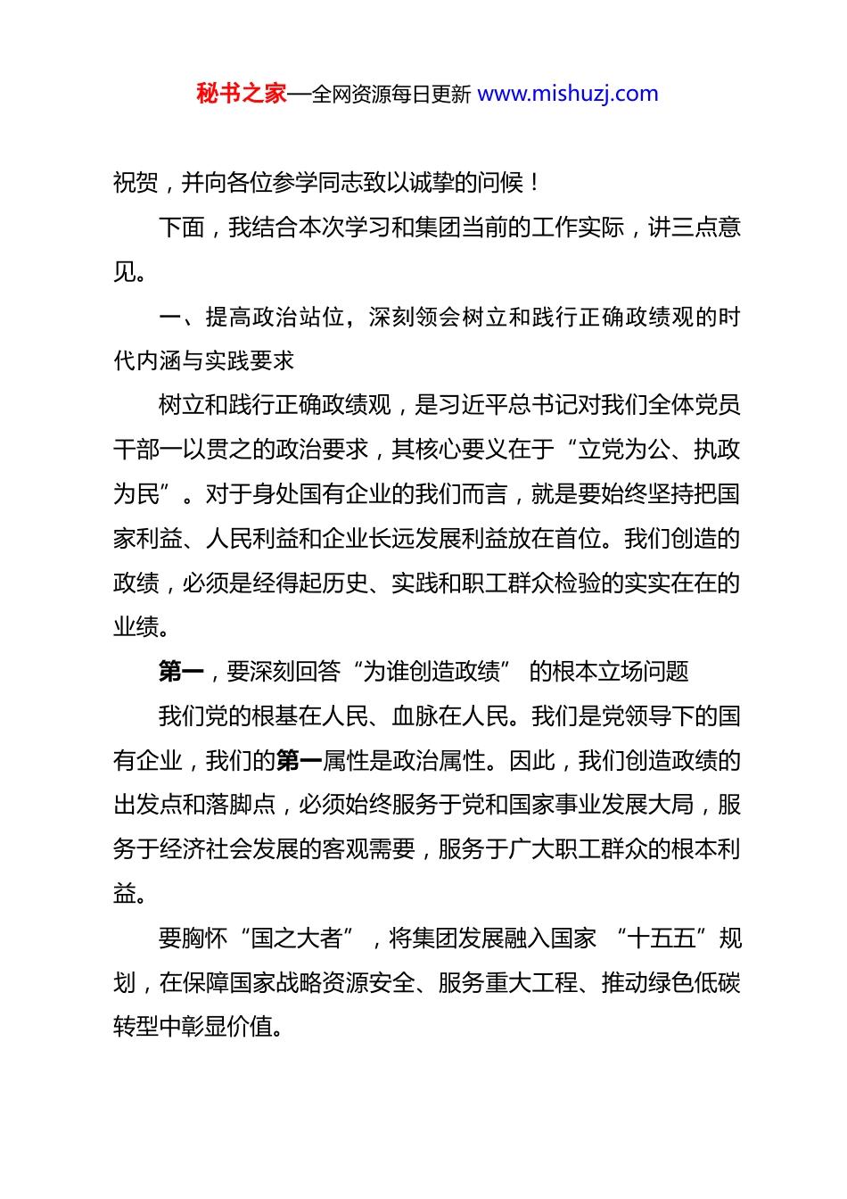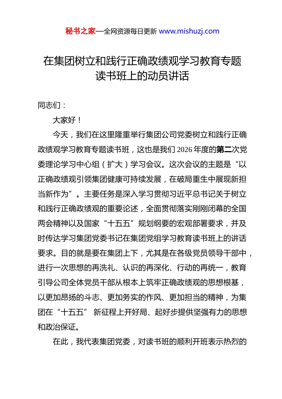秘书之家—全网资源每日更新 www.mishuzj.com在集团树立和践行正确政绩观学习教育专题读书班上的动员讲话 同志们:大家好!今天,我们在这里隆重举行集团公司党委树立和践行正确政绩观学习教育专题读书班,这也是我们 2026 年度的第二次党委理论学习中心组(扩大)学习会议。这次会议的主题是“以正确政绩观引领集团健康可持续发展,在破局重生中展现新担当新作为”。主要任务是深入学习贯彻习近平总书记关于树立和践行正确政绩观的重要论述,全面贯彻落实刚刚闭幕的全国两会精神以及国家“十五五”规划纲要的宏观部署要求,并及时传达学习集团党委书记在集团党组学习教育读书班上的讲话要求。目的就是要在集团上下,尤其是在各级党员领导干部中,进行一次思想的再洗礼、认识的再深化、行动的再统一,教育引导公司全体党员干部从根本上筑牢正确政绩观的思想根基,以更加昂扬的斗志、更加务实的作风、更加担当的精神,为集团在“十五五” 新征程上开好局、起好步提供坚强有力的思想和政治保证。在此,我代表集团党委,对读书班的顺利开班表示热烈的秘书之家—全网资源每日更新 www.mishuzj.com祝贺,并向各位参学同志致以诚挚的问候!下面,我结合本次学习和集团当前的工作实际,讲三点意见。一、提高政治站位,深刻领会树立和践行正确政绩观的时代内涵与实践要求树立和践行正确政绩观,是习近平总书记对我们全体党员干部一以贯之的政治要求,其核心要义在于“立党为公、执政为民”。对于身处国有企业的我们而言,就是要始终坚持把国家利益、人民利益和企业长远发展利益放在首位。我们创造的政绩,必须是经得起历史、实践和职工群众检验的实实在在的业绩。第一,要深刻回答“为谁创造政绩” 的根本立场问题我们党的根基在人民、血脉在人民。我们是党领导下的国有企业,我们的第一属性是政治属性。因此,我们创造政绩的出发点和落脚点,必须始终服务于党和国家事业发展大局,服务于经济社会发展的客观需要,服务于广大职工群众的根本利益。要胸怀“国之大者”,将集团发展融入国家 “十五五”规划,在保障国家战略资源安全、服务重大工程、推动绿色低碳转型中彰显价值。秘书之家—全网资源每日更新 www.mishuzj.com要心系“企之大者”,任何脱离职工群众根本利益的 “政绩”都是站不住脚的,我们要创造的政绩,必须是能增强企业核心竞争力、提升职工获得感、幸福感、安全感的实绩。第二,要深刻回答“创造什么样的政绩” 的核心标准问题新时代的发展,不再是简单的规模扩张,而是更高质量、更有效率、更可持续的发展。我们追求的政绩,必须是完整、准确、全面贯彻新发展理念的政绩。要创造体现新发展理念的政绩:推动产业向绿色、数字、高端化转型,布局战略性新兴产业,形成新的增长极。要创造打基础利长远的政绩:涵养“功成不必在我” 的境界,多做地质研究、人才培养、制度完善等潜绩工作,筑牢企业发展根基。要创造经得起检验的政绩:坚决反对形式主义、官僚主义杜绝“形象工程”“数据造假”,所有业绩必须实打实、可量化,经得起实践、人民和历史的检验。第三,要深刻回答“怎样创造政绩” 的方法路径问题正确的政绩观最终要落实到科学决策和务实行动上。要坚持科学决策:重大决策前必须深入调研、风险评估,杜绝“拍脑袋”“一言堂”。要坚持真抓实干:发扬钉钉子精神,一锤接着一锤敲,确秘书之家—全网资源每日更新 www.mishuzj.com保各项决策部署落地见效。要坚持底线思维:把安全、环保、合规放在首位,没有安全保障的发展是不可持续的。二、聚焦核心任务,以正确政绩观引领集团“提质增效攻坚年” 取得实效思想是行动的先导。今年集团将 2026 年确定为“提质增效攻坚年”,这是检验我们政绩观正确与否的最直接战场。各单位、各部门要将正确政绩观全面融入年度工作全过程。第一,聚焦产业转型,在服务国家战略中重塑发展新优势这是我们破局重生的根本出路,也是最大的政绩。要以“158”发展战略为总牵引,优化产业布局,巩固传统优势,向绿色、智能、高端化转型。要以科技创新为核心驱动,加大研发投入,攻克关键核心技术,加快数字化转型,提升核心竞...