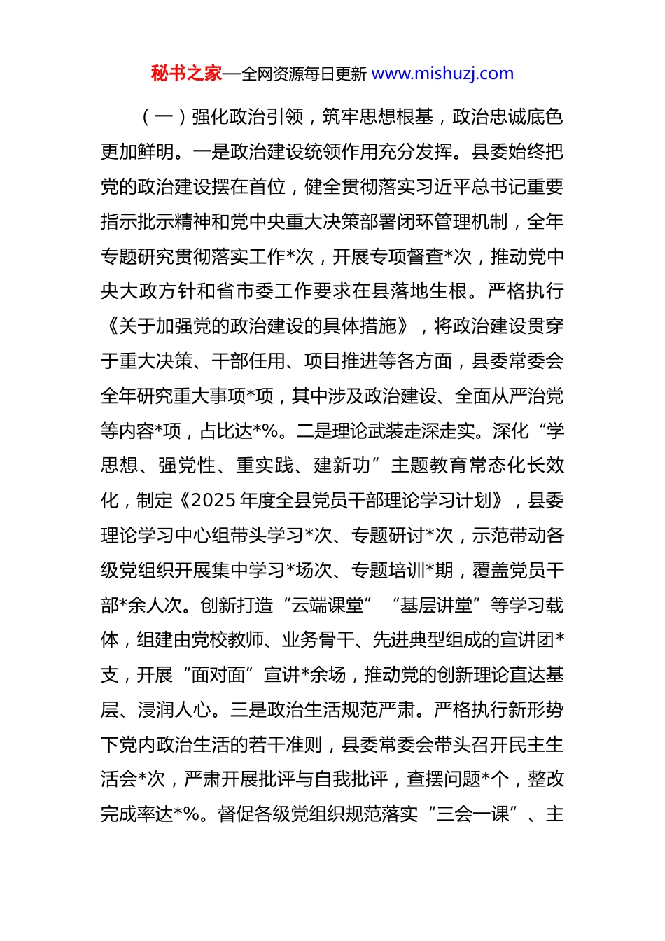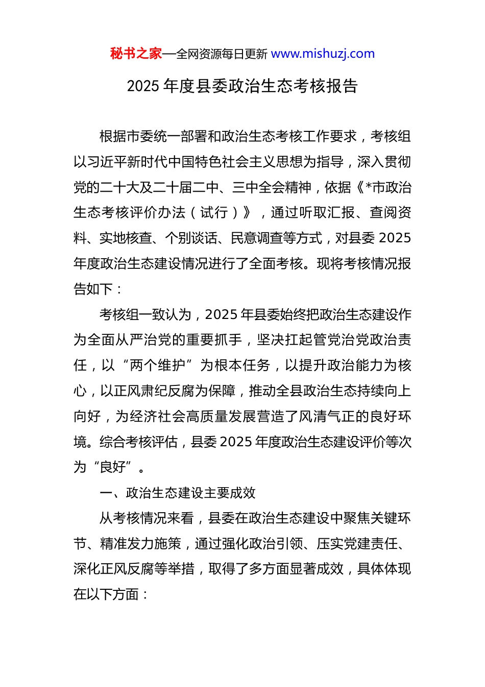 秘书之家—全网资源每日更新 www.mishuzj.com2025 年度县委政治生态考核报告 根据市委统一部署和政治生态考核工作要求,考核组以习近平新时代中国特色社会主义思想为指导,深入贯彻党的二十大及二十届二中、三中全会精神,依据《*市政治生态考核评价办法(试行)》,通过听取汇报、查阅资料、实地核查、个别谈话、民意调查等方式,对县委 2025年度政治生态建设情况进行了全面考核。现将考核情况报告如下:考核组一致认为,2025 年县委始终把政治生态建设作为全面从严治党的重要抓手,坚决扛起管党治党政治责任,以“两个维护”为根本任务,以提升政治能力为核心,以正风肃纪反腐为保障,推动全县政治生态持续向上向好,为经济社会高质量发展营造了风清气正的良好环境。综合考核评估,县委 2025 年度政治生态建设评价等次为“良好”。一、政治生态建设主要成效从考核情况来看,县委在政治生态建设中聚焦关键环节、精准发力施策,通过强化政治引领、压实党建责任、深化正风反腐等举措,取得了多方面显著成效,具体体现在以下方面:秘书之家—全网资源每日更新 www.mishuzj.com(一)强化政治引领,筑牢思想根基,政治忠诚底色更加鲜明。一是政治建设统领作用充分发挥。县委始终把党的政治建设摆在首位,健全贯彻落实习近平总书记重要指示批示精神和党中央重大决策部署闭环管理机制,全年专题研究贯彻落实工作*次,开展专项督查*次,推动党中央大政方针和省市委工作要求在县落地生根。严格执行《关于加强党的政治建设的具体措施》,将政治建设贯穿于重大决策、干部任用、项目推进等各方面,县委常委会全年研究重大事项*项,其中涉及政治建设、全面从严治党等内容*项,占比达*%。二是理论武装走深走实。深化“学思想、强党性、重实践、建新功”主题教育常态化长效化,制定《2025 年度全县党员干部理论学习计划》,县委理论学习中心组带头学习*次、专题研讨*次,示范带动各级党组织开展集中学习*场次、专题培训*期,覆盖党员干部*余人次。创新打造“云端课堂”“基层讲堂”等学习载体,组建由党校教师、业务骨干、先进典型组成的宣讲团*支,开展“面对面”宣讲*余场,推动党的创新理论直达基层、浸润人心。三是政治生活规范严肃。严格执行新形势下党内政治生活的若干准则,县委常委会带头召开民主生活会*次,严肃开展批评与自我批评,查摆问题*个,整改完成率达*%。督促各级党组织规范落实“三会一课”、主秘书之家—全网资源每日更新 www.mishuzj.com题党日等制度,全年抽查基层党组织组织生活记录*份,列席指导下级民主生活会、组织生活会*次,指出并整改不规范问题*个,党内政治生活的政治性、时代性、原则性、战斗性显著增强。(二)压实政治责任,建强组织体系,基层基础保障更加坚实。一是管党治党责任层层压实。健全“县委主体责任、书记第一责任人责任、班子成员‘一岗双责’、纪委监督责任”四方联动机制,制定《2025 年度全面从严治党责任清单》,县委书记与班子成员、乡镇(街道)及县直部门党组织书记签订责任书*份,开展全面从严治党专题调研*次,约谈党组织负责人*人次。创新推行“季度督查、半年考核、年度评议”工作机制,将考核结果与评先评优、干部任用直接挂钩,倒逼责任落实。二是基层组织建设提质增效。坚持大抓基层的鲜明导向,投入*万元用于基层党组织活动场所升级改造,打造标准化党支部*个,其中省级示范党支部*个、市级示范党支部*个。优化基层党组织设置,新建非公企业和社会组织党组织*个,调整软弱涣散党组织*个,实现各领域党组织全覆盖。深化“党建+”融合模式,开展“党建+重点项目攻坚”“党建+乡村振兴”等主题活动,设立“党员先锋岗”“责任区”*个,基层党组织战斗堡垒作用充分发挥。三是干部队伍建设不断秘书之家—全网资源每日更新 www.mishuzj.com加强。坚持正确选人用人导向,严格执行《党政领导干部选拔任用工作条例》,全年选拔任用干部*名,其中从基层一线、攻坚战场选拔*名,占比达*%。开展“干部能力提升年”活动,组织*名干部赴先进地区挂职锻炼、*名基层党组织书记“擂台比武”、*名年轻干部集中培训,干部队伍履职能力显...