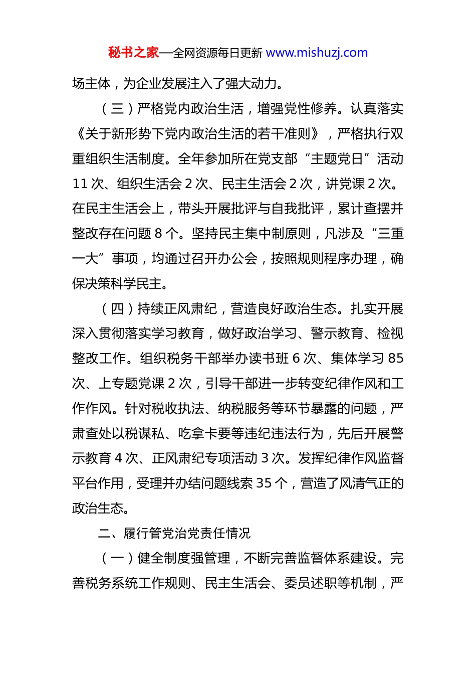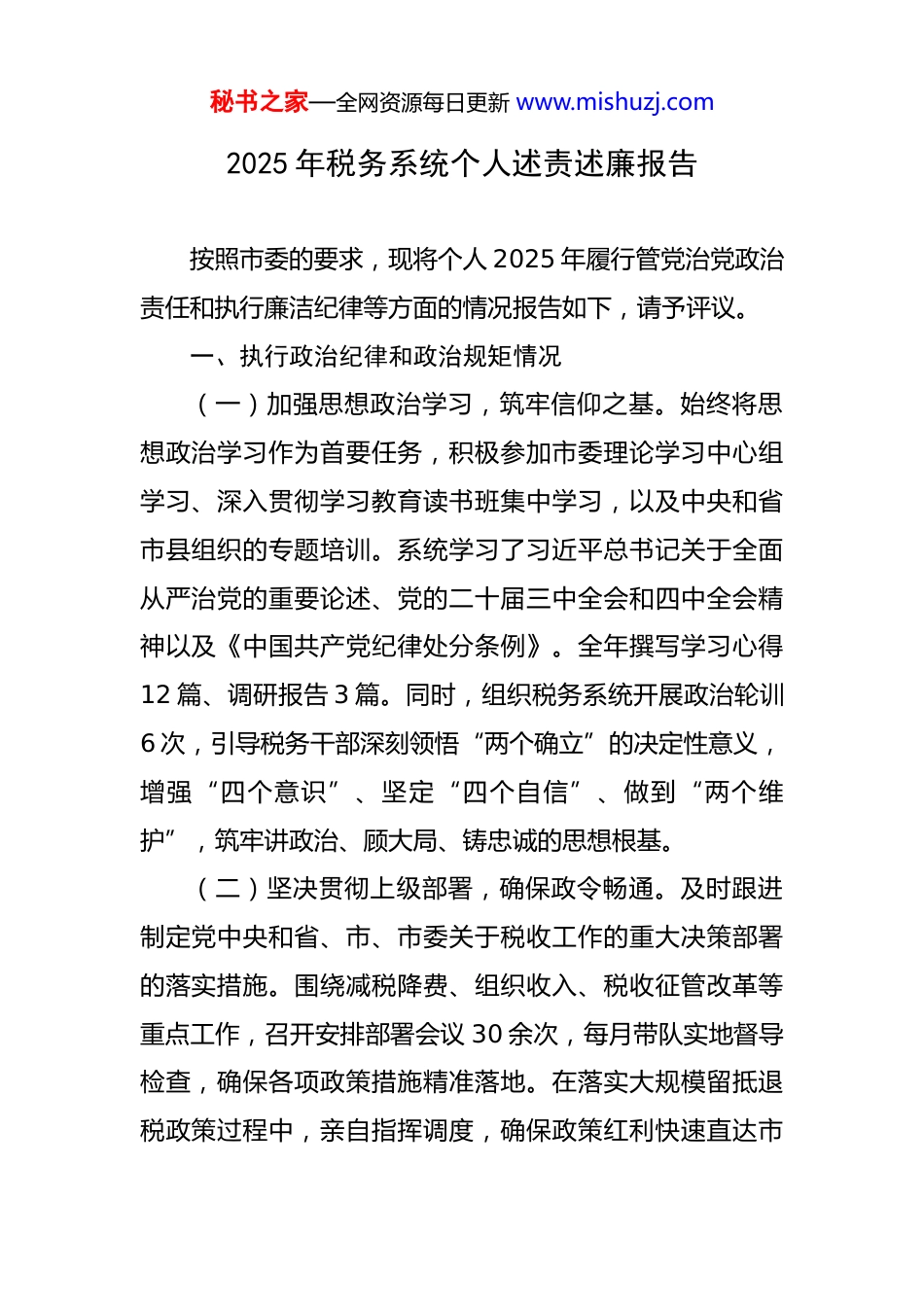 秘书之家—全网资源每日更新 www.mishuzj.com2025 年税务系统个人述责述廉报告 按照市委的要求,现将个人 2025 年履行管党治党政治责任和执行廉洁纪律等方面的情况报告如下,请予评议。一、执行政治纪律和政治规矩情况(一)加强思想政治学习,筑牢信仰之基。始终将思想政治学习作为首要任务,积极参加市委理论学习中心组学习、深入贯彻学习教育读书班集中学习,以及中央和省市县组织的专题培训。系统学习了习近平总书记关于全面从严治党的重要论述、党的二十届三中全会和四中全会精神以及《中国共产党纪律处分条例》。全年撰写学习心得12 篇、调研报告 3 篇。同时,组织税务系统开展政治轮训6 次,引导税务干部深刻领悟“两个确立”的决定性意义,增强“四个意识”、坚定“四个自信”、做到“两个维护”,筑牢讲政治、顾大局、铸忠诚的思想根基。(二)坚决贯彻上级部署,确保政令畅通。及时跟进制定党中央和省、市、市委关于税收工作的重大决策部署的落实措施。围绕减税降费、组织收入、税收征管改革等重点工作,召开安排部署会议 30 余次,每月带队实地督导检查,确保各项政策措施精准落地。在落实大规模留抵退税政策过程中,亲自指挥调度,确保政策红利快速直达市秘书之家—全网资源每日更新 www.mishuzj.com场主体,为企业发展注入了强大动力。(三)严格党内政治生活,增强党性修养。认真落实《关于新形势下党内政治生活的若干准则》,严格执行双重组织生活制度。全年参加所在党支部“主题党日”活动11 次、组织生活会 2 次、民主生活会 2 次,讲党课 2 次。在民主生活会上,带头开展批评与自我批评,累计查摆并整改存在问题 8 个。坚持民主集中制原则,凡涉及“三重一大”事项,均通过召开办公会,按照规则程序办理,确保决策科学民主。(四)持续正风肃纪,营造良好政治生态。扎实开展深入贯彻落实学习教育,做好政治学习、警示教育、检视整改工作。组织税务干部举办读书班 6 次、集体学习 85次、上专题党课 2 次,引导干部进一步转变纪律作风和工作作风。针对税收执法、纳税服务等环节暴露的问题,严肃查处以税谋私、吃拿卡要等违纪违法行为,先后开展警示教育 4 次、正风肃纪专项活动 3 次。发挥纪律作风监督平台作用,受理并办结问题线索 35 个,营造了风清气正的政治生态。二、履行管党治党责任情况(一)健全制度强管理,不断完善监督体系建设。完善税务系统工作规则、民主生活会、委员述职等机制,严秘书之家—全网资源每日更新 www.mishuzj.com格执行重大事项请示报告、执法监督等制度。定期召开税务系统全面从严治党工作会议,听取各部门党风廉政建设工作汇报,通过纪律作风督查、警示教育大会等形式,推动党建责任落地落实。配合市委巡察工作,全面做好问题整改、建章立制工作,做到整改问题全覆盖、整改结果高质量,进一步完善了税务系统的监督体系。(二)履职尽责抓落实,推动税收工作高质量发展。发挥税务系统党员干部的示范带动作用,推动各项税收工作取得实效。在组织收入方面,科学研判税收形势,加强税收征管,全年完成税收收入目标任务,为地方经济社会发展提供了坚实的财力保障。在减税降费方面,加大政策宣传力度,确保各项优惠政策应享尽享,有效减轻了企业负担,激发了市场主体活力。在税收征管改革方面,积极推进数字化转型,优化办税流程,提高了税收征管效率和服务质量。同时,加强税收风险管理,防范和化解税收征管风险,确保税收安全。(三)强化考核提效能,打造高素质税务队伍组织开展岗位培训 8 次,提升税务干部政治素质和业务能力。通过开展业务比武、技能竞赛等活动,激励干部职工学业务、提技能。强化税收工作考核,建立健全绩效考核机制,将考核结果与干部的评先评优、职务晋升等挂秘书之家—全网资源每日更新 www.mishuzj.com钩,推动形成大抓落实、创先争优的浓厚氛围。加强干部队伍建设,选拔任用了一批政治素质高、业务能力强、工作作风硬的干部,为税收工作提供了有力的人才支撑。三、推进党风廉政建设和反腐败工作情况(一)严格廉洁纪律,自觉坚守廉洁底线。严格落实廉洁自律要求,坚决抵...