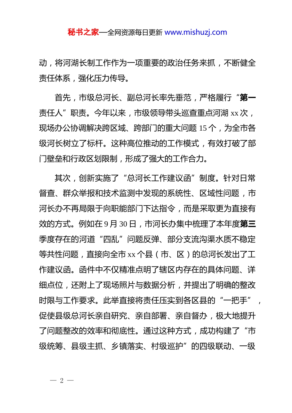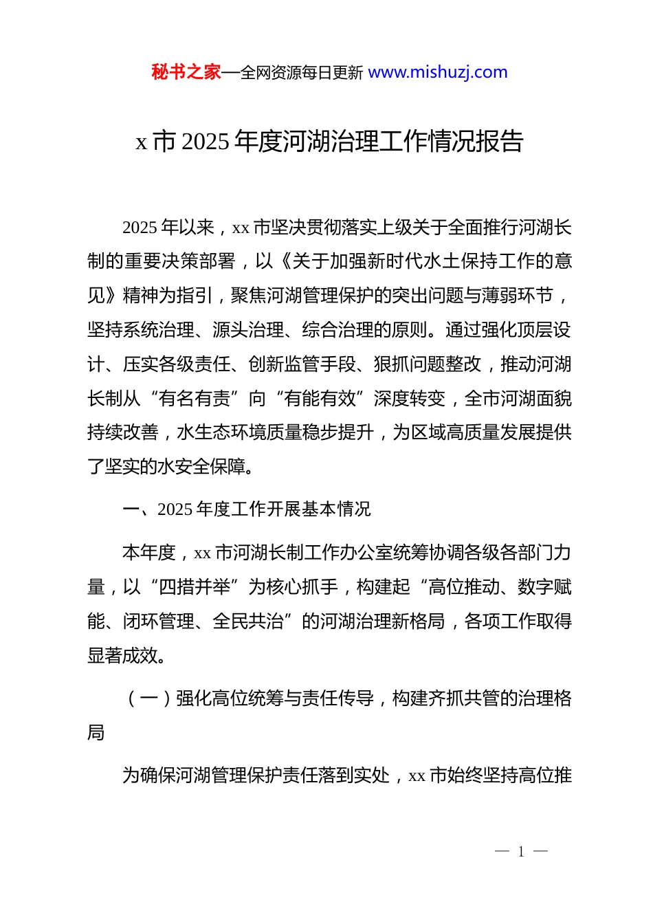 秘书之家—全网资源每日更新 www.mishuzj.comx 市 2025 年度河湖治理工作情况报告2025 年以来,xx 市坚决贯彻落实上级关于全面推行河湖长制的重要决策部署,以《关于加强新时代水土保持工作的意见》精神为指引,聚焦河湖管理保护的突出问题与薄弱环节,坚持系统治理、源头治理、综合治理的原则。通过强化顶层设计、压实各级责任、创新监管手段、狠抓问题整改,推动河湖长制从“有名有责”向“有能有效”深度转变,全市河湖面貌持续改善,水生态环境质量稳步提升,为区域高质量发展提供了坚实的水安全保障。一、2025 年度工作开展基本情况本年度,xx 市河湖长制工作办公室统筹协调各级各部门力量,以“四措并举”为核心抓手,构建起“高位推动、数字赋能、闭环管理、全民共治”的河湖治理新格局,各项工作取得显著成效。(一)强化高位统筹与责任传导,构建齐抓共管的治理格局为确保河湖管理保护责任落到实处,xx 市始终坚持高位推— 1 —秘书之家—全网资源每日更新 www.mishuzj.com动,将河湖长制工作作为一项重要的政治任务来抓,不断健全责任体系,强化压力传导。首先,市级总河长、副总河长率先垂范,严格履行“第一责任人”职责。今年以来,市级领导带头巡查重点河湖 xx 次,现场办公协调解决跨区域、跨部门的重大问题 15 个,为全市各级河长树立了标杆。这种高位推动的工作模式,有效打破了部门壁垒和行政区划限制,形成了强大的工作合力。其次,创新实施了“总河长工作建议函”制度。针对日常督查、群众举报和技术监测中发现的系统性、区域性问题,市河长办不再局限于向职能部门下达指令,而是采取更为直接有效的方式。例如在 9 月 30 日,市河长办集中梳理了本年度第三季度存在的河道“四乱”问题反弹、部分支流沟渠水质不稳定等共性问题,直接向全市 xx 个县(市、区)的总河长发出了工作建议函。函件中不仅精准点明了辖区内存在的具体问题、详细点位,还附上了现场照片与数据分析,并提出了明确的整改时限与工作要求。此举直接将责任压实到各区县的“一把手”,促使县级总河长亲自研究、亲自部署、亲自督办,极大地提升了问题整改的效率和彻底性。通过这种方式,成功构建了“市级统筹、县级主抓、乡镇落实、村级巡护”的四级联动、一级— 2 —秘书之家—全网资源每日更新 www.mishuzj.com抓一级、层层抓落实的闭环责任体系,确保了各项治理任务不折不扣地执行到位。在资金保障方面,虽然未能获取到全市完整的预算总额明细,但依据相关部门的预算公开信息推断,2025 年度市级财政专门设立了“河湖长制工作经费”专项资金,预算额度约为140 万元,重点用于支持河湖巡查管护、信息化平台运维、宣传培训以及应急处置等工作。此外,在水利发展的整体项目支出中,也包含了河道堤防建设与管理、湖泊保护管理等方面的预算投入这些资金共同构成了河湖治理工作的重要经济基础。(二)深化巡查督导与履职考核,提升基层治理的实效能力巡河是河湖长履职尽责的基础环节,其质量直接关系到问题发现的及时性和准确性。为彻底杜绝“打卡式”“应付式”巡河,xx 市在提升巡查实效方面下足了功夫。第一,建立了精细化的巡河质量通报与考核机制。市河长办依托智慧河湖管理平台,对各级河长的巡河轨迹、时长、距离等数据进行实时分析。对于巡河时长显著低于平均水平、巡查路线严重偏离河道岸线、巡查频次未达到规定要求的单位和— 3 —秘书之家—全网资源每日更新 www.mishuzj.com个人,系统会自动预警。市河长办每月定期生成《全市河湖长巡河质量分析报告》,对上述问题进行点名通报,并将考核结果与年度评优评先、干部绩效等直接挂钩。这一举措有效约束了基层河长的履职行为,推动巡河工作从“走过场”向“求实效”转变。据统计,截至 2025 年 11 月初,全市各级河长累计开展有效巡查 8.5 万余人次,总巡查里程超过 15 万公里巡查完成率达到 99.2%,人均单次巡河时长较去年同期提升了 25%。第二,系统性开展基层履职能力提升行动。针对部分基层河长业务不熟、政策不清、发现问题能力弱等短板,市河长办组织开展了多层次、全覆盖的专题培训。全年...