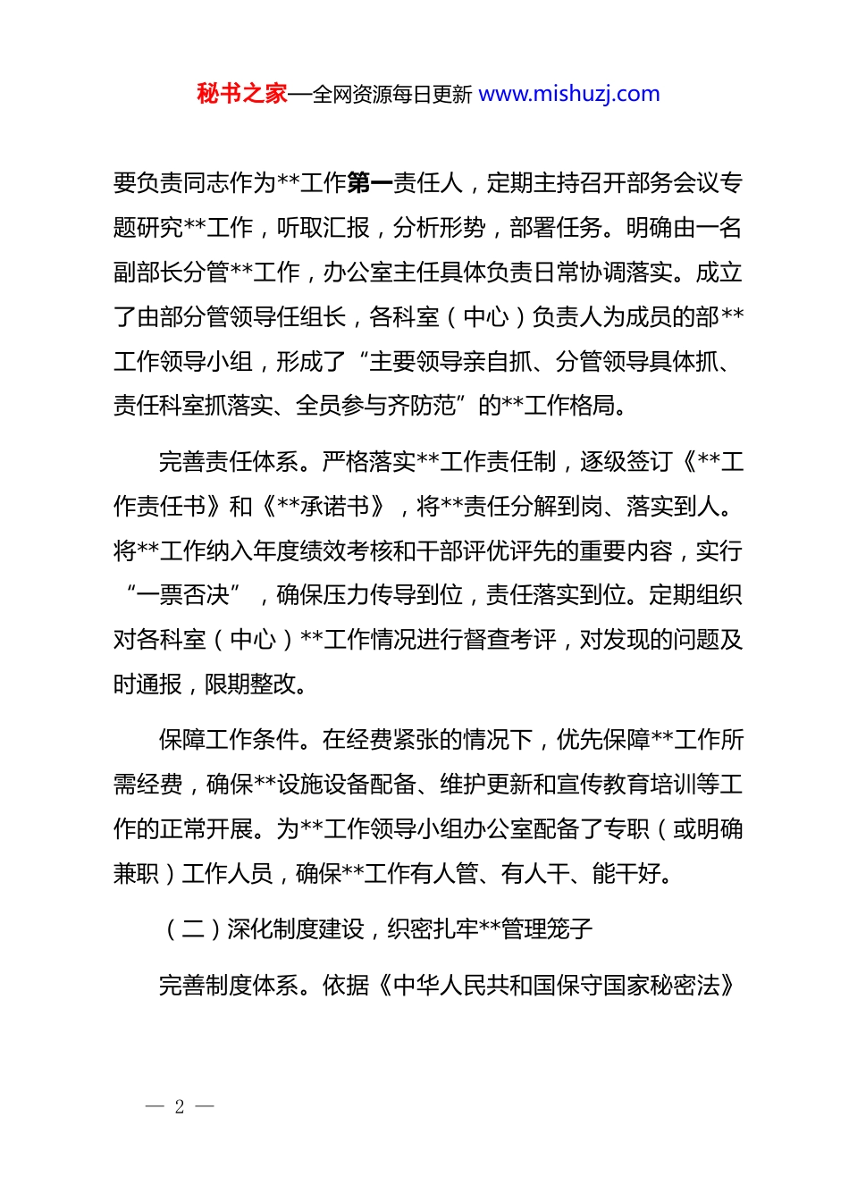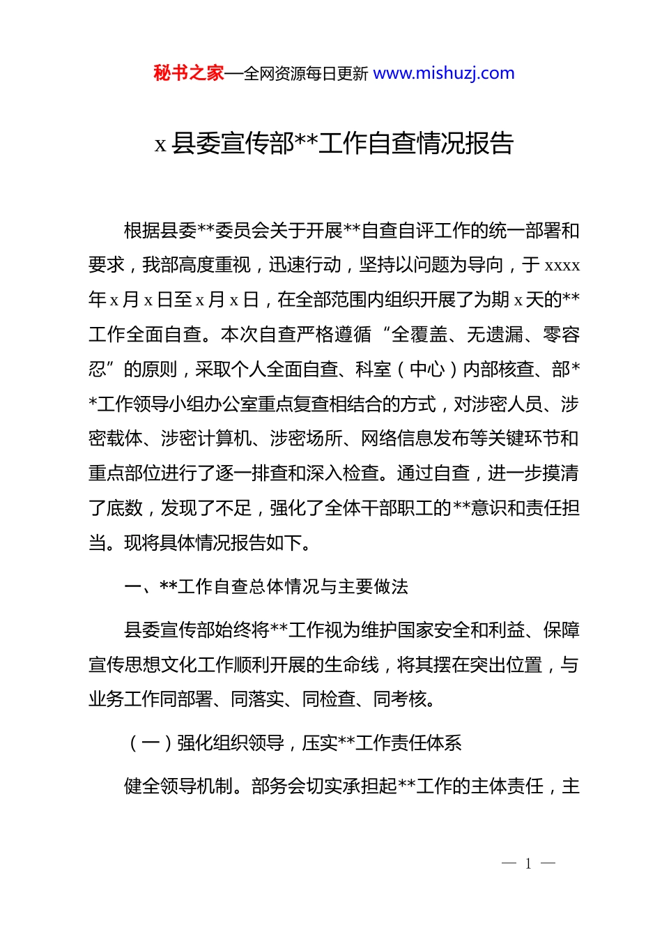 秘书之家—全网资源每日更新 www.mishuzj.comx 县委宣传部**工作自查情况报告根据县委**委员会关于开展**自查自评工作的统一部署和要求,我部高度重视,迅速行动,坚持以问题为导向,于 xxxx年 x 月 x 日至 x 月 x 日,在全部范围内组织开展了为期 x 天的**工作全面自查。本次自查严格遵循“全覆盖、无遗漏、零容忍”的原则,采取个人全面自查、科室(中心)内部核查、部**工作领导小组办公室重点复查相结合的方式,对涉密人员、涉密载体、涉密计算机、涉密场所、网络信息发布等关键环节和重点部位进行了逐一排查和深入检查。通过自查,进一步摸清了底数,发现了不足,强化了全体干部职工的**意识和责任担当。现将具体情况报告如下。一、**工作自查总体情况与主要做法县委宣传部始终将**工作视为维护国家安全和利益、保障宣传思想文化工作顺利开展的生命线,将其摆在突出位置,与业务工作同部署、同落实、同检查、同考核。(一)强化组织领导,压实**工作责任体系健全领导机制。部务会切实承担起**工作的主体责任,主— 1 —秘书之家—全网资源每日更新 www.mishuzj.com要负责同志作为**工作第一责任人,定期主持召开部务会议专题研究**工作,听取汇报,分析形势,部署任务。明确由一名副部长分管**工作,办公室主任具体负责日常协调落实。成立了由部分管领导任组长,各科室(中心)负责人为成员的部**工作领导小组,形成了“主要领导亲自抓、分管领导具体抓、责任科室抓落实、全员参与齐防范”的**工作格局。完善责任体系。严格落实**工作责任制,逐级签订《**工作责任书》和《**承诺书》,将**责任分解到岗、落实到人。将**工作纳入年度绩效考核和干部评优评先的重要内容,实行“一票否决”,确保压力传导到位,责任落实到位。定期组织对各科室(中心)**工作情况进行督查考评,对发现的问题及时通报,限期整改。保障工作条件。在经费紧张的情况下,优先保障**工作所需经费,确保**设施设备配备、维护更新和宣传教育培训等工作的正常开展。为**工作领导小组办公室配备了专职(或明确兼职)工作人员,确保**工作有人管、有人干、能干好。(二)深化制度建设,织密扎牢**管理笼子完善制度体系。依据《中华人民共和国保守国家秘密法》— 2 —秘书之家—全网资源每日更新 www.mishuzj.com及其实施条例等法律法规,结合宣传部门工作实际,修订完善了《县委宣传部**管理规定》、《涉密文件管理制度》、《涉密计算机及移动存储介质管理制度》、《涉密会议管理规定》、《信息公开**审查制度》、《机要**室管理规定》等一系列规章制度,使**工作的各个环节都有章可循、有规可依。严格制度执行。坚持制度面前人人平等,执行制度没有例外。加强对制度执行情况的监督检查,通过定期检查与随机抽查、全面检查与重点督查相结合的方式,重点检查涉密文件流转、网络安全管理、信息公开审查等关键环节的制度落实情况,对违反制度的行为严肃处理,切实维护制度的严肃性和权威性。强化督促整改。建立**工作隐患排查和整改台账制度,对自查和上级检查中发现的问题,明确责任科室、责任人、整改措施和完成时限,实行销号管理,确保问题整改彻底、不留死角。定期组织“回头看”,防止问题反弹。(三)狠抓宣传教育,筑牢全员**思想防线坚持常态化学习。将**教育纳入部理论学习中心组学习和干部职工年度教育培训计划,及时组织学习上级关于**工作的最新指示批示精神、**法律法规和规章制度。利用每周学习日、— 3 —秘书之家—全网资源每日更新 www.mishuzj.com主题*日活动等时机,组织观看**警示教育片,通报窃密泄密典型案例,引导干部职工深刻认识**工作的极端重要性和面临的复杂严峻形势,克服“无密可保”、“与己无关”等错误认识。开展专题化培训。针对宣传干部岗位特点,每年至少组织一次全员**知识专题培训,邀请**部门专家进行授课,重点讲解定密管理、网络**管理、涉密人员管理等专业知识。组织新入职、在岗涉密人员进行**知识和技能培训,并参加**知识考试,合格后方可上岗。创新多样化载体。充分利用部内部宣传栏、电子显示屏、工作微信群等平台,推送**知识、警示格...