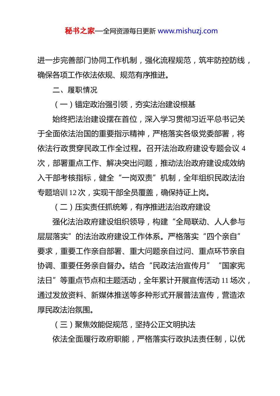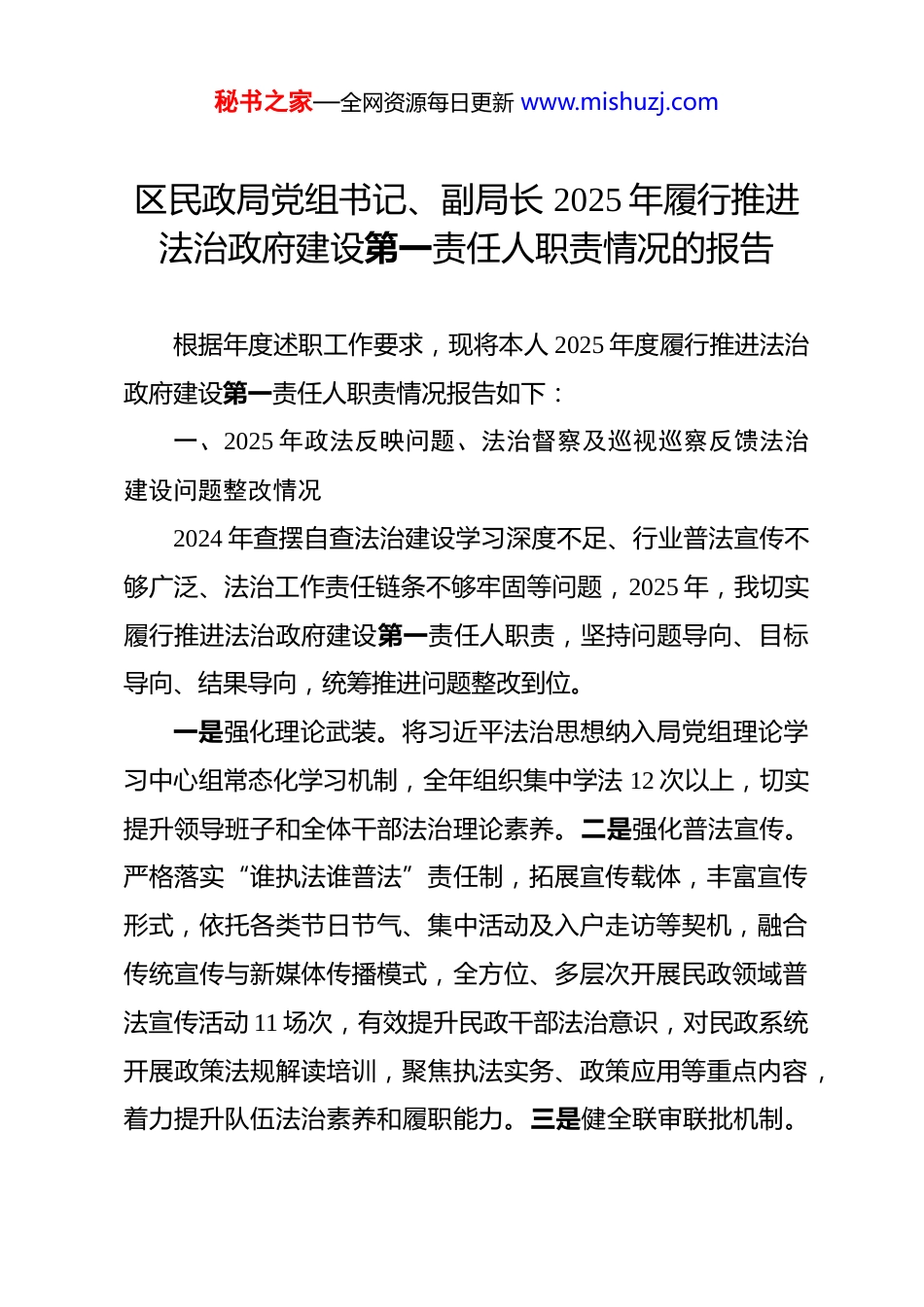 秘书之家—全网资源每日更新 www.mishuzj.com区民政局党组书记、副局长 2025 年履行推进法治政府建设第一责任人职责情况的报告 根据年度述职工作要求,现将本人 2025 年度履行推进法治政府建设第一责任人职责情况报告如下:一、2025 年政法反映问题、法治督察及巡视巡察反馈法治建设问题整改情况2024 年查摆自查法治建设学习深度不足、行业普法宣传不够广泛、法治工作责任链条不够牢固等问题,2025 年,我切实履行推进法治政府建设第一责任人职责,坚持问题导向、目标导向、结果导向,统筹推进问题整改到位。一是强化理论武装。将习近平法治思想纳入局党组理论学习中心组常态化学习机制,全年组织集中学法 12 次以上,切实提升领导班子和全体干部法治理论素养。二是强化普法宣传。严格落实“谁执法谁普法”责任制,拓展宣传载体,丰富宣传形式,依托各类节日节气、集中活动及入户走访等契机,融合传统宣传与新媒体传播模式,全方位、多层次开展民政领域普法宣传活动 11 场次,有效提升民政干部法治意识,对民政系统开展政策法规解读培训,聚焦执法实务、政策应用等重点内容,着力提升队伍法治素养和履职能力。三是健全联审联批机制。秘书之家—全网资源每日更新 www.mishuzj.com进一步完善部门协同工作机制,强化流程规范,筑牢防控防线,确保各项工作依法依规、规范有序推进。二、履职情况(一)锚定政治强引领,夯实法治建设根基始终把法治建设摆在首位,深入学习贯彻习近平总书记关于全面依法治国的重要指示精神,严格落实各级党委部署,将依法行政贯穿民政工作全过程。召开法治政府建设专题会议 4次,部署重点工作、解决突出问题,推动法治政府建设成效纳入干部考核指标,健全“一岗双责”机制,全年组织民政法治专题培训 12 次,实现干部全员覆盖,确保持证上岗。(二)压实责任抓统筹,有序推进法治政府建设强化法治政府建设组织领导,构建“全局联动、人人参与层层落实”的法治政府建设工作体系。严格落实“四个亲自”要求,重要工作亲自部署、重大问题亲自过问、重点环节亲自协调、重要任务亲自督办。结合“民政法治宣传月”“国家宪法日”等重点节点和主题活动,全年累计开展宣传活动 11 场次,通过发放资料、新媒体推送等多种形式开展普法宣传,营造浓厚民政法治氛围。(三)聚焦效能促规范,坚持公正文明执法依法全面履行政府职能,严格落实行政执法责任制,以优秘书之家—全网资源每日更新 www.mishuzj.com化法治化营商环境为抓手,对照现行法律法规及“三定”规定,系统梳理形成民政权责清单 49 项,做到权责清晰、履职有据。精准落实社会救助政策,强化困难群众动态监测,累计发放困难群众救助补助金 5266.81 万元。严肃查处违规违纪行为,累计核查清理不符合条件对象 24 例,追回违规发放资金 3.89 万元。深化“双随机、一公开”监管,联合县市场监督管理局、县卫生健康局对养老机构开展联合监督检查,检查养老服务机构 1家;全力推动殡改、公墓区全面回归公益属性,切实维护群众切身利益。加强殡葬市场秩序整治,开展多部门联合执法检查,累计对 4 家经营单位下发整改文书,依法查处未明码标价案件 2起。(四)力促上下协同,夯实法治政府建设共识坚持以新时代“枫桥经验”为指引,发挥领导班子“头雁效应”,推动形成一级抓一级、层层抓落实的工作格局。严格执行重大行政决策合法性审查和风险评估制度,确保各项决策合法合规。落实行政执法“三项制度”,将法治融入民政工作各环节,提升干部法治履职能力。全面推进政务公开,规范发布 73 项民政政务服务事项,公开相关信息 120 余条;高效办结“12345”市民服务投诉咨询 18 件。自觉接受人大监督,办结人大建议 1 件,畅通监督渠道,为民政事业高质量发展提供坚实秘书之家—全网资源每日更新 www.mishuzj.com法治保障。三、存在的主要问题一是法治人才支撑仍显薄弱。民政领域专业化、法治化建设要求持续提升,法治政府建设与民政业务融合不够,执法人员系统化培训不足,法律顾问作用发挥广度需拓展。二是法治建设协同合力仍显不足。跨部门依法行政、联合执法协调联动机...