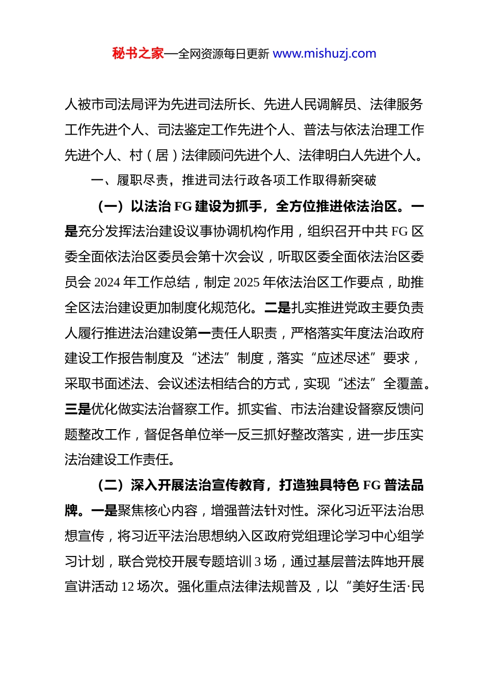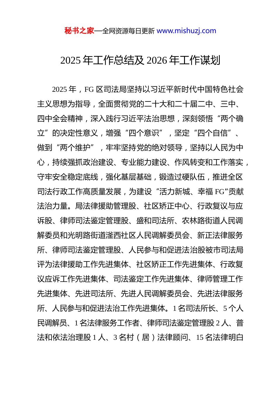秘书之家—全网资源每日更新 www.mishuzj.com2025 年工作总结及 2026 年工作谋划2025 年,FG 区司法局坚持以习近平新时代中国特色社会主义思想为指导,全面贯彻党的二十大和二十届二中、三中、四中全会精神,深入践行习近平法治思想,深刻领悟“两个确立”的决定性意义,增强“四个意识”,坚定“四个自信”、做到“两个维护”,牢牢坚持党的绝对领导,坚持以人民为中心,持续强抓政治建设、专业能力建设、作风转变和工作落实,守牢安全稳定底线,强化基层基础,锻造过硬队伍,推进全区司法行政工作高质量发展,为建设“活力新城、幸福 FG”贡献法治力量。局法律援助管理股、社区矫正中心、行政复议与应诉股、律师司法鉴定管理股、盛和司法所、农林路街道人民调解委员和光明路街道滏西社区人民调解委员会、新正法律服务所、律师司法鉴定管理股、人民参与和促进法治股被市司法局评为法律援助工作先进集体、社区矫正工作先进集体、行政复议应诉工作先进集体、司法鉴定工作先进集体、律师管理工作先进集体、先进司法所、先进人民调解委员会、先进法律服务所、人民参与和促进法治工作先进集体。1 名司法所长、5 个人民调解员、1 名法律服务工作者、律师司法鉴定管理股 2 人、普法和依法治理股 1 人、3 名村(居)法律顾问、15 名法律明白秘书之家—全网资源每日更新 www.mishuzj.com人被市司法局评为先进司法所长、先进人民调解员、法律服务工作先进个人、司法鉴定工作先进个人、普法与依法治理工作先进个人、村(居)法律顾问先进个人、法律明白人先进个人。一、履职尽责,推进司法行政各项工作取得新突破(一)以法治 FG 建设为抓手,全方位推进依法治区。一是充分发挥法治建设议事协调机构作用,组织召开中共 FG 区委全面依法治区委员会第十次会议,听取区委全面依法治区委员会 2024 年工作总结,制定 2025 年依法治区工作要点,助推全区法治建设更加制度化规范化。二是扎实推进党政主要负责人履行推进法治建设第一责任人职责,严格落实年度法治政府建设工作报告制度及“述法”制度,落实“应述尽述”要求,采取书面述法、会议述法相结合的方式,实现“述法”全覆盖。三是优化做实法治督察工作。抓实省、市法治建设督察反馈问题整改工作,督促各单位举一反三抓好整改落实,进一步压实法治建设工作责任。(二)深入开展法治宣传教育,打造独具特色 FG 普法品牌。一是聚焦核心内容,增强普法针对性。深化习近平法治思想宣传,将习近平法治思想纳入区政府党组理论学习中心组学习计划,联合党校开展专题培训 3 场,通过基层普法阵地开展宣讲活动 12 场次。强化重点法律法规普及,以“美好生活·民秘书之家—全网资源每日更新 www.mishuzj.com法典相伴”为主题,开展民法典进社区系列活动,发放宣传资料 8000 余份;结合“4·15”全民国家安全教育日、“12·4”国家宪法日,开展集中宣传活动 5 场。突出专项领域法治赋能,聚焦优化营商环境,深入推进“法律进企业”开展宣讲 18 场,开展“关爱未成年人成长”等专项活动 6 次,填补重点群体法律知识空白。二是创新方式载体,提升普法实效性。建强线下普法阵地,深化“法律九进”工作,打造社区普法角 15 个,实现基层普法全覆盖。打造线上传播矩阵,发布普法以案释法 70 余例、图文解读 60 余篇。丰富特色普法形式,开展“双争有我——法治宣传进社区”“民法典宣传月”等特色活动,通过以案释法、现场答疑等方式,让普法更接地气、更具活力。三是健全工作机制,夯实普法保障力。压实普法责任制,落实“谁执法谁普法”要求,制定年度普法任务清单,开展责任制落实督查 4 次。我区落实“谁执法谁普法”工作在全市两次排名第二,一次排名第一。建强普法队伍,扩充普法讲师团至 30 人,选聘25 名社会监督员参与普法监督,组建“法律明白人”队伍覆盖所有村(社区),筑牢基层普法根基。(三)深入推进依法行政,提高法治工作水平。1.强化行政执法监督,规范公正文明执法。一是扎实推进整治违规异地执法、趋利性执法以及乱收费、乱罚款、乱检查、秘书之家—全网资源每日更新 www.mishuzj...