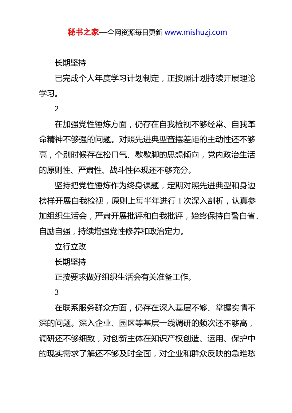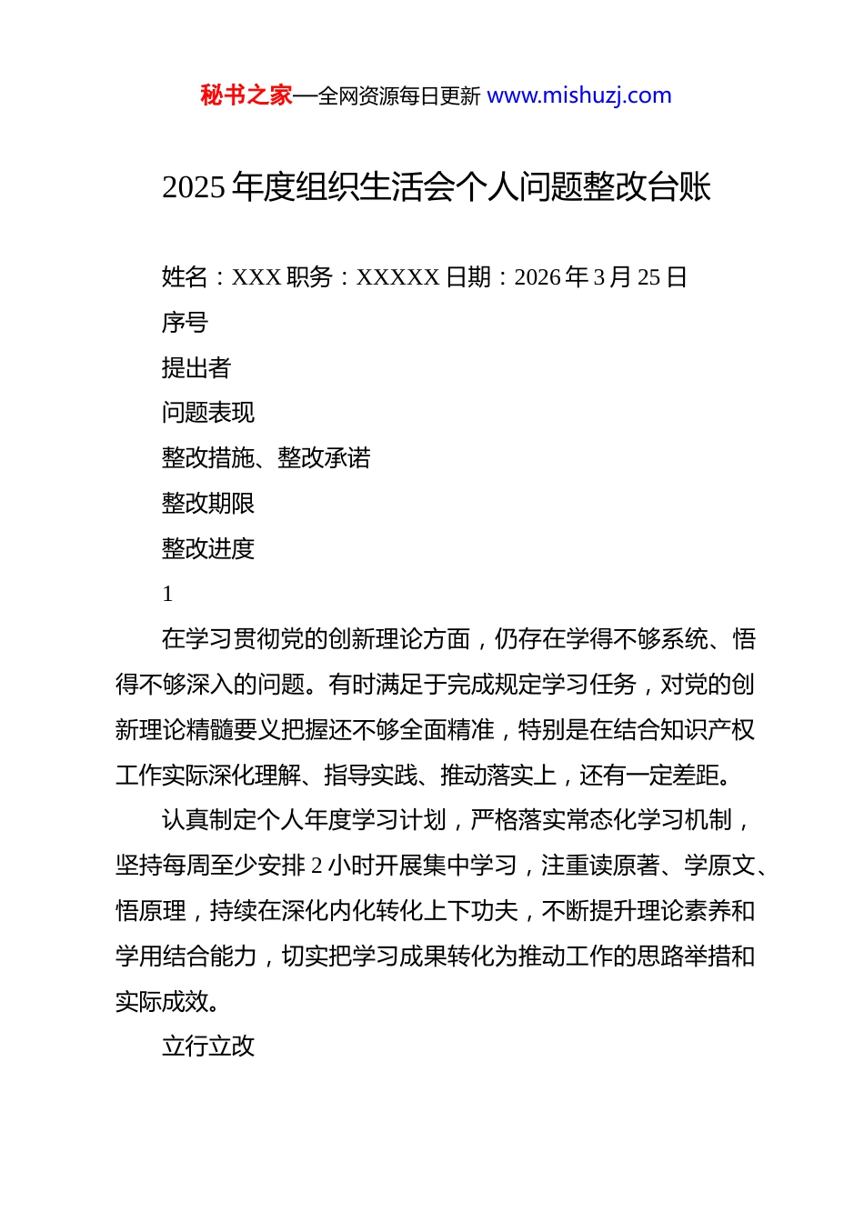 秘书之家—全网资源每日更新 www.mishuzj.com2025 年度组织生活会个人问题整改台账 姓名:XXX 职务:XXXXX 日期:2026 年 3 月 25 日序号提出者问题表现整改措施、整改承诺整改期限整改进度1在学习贯彻党的创新理论方面,仍存在学得不够系统、悟得不够深入的问题。有时满足于完成规定学习任务,对党的创新理论精髓要义把握还不够全面精准,特别是在结合知识产权工作实际深化理解、指导实践、推动落实上,还有一定差距。认真制定个人年度学习计划,严格落实常态化学习机制,坚持每周至少安排 2 小时开展集中学习,注重读原著、学原文、悟原理,持续在深化内化转化上下功夫,不断提升理论素养和学用结合能力,切实把学习成果转化为推动工作的思路举措和实际成效。立行立改秘书之家—全网资源每日更新 www.mishuzj.com长期坚持已完成个人年度学习计划制定,正按照计划持续开展理论学习。2在加强党性锤炼方面,仍存在自我检视不够经常、自我革命精神不够强的问题。对照先进典型查摆差距的主动性还不够高,个别时候存在松口气、歇歇脚的思想倾向,党内政治生活的原则性、严肃性、战斗性体现还不够充分。坚持把党性锤炼作为终身课题,定期对照先进典型和身边榜样开展自我检视,原则上每半年进行 1 次深入剖析,认真参加组织生活会,严肃开展批评和自我批评,始终保持自警自省、自励自强,持续增强党性修养和政治定力。立行立改长期坚持正按要求做好组织生活会有关准备工作。3在联系服务群众方面,仍存在深入基层不够、掌握实情不深的问题。深入企业、园区等基层一线调研的频次还不够高,调研还不够细致,对创新主体在知识产权创造、运用、保护中的现实需求了解还不够及时全面,对企业和群众反映的急难愁秘书之家—全网资源每日更新 www.mishuzj.com盼问题掌握还不够精准。建立常态化走访调研机制,坚持每月至少深入企业、园区开展 2 次走访调研,面对面听取意见建议,动态掌握企业需求,及时梳理形成问题台账,实行清单管理、销号推进,努力做到情况掌握更及时、服务对接更精准、问题解决更有效,切实提升服务质效。立行立改长期坚持正协助完成专利开放许可声明 X 项,相关服务工作持续推进。4在发挥先锋模范作用方面,仍存在担当精神不足、攻坚劲头减弱的问题。面对重点任务和复杂矛盾时,有时存在按部就班、求稳怕难的倾向,迎难而上的锐气和攻坚克难的劲头有所不足,先锋模范作用发挥还不够充分。进一步强化责任意识和担当意识,持续加强业务学习和实践锻炼,立足岗位职责主动作为、主动领题,对知识产权促进工作中的重点难点问题不回避、不推脱,主动领办、靠前推进,以更高标准履职尽责,以更实作风发挥党员先锋模范作用。立行立改秘书之家—全网资源每日更新 www.mishuzj.com长期坚持相关整改事项正在持续推进。