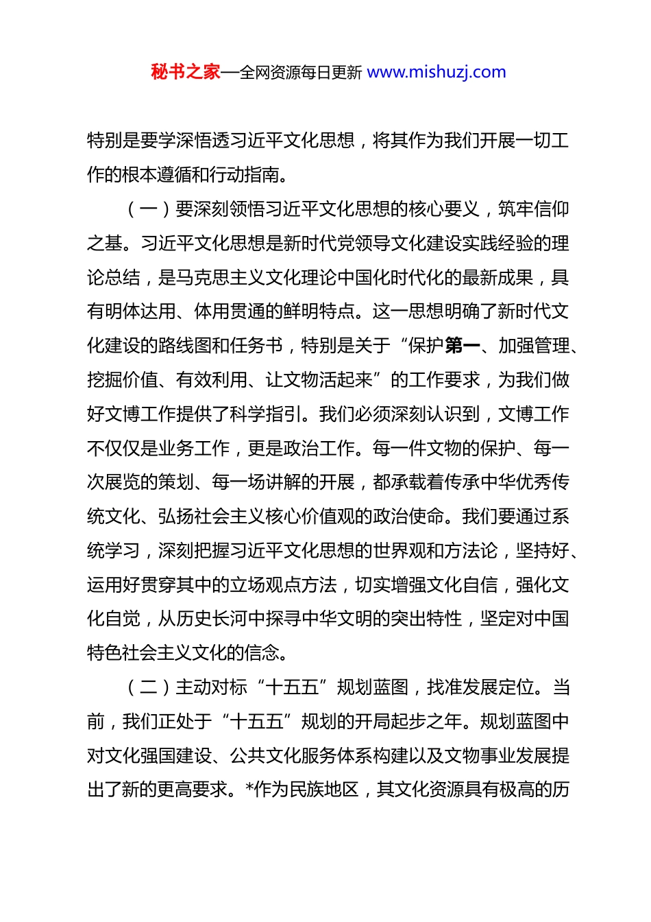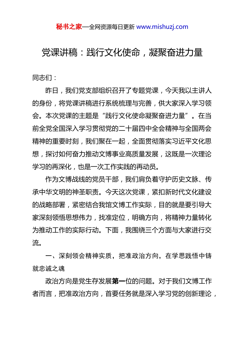 秘书之家—全网资源每日更新 www.mishuzj.com党课讲稿:践行文化使命,凝聚奋进力量 同志们:昨日,我们党支部组织召开了专题党课,今天我以主讲人的身份,将党课讲稿进行系统梳理与完善,供大家深入学习领会。本次党课的主题是“践行文化使命凝聚奋进力量”。在当前全党全国深入学习贯彻党的二十届四中全会精神与全国两会精神的重要时刻,我们聚在一起,全面贯彻落实习近平文化思想,探讨如何奋力推动文博事业高质量发展,这既是一次理论学习的再深化,也是一次工作实践的再动员。作为文博战线的党员干部,我们肩负着守护历史文脉、传承中华文明的神圣职责。今天这次党课,紧扣新时代文化建设的战略部署,紧密结合我馆文博工作实际,目的就是要引导大家深刻领悟思想伟力,找准定位,明确方向,将精神力量转化为推动工作的实际行动。下面,我围绕三个方面与大家进行交流。一、深刻领会精神实质,把准政治方向,在学思践悟中铸就忠诚之魂政治方向是党生存发展第一位的问题。对于我们文博工作者而言,把准政治方向,首要任务就是深入学习党的创新理论,秘书之家—全网资源每日更新 www.mishuzj.com特别是要学深悟透习近平文化思想,将其作为我们开展一切工作的根本遵循和行动指南。(一)要深刻领悟习近平文化思想的核心要义,筑牢信仰之基。习近平文化思想是新时代党领导文化建设实践经验的理论总结,是马克思主义文化理论中国化时代化的最新成果,具有明体达用、体用贯通的鲜明特点。这一思想明确了新时代文化建设的路线图和任务书,特别是关于“保护第一、加强管理、挖掘价值、有效利用、让文物活起来”的工作要求,为我们做好文博工作提供了科学指引。我们必须深刻认识到,文博工作不仅仅是业务工作,更是政治工作。每一件文物的保护、每一次展览的策划、每一场讲解的开展,都承载着传承中华优秀传统文化、弘扬社会主义核心价值观的政治使命。我们要通过系统学习,深刻把握习近平文化思想的世界观和方法论,坚持好、运用好贯穿其中的立场观点方法,切实增强文化自信,强化文化自觉,从历史长河中探寻中华文明的突出特性,坚定对中国特色社会主义文化的信念。(二)主动对标“十五五”规划蓝图,找准发展定位。当前,我们正处于“十五五”规划的开局起步之年。规划蓝图中对文化强国建设、公共文化服务体系构建以及文物事业发展提出了新的更高要求。*作为民族地区,其文化资源具有极高的历秘书之家—全网资源每日更新 www.mishuzj.com史价值、艺术价值和科学价值。我们要站在全州乃至全省全国的大局中审视自身工作,精准找准博物馆在文物保护、文化传承、公共服务中的新定位与新任务。要深刻认识到,博物馆不仅是文物的收藏机构,更是文化的传播中心、教育的实践基地、公众的精神家园。我们要把博物馆的发展融入*经济社会发展的全局之中,主动对接国家重大文化战略,在推进中华民族现代文明建设中展现*担当。这要求我们必须提高政治站位,胸怀“国之大者”,切实把思想和行动统一到党中央的决策部署上来,确保文博事业始终沿着正确的政治方向前进。(三)要立足*独特的民族文化资源禀赋,扛起时代责任。*大地上星罗棋布的文物古迹,是各民族交往交流交融的历史见证,是铸牢中华民族共同体意识的生动教材。我们要深刻领会习近平总书记关于加强和改进民族工作的重要思想,将文博工作与铸牢中华民族共同体意识主线紧密结合。通过对文物资源的挖掘、整理和研究,讲好各民族团结奋斗的故事,讲好*儿女守望相助的故事。我们要把这一资源禀赋转化为推动发展的强大动力,在保护中传承,在传承中发展,让沉睡在库房里的文物成为滋养民族精神的甘露,成为增强民族凝聚力的纽带。二、坚持守正创新,务本务实推动提质增效,在履职尽责中彰显担当作为秘书之家—全网资源每日更新 www.mishuzj.com文博事业的高质量发展,离不开守正创新的辩证统一。守正是基础,创新是关键。我们要聚焦主责主业,既要守住文物保护的底线,又要开辟创新发展的新路,不断提升*历史文化的传播力与影响力。(一)把文物保护作为“生命线”工程,筑牢安全根基。文物是不可再生的珍贵资源,保护是文物工作的重中之...