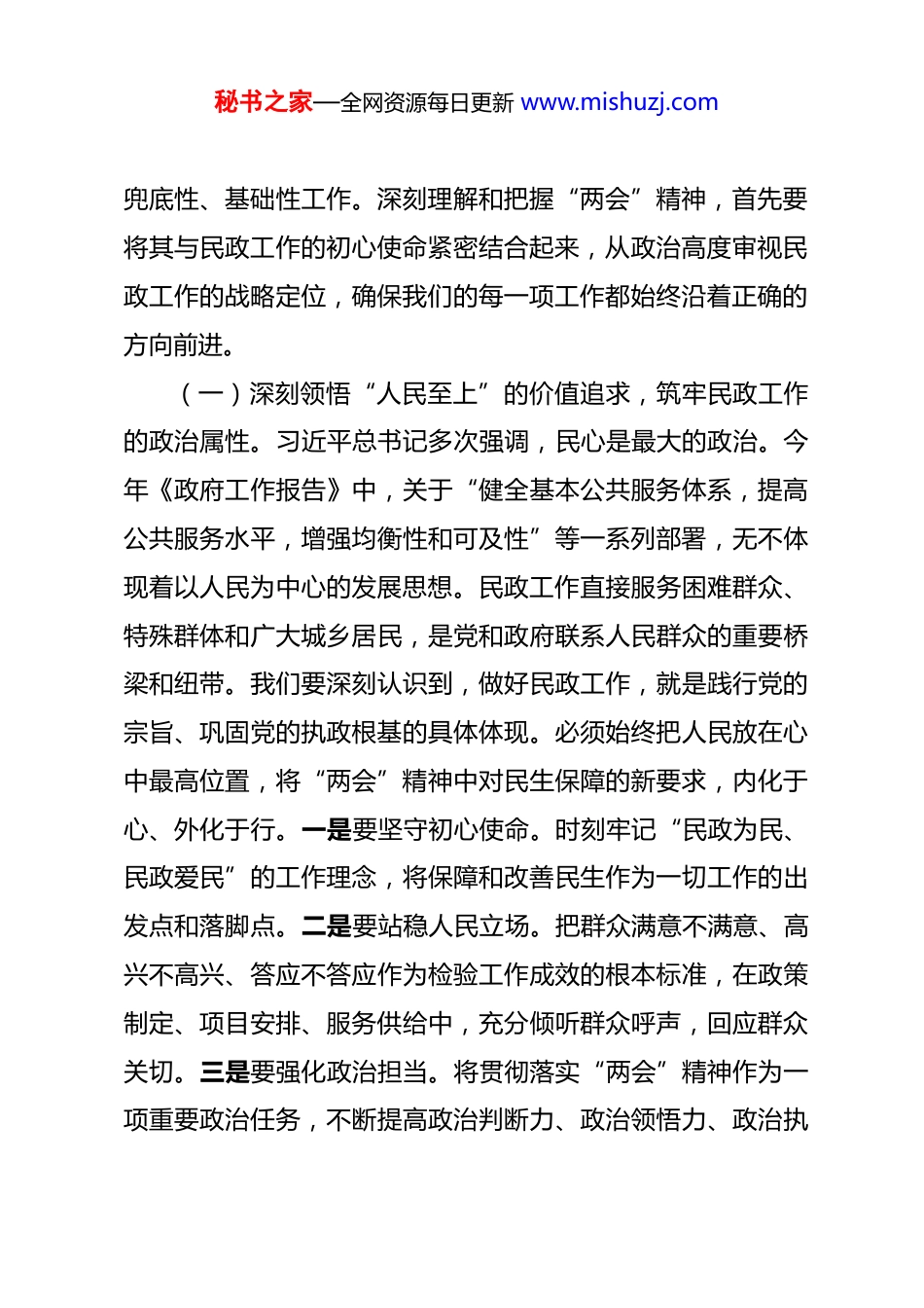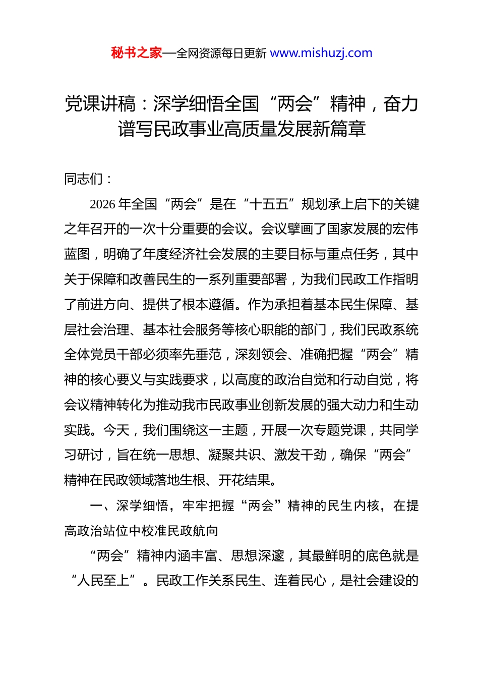 秘书之家—全网资源每日更新 www.mishuzj.com党课讲稿:深学细悟全国“两会”精神,奋力谱写民政事业高质量发展新篇章 同志们:2026 年全国“两会”是在“十五五”规划承上启下的关键之年召开的一次十分重要的会议。会议擘画了国家发展的宏伟蓝图,明确了年度经济社会发展的主要目标与重点任务,其中关于保障和改善民生的一系列重要部署,为我们民政工作指明了前进方向、提供了根本遵循。作为承担着基本民生保障、基层社会治理、基本社会服务等核心职能的部门,我们民政系统全体党员干部必须率先垂范,深刻领会、准确把握“两会”精神的核心要义与实践要求,以高度的政治自觉和行动自觉,将会议精神转化为推动我市民政事业创新发展的强大动力和生动实践。今天,我们围绕这一主题,开展一次专题党课,共同学习研讨,旨在统一思想、凝聚共识、激发干劲,确保“两会”精神在民政领域落地生根、开花结果。一、深学细悟,牢牢把握“两会”精神的民生内核,在提高政治站位中校准民政航向“两会”精神内涵丰富、思想深邃,其最鲜明的底色就是“人民至上”。民政工作关系民生、连着民心,是社会建设的秘书之家—全网资源每日更新 www.mishuzj.com兜底性、基础性工作。深刻理解和把握“两会”精神,首先要将其与民政工作的初心使命紧密结合起来,从政治高度审视民政工作的战略定位,确保我们的每一项工作都始终沿着正确的方向前进。(一)深刻领悟“人民至上”的价值追求,筑牢民政工作的政治属性。习近平总书记多次强调,民心是最大的政治。今年《政府工作报告》中,关于“健全基本公共服务体系,提高公共服务水平,增强均衡性和可及性”等一系列部署,无不体现着以人民为中心的发展思想。民政工作直接服务困难群众、特殊群体和广大城乡居民,是党和政府联系人民群众的重要桥梁和纽带。我们要深刻认识到,做好民政工作,就是践行党的宗旨、巩固党的执政根基的具体体现。必须始终把人民放在心中最高位置,将“两会”精神中对民生保障的新要求,内化于心、外化于行。一是要坚守初心使命。时刻牢记“民政为民、民政爱民”的工作理念,将保障和改善民生作为一切工作的出发点和落脚点。二是要站稳人民立场。把群众满意不满意、高兴不高兴、答应不答应作为检验工作成效的根本标准,在政策制定、项目安排、服务供给中,充分倾听群众呼声,回应群众关切。三是要强化政治担当。将贯彻落实“两会”精神作为一项重要政治任务,不断提高政治判断力、政治领悟力、政治执秘书之家—全网资源每日更新 www.mishuzj.com行力,确保中央和省市关于民生民政工作的各项决策部署不折不扣落到实处。(二)精准把握“高质量发展”的时代主题,提升民政服务的供给效能。当前,我国经济社会发展已进入高质量发展阶段。习近平总书记指出,高质量发展,就是能够很好满足人民日益增长的美好生活需要的发展。“两会”对推动高质量发展提出了新的更高要求,强调要更好统筹发展和安全,全面深化改革开放,大力提升自主创新能力。这要求我们民政工作也必须转变发展方式,从注重“有没有”转向更加注重“好不好”,从追求数量规模转向追求质量效益。一是要聚焦精准保障。围绕困难群众、老年人、残疾人、孤儿等特殊群体的多元化需求,进一步完善分层分类的社会救助体系,提高保障标准的科学性和精准度,确保“应保尽保、应救尽救”。二是要优化服务供给。积极应对人口老龄化国家战略,大力发展普惠型养老服务和互助性养老,健全居家社区机构相协调、医养康养相结合的养老服务体系。同时,要持续深化殡葬改革,优化婚姻登记服务,提升残疾人福利保障水平,不断增强基本社会服务的可及性和便捷性。三是要注重创新驱动。顺应数字化、智能化发展趋势,加快“智慧民政”建设,运用大数据、云计算等现代信息技术,提升民政工作的管理效能和服务水平,推动民政服务秘书之家—全网资源每日更新 www.mishuzj.com模式创新升级。(三)全面落实“安全发展”的底线要求,夯实民政领域的安全根基。安全是发展的前提。“两会”对防范化解重大风险、维护国家安全和社会稳定作出重要部署。民政领域点多线长面广,服务对象特殊,安全风险点...