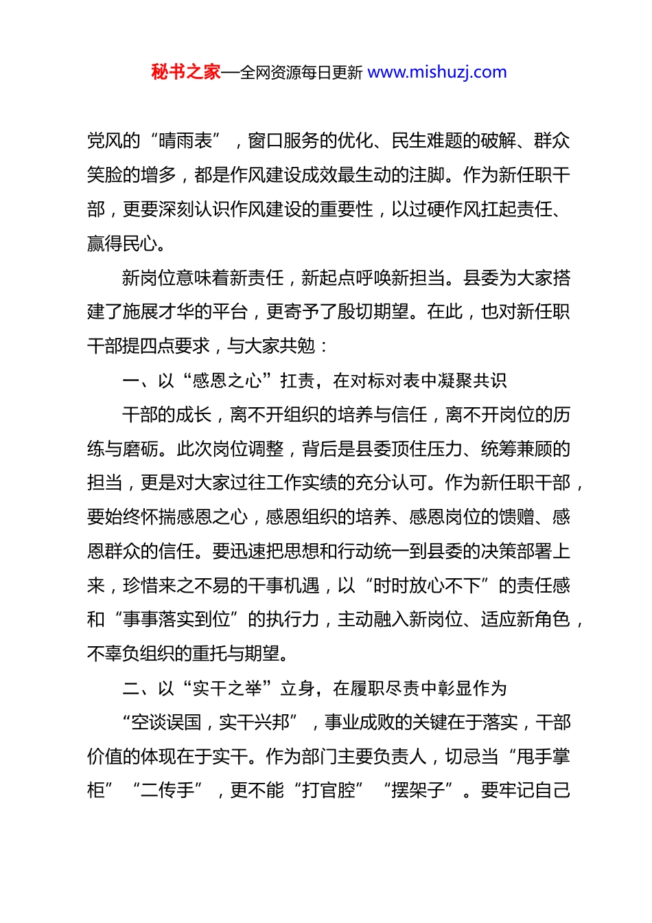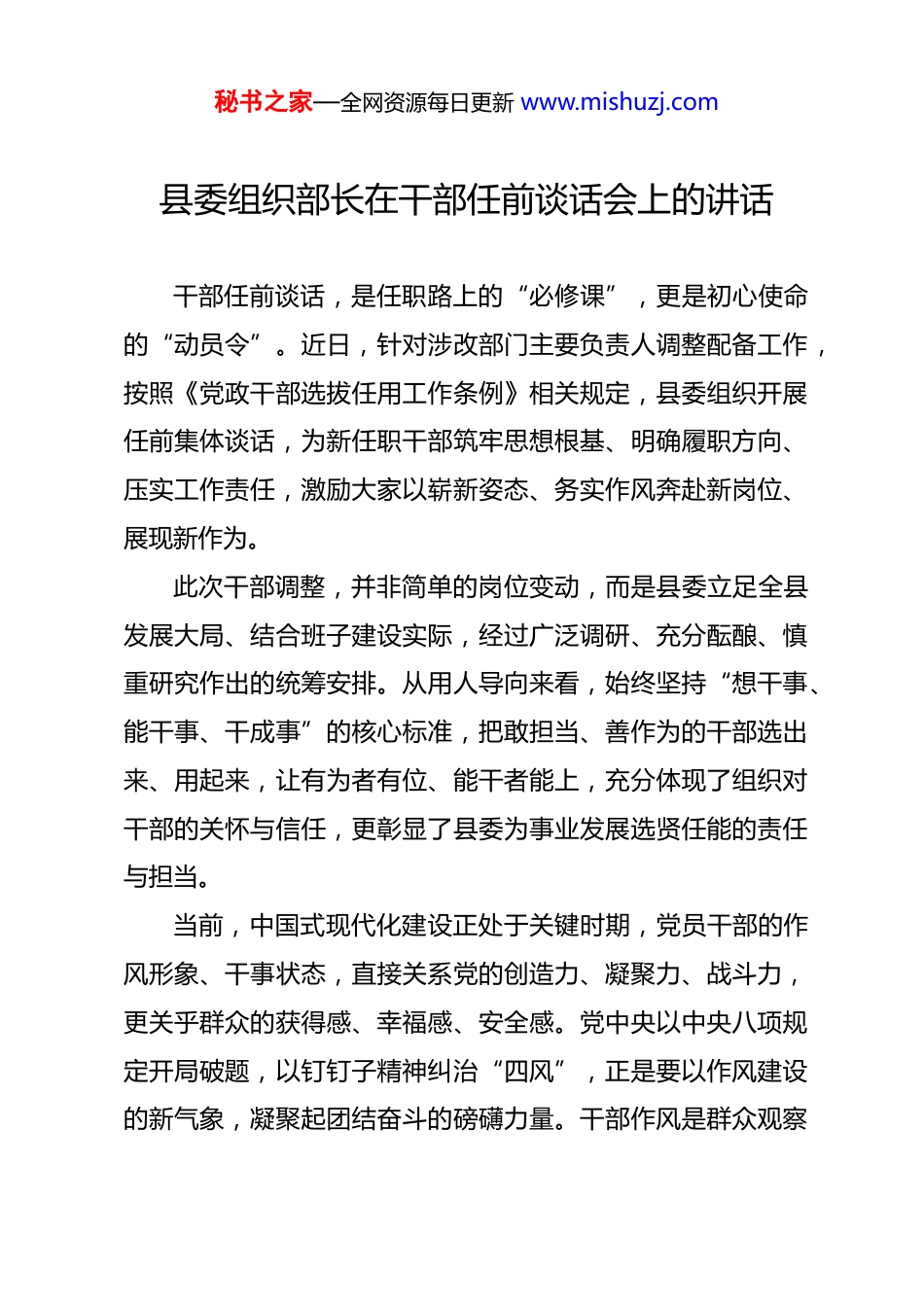 秘书之家—全网资源每日更新 www.mishuzj.com县委组织部长在干部任前谈话会上的讲话 干部任前谈话,是任职路上的“必修课”,更是初心使命的“动员令”。近日,针对涉改部门主要负责人调整配备工作,按照《党政干部选拔任用工作条例》相关规定,县委组织开展任前集体谈话,为新任职干部筑牢思想根基、明确履职方向、压实工作责任,激励大家以崭新姿态、务实作风奔赴新岗位、展现新作为。此次干部调整,并非简单的岗位变动,而是县委立足全县发展大局、结合班子建设实际,经过广泛调研、充分酝酿、慎重研究作出的统筹安排。从用人导向来看,始终坚持“想干事、能干事、干成事”的核心标准,把敢担当、善作为的干部选出来、用起来,让有为者有位、能干者能上,充分体现了组织对干部的关怀与信任,更彰显了县委为事业发展选贤任能的责任与担当。当前,中国式现代化建设正处于关键时期,党员干部的作风形象、干事状态,直接关系党的创造力、凝聚力、战斗力,更关乎群众的获得感、幸福感、安全感。党中央以中央八项规定开局破题,以钉钉子精神纠治“四风”,正是要以作风建设的新气象,凝聚起团结奋斗的磅礴力量。干部作风是群众观察秘书之家—全网资源每日更新 www.mishuzj.com党风的“晴雨表”,窗口服务的优化、民生难题的破解、群众笑脸的增多,都是作风建设成效最生动的注脚。作为新任职干部,更要深刻认识作风建设的重要性,以过硬作风扛起责任、赢得民心。新岗位意味着新责任,新起点呼唤新担当。县委为大家搭建了施展才华的平台,更寄予了殷切期望。在此,也对新任职干部提四点要求,与大家共勉:一、以“感恩之心”扛责,在对标对表中凝聚共识干部的成长,离不开组织的培养与信任,离不开岗位的历练与磨砺。此次岗位调整,背后是县委顶住压力、统筹兼顾的担当,更是对大家过往工作实绩的充分认可。作为新任职干部,要始终怀揣感恩之心,感恩组织的培养、感恩岗位的馈赠、感恩群众的信任。要迅速把思想和行动统一到县委的决策部署上来,珍惜来之不易的干事机遇,以“时时放心不下”的责任感和“事事落实到位”的执行力,主动融入新岗位、适应新角色,不辜负组织的重托与期望。二、以“实干之举”立身,在履职尽责中彰显作为“空谈误国,实干兴邦”,事业成败的关键在于落实,干部价值的体现在于实干。作为部门主要负责人,切忌当“甩手掌柜”“二传手”,更不能“打官腔”“摆架子”。要牢记自己秘书之家—全网资源每日更新 www.mishuzj.com是“一号干事员”“前线指挥员”,主动沉下身子、深入一线,把工作重心放在抓落实上,把精力投入到解难题中。无论是经济发展、项目建设,还是乡村振兴、民生保障,都要以“钉钉子”精神一抓到底,用实实在在的工作成效,向组织和群众交上一份满意的答卷。要始终坚信,职位是干出来的,实绩是拼出来的,只有脚踏实地、真抓实干,才能在新岗位上站稳脚跟、行稳致远。三、以“奋进之力”担当,在攻坚克难中锤炼本领新时代赋予新使命,新征程面临新挑战。干工作既要有激情、有热情,更要有担当、有本领。中央和省委相继出台激励干部担当作为的相关意见,目的就是为敢于担当、善于作为的干部撑腰鼓劲。作为新任职干部,要摒弃“躺平”思想、破除“畏难”情绪,以“逢山开路、遇水架桥”的闯劲,以“攻坚克难、迎难而上”的拼劲,在新岗位上大胆履职、放手一搏。要树立“争创一流”的目标导向,不满足于“过得去”,更要追求“过得硬”,不断提升干事创业的能力水平,努力在各自领域开创工作新局面,争做新时代敢于担当、善于作为的好干部。四、以“敬畏之心”修身,在廉洁自律中健康成长廉洁是干部的立身之本、成事之基。当前,监督体系日益秘书之家—全网资源每日更新 www.mishuzj.com完善,监督触角延伸到方方面面,“阳光用权、透明干事”已成为必然要求。作为部门主要负责人,要始终坚守纪律底线、不越规矩红线,常怀敬畏之心、常思贪欲之害、常修为政之德。要明白“严管就是厚爱,监督就是保护”,自觉接受组织监督、群众监督、舆论监督,做到心有所畏、言有所戒、行有所止。要始终牢记“当官不是为了做大官,而是为了做大事”,不追...