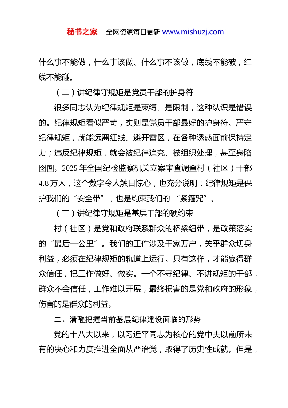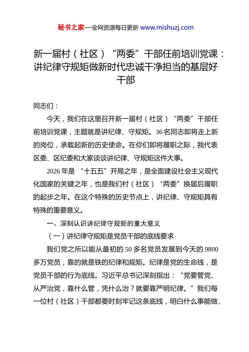 秘书之家—全网资源每日更新 www.mishuzj.com新一届村(社区)“两委”干部任前培训党课:讲纪律守规矩做新时代忠诚干净担当的基层好干部 同志们:今天,我们在这里召开新一届村(社区)“两委”干部任前培训党课,主题就是讲纪律、守规矩。36 名同志即将走上新的岗位,承载起新的历史使命。在你们即将履职之际,我代表区委、区纪委和大家谈谈讲纪律、守规矩这件大事。2026 年是 “十五五”开局之年,是全面建设社会主义现代化国家的关键之年,也是我们村(社区)“两委”换届后履职的起步之年。在这个特殊的历史节点上,讲纪律、守规矩具有特殊的重要意义。一、深刻认识讲纪律守规矩的重大意义(一)讲纪律守规矩是党员干部的底线要求我们党之所以能从最初的 50 多名党员发展到今天的 9800多万党员,靠的就是铁的纪律和规矩。纪律是党的生命线,是党员干部的行为底线。习近平总书记深刻指出:“党要管党、从严治党,靠什么管,凭什么治?就要靠严明纪律。”我们每一位村(社区)干部都要时刻牢记这条底线,明白什么事能做、秘书之家—全网资源每日更新 www.mishuzj.com什么事不能做,什么事该做、什么事不该做,底线不能破,红线不能碰。(二)讲纪律守规矩是党员干部的护身符很多同志认为纪律规矩是束缚、是限制,这种认识是错误的。纪律规矩看似严苛,实则是党员干部最好的护身符。严守纪律规矩,就能远离红线、避开雷区,在各种诱惑面前保持定力;违反纪律规矩,就会被纪律追究、被组织处理,甚至身陷囹圄。2025 年全国纪检监察机关立案审查调查村(社区)干部4.8 万人,这个数字令人触目惊心,也充分说明:纪律规矩是保护我们的“安全带”,也是约束我们的 “紧箍咒”。(三)讲纪律守规矩是基层干部的硬约束村(社区)是党和政府联系群众的桥梁纽带,是政策落实的“最后一公里”。我们的工作涉及千家万户,关乎群众切身利益,必须在纪律规矩的轨道上运行。只有这样,才能赢得群众信任,把工作做好、做实。一个不守纪律、不讲规矩的干部,群众不会信任,工作难以开展,最终损害的是党和政府的形象,伤害的是群众的利益。二、清醒把握当前基层纪律建设面临的形势党的十八大以来,以习近平同志为核心的党中央以前所未有的决心和力度推进全面从严治党,取得了历史性成就。但是,秘书之家—全网资源每日更新 www.mishuzj.com我们必须清醒看到,基层腐败问题和违反中央八项规定精神问题依然突出,形势依然严峻复杂。(一)从全国数据看:基层微腐败问题依然突出2025 年上半年,全国纪检监察机关受理或原任村党支部书记、村委会主任违纪违法问题线索 4.8 万件,仅第一季度就达1.9 万件。这些数据充分说明:发生在群众身边的不正之风和腐败问题,依然易发多发,基层“微腐败” 存量尚未清除,增量仍在发生。(二)从我区情况看:基层违纪违法问题时有发生近年来,我区查处了一批村(社区)干部违纪违法案件,主要问题集中在:在 “三资”管理中动手脚:侵占集体资产、套取集体资金、违规发包集体资源;在惠民政策落实中优亲厚友:骗取低保、危房改造等补贴损害群众利益;在服务群众中不作为、乱作为:对群众诉求敷衍塞责、推诿扯皮。(三)从违纪违法特点看:呈现新动向隐形变异:由直接收受红包转向电子红包、快递送礼,由直接受贿转向通过亲友承揽工程、入股企业等方式牟利;秘书之家—全网资源每日更新 www.mishuzj.com“四风”问题顽固:违规吃喝、违规发放津补贴、形式主义、官僚主义问题依然存在;不作为慢作为:遇到矛盾绕道走,碰到困难往后退,对群众诉求“推绕拖”。三、准确把握“六大纪律” 的核心要义和实践要求新修订的《中国共产党纪律处分条例》已于 2024 年 1 月 1日起施行,这是党中央坚持以严的基调强化正风肃纪反腐的坚定决心。我们要深入学习领会,准确把握“六大纪律” 的核心要义和实践要求。(一)严守政治纪律,做到绝对忠诚政治纪律是最重要、最根本、最关键的纪律。讲政治纪律不能“偏”,政治上偏了,就会在根本方向上出问题。要坚定理想信念,增强“四个意识”、坚定 “四个自信”、做到“两个维护”,坚决贯彻落实党中央...