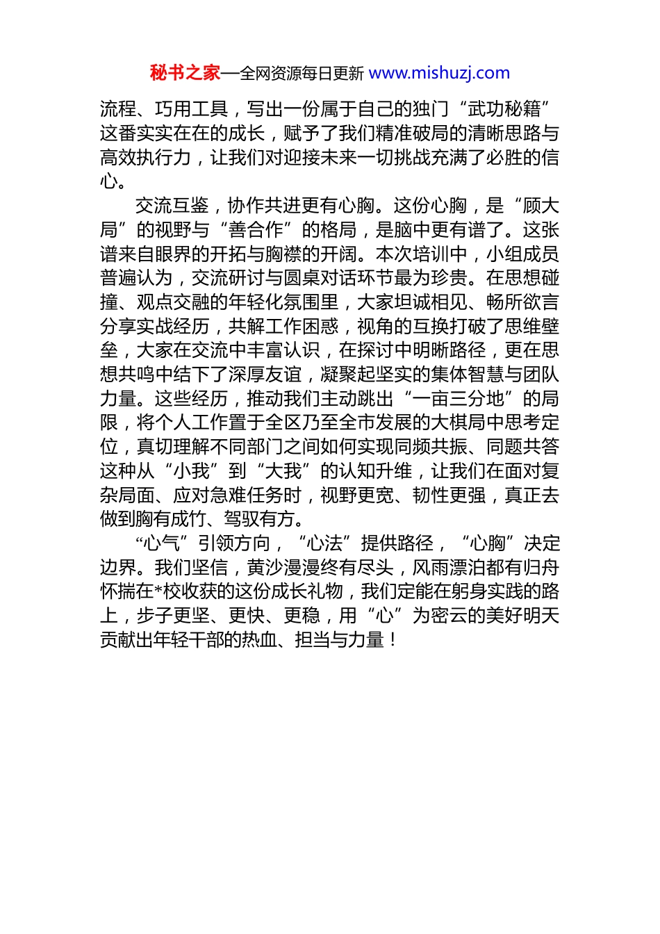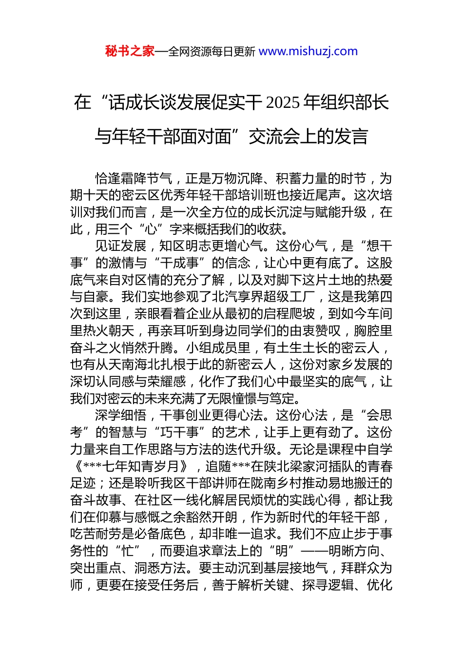 秘书之家—全网资源每日更新 www.mishuzj.com在“话成长谈发展促实干 2025 年组织部长与年轻干部面对面”交流会上的发言恰逢霜降节气,正是万物沉降、积蓄力量的时节,为期十天的密云区优秀年轻干部培训班也接近尾声。这次培训对我们而言,是一次全方位的成长沉淀与赋能升级,在此,用三个“心”字来概括我们的收获。见证发展,知区明志更增心气。这份心气,是“想干事”的激情与“干成事”的信念,让心中更有底了。这股底气来自对区情的充分了解,以及对脚下这片土地的热爱与自豪。我们实地参观了北汽享界超级工厂,这是我第四次到这里,亲眼看着企业从最初的启程爬坡,到如今车间里热火朝天,再亲耳听到身边同学们的由衷赞叹,胸腔里奋斗之火悄然升腾。小组成员里,有土生土长的密云人,也有从天南海北扎根于此的新密云人,这份对家乡发展的深切认同感与荣耀感,化作了我们心中最坚实的底气,让我们对密云的未来充满了无限憧憬与笃定。深学细悟,干事创业更得心法。这份心法,是“会思考”的智慧与“巧干事”的艺术,让手上更有劲了。这份力量来自工作思路与方法的迭代升级。无论是课程中自学《***七年知青岁月》,追随***在陕北梁家河插队的青春足迹;还是聆听我区干部讲师在陇南乡村推动易地搬迁的奋斗故事、在社区一线化解居民烦忧的实践心得,都让我们在仰慕与感慨之余豁然开朗,作为新时代的年轻干部,吃苦耐劳是必备底色,却非唯一追求。我们不应止步于事务性的“忙”,而要追求章法上的“明”——明晰方向、突出重点、洞悉方法。要主动沉到基层接地气,拜群众为师,更要在接受任务后,善于解析关键、探寻逻辑、优化秘书之家—全网资源每日更新 www.mishuzj.com流程、巧用工具,写出一份属于自己的独门“武功秘籍”这番实实在在的成长,赋予了我们精准破局的清晰思路与高效执行力,让我们对迎接未来一切挑战充满了必胜的信心。交流互鉴,协作共进更有心胸。这份心胸,是“顾大局”的视野与“善合作”的格局,是脑中更有谱了。这张谱来自眼界的开拓与胸襟的开阔。本次培训中,小组成员普遍认为,交流研讨与圆桌对话环节最为珍贵。在思想碰撞、观点交融的年轻化氛围里,大家坦诚相见、畅所欲言分享实战经历,共解工作困惑,视角的互换打破了思维壁垒,大家在交流中丰富认识,在探讨中明晰路径,更在思想共鸣中结下了深厚友谊,凝聚起坚实的集体智慧与团队力量。这些经历,推动我们主动跳出“一亩三分地”的局限,将个人工作置于全区乃至全市发展的大棋局中思考定位,真切理解不同部门之间如何实现同频共振、同题共答这种从“小我”到“大我”的认知升维,让我们在面对复杂局面、应对急难任务时,视野更宽、韧性更强,真正去做到胸有成竹、驾驭有方。“心气”引领方向,“心法”提供路径,“心胸”决定边界。我们坚信,黄沙漫漫终有尽头,风雨漂泊都有归舟怀揣在*校收获的这份成长礼物,我们定能在躬身实践的路上,步子更坚、更快、更稳,用“心”为密云的美好明天贡献出年轻干部的热血、担当与力量!