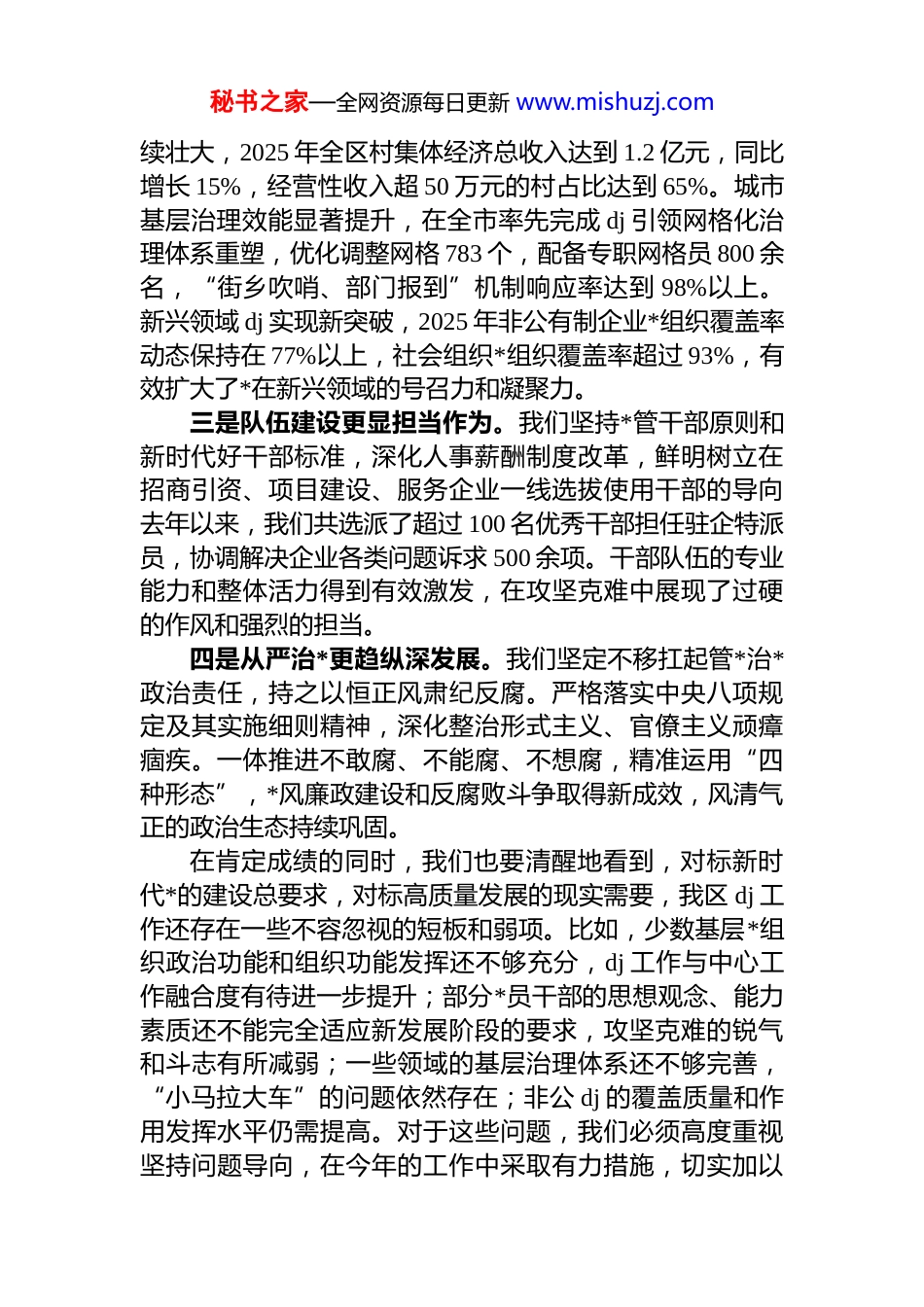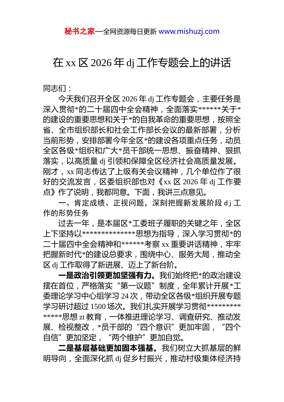 秘书之家—全网资源每日更新 www.mishuzj.com在 xx 区 2026 年 dj 工作专题会上的讲话同志们:今天我们召开全区 2026 年 dj 工作专题会,主要任务是深入贯彻*的二十届四中全会精神,全面落实******关于*的建设的重要思想和关于*的自我革命的重要思想,按照全省、全市组织部长和社会工作部长会议的最新部署,分析当前形势,安排部署今年全区*的建设各项重点任务,动员全区各级*组织和广大*员干部统一思想、振奋精神、狠抓落实,以高质量 dj 引领和保障全区经济社会高质量发展。刚才,xx 同志传达了上级有关会议精神,几个单位作了很好的交流发言,区委组织部也对《xx 区 2026 年 dj 工作要点》作了说明,我都同意。下面,我讲三点意见。一、肯定成绩、正视问题,深刻把握新发展阶段 dj 工作的形势任务过去一年,是本届区*工委班子履职的关键之年,全区上下坚持以**************思想为指导,深入学习贯彻*的二十届四中全会精神和******考察 xx 重要讲话精神,牢牢把握新时代*的建设总要求,围绕中心、服务大局,推动全区 dj 工作取得了新进展、迈上了新台阶。一是政治引领更加坚强有力。我们始终把*的政治建设摆在首位,严格落实“第一议题”制度,全年累计开展*工委理论学习中心组学习 24 次,带动全区各级*组织开展专题学习研讨超过 1500 场次。我们扎实开展学习贯彻**************思想 zt 教育,一体推进理论学习、调查研究、推动发展、检视整改,*员干部的“四个意识”更加牢固,“四个自信”更加坚定,“两个维护”更加自觉。二是基层基础更加固本强基。我们树立大抓基层的鲜明导向,全面深化抓 dj 促乡村振兴,推动村级集体经济持秘书之家—全网资源每日更新 www.mishuzj.com续壮大,2025 年全区村集体经济总收入达到 1.2 亿元,同比增长 15%,经营性收入超 50 万元的村占比达到 65%。城市基层治理效能显著提升,在全市率先完成 dj 引领网格化治理体系重塑,优化调整网格 783 个,配备专职网格员 800 余名,“街乡吹哨、部门报到”机制响应率达到 98%以上。新兴领域 dj 实现新突破,2025 年非公有制企业*组织覆盖率动态保持在 77%以上,社会组织*组织覆盖率超过 93%,有效扩大了*在新兴领域的号召力和凝聚力。三是队伍建设更显担当作为。我们坚持*管干部原则和新时代好干部标准,深化人事薪酬制度改革,鲜明树立在招商引资、项目建设、服务企业一线选拔使用干部的导向去年以来,我们共选派了超过 100 名优秀干部担任驻企特派员,协调解决企业各类问题诉求 500 余项。干部队伍的专业能力和整体活力得到有效激发,在攻坚克难中展现了过硬的作风和强烈的担当。四是从严治*更趋纵深发展。我们坚定不移扛起管*治*政治责任,持之以恒正风肃纪反腐。严格落实中央八项规定及其实施细则精神,深化整治形式主义、官僚主义顽瘴痼疾。一体推进不敢腐、不能腐、不想腐,精准运用“四种形态”,*风廉政建设和反腐败斗争取得新成效,风清气正的政治生态持续巩固。在肯定成绩的同时,我们也要清醒地看到,对标新时代*的建设总要求,对标高质量发展的现实需要,我区 dj 工作还存在一些不容忽视的短板和弱项。比如,少数基层*组织政治功能和组织功能发挥还不够充分,dj 工作与中心工作融合度有待进一步提升;部分*员干部的思想观念、能力素质还不能完全适应新发展阶段的要求,攻坚克难的锐气和斗志有所减弱;一些领域的基层治理体系还不够完善,“小马拉大车”的问题依然存在;非公 dj 的覆盖质量和作用发挥水平仍需提高。对于这些问题,我们必须高度重视坚持问题导向,在今年的工作中采取有力措施,切实加以秘书之家—全网资源每日更新 www.mishuzj.com解决。二、聚焦重点、精准发力,全面提升 2026 年 dj 工作的质量水平2026 年是实施“十五五”规划的开局之年,也是我们经开区在新的起点上实现跨越式发展的关键之年。做好今年的 dj 工作,意义重大、责任重大。全区各级*组织要紧紧围绕《xx 区 2026 年 dj 工作要点》,聚焦主责主业,强化担当作为,推动各项任务落地见效。第一,要旗帜鲜明讲政治,在铸牢思想根基...