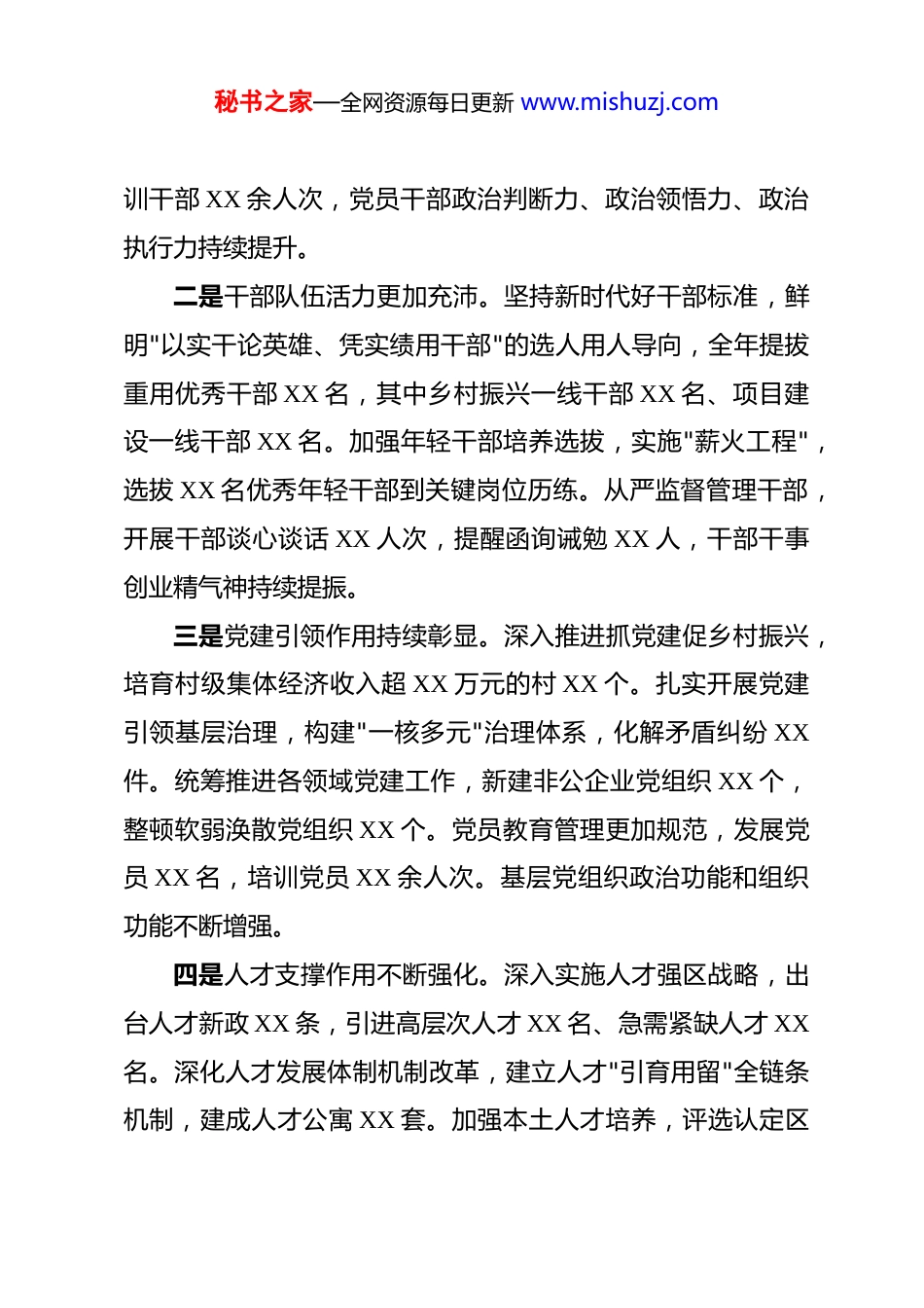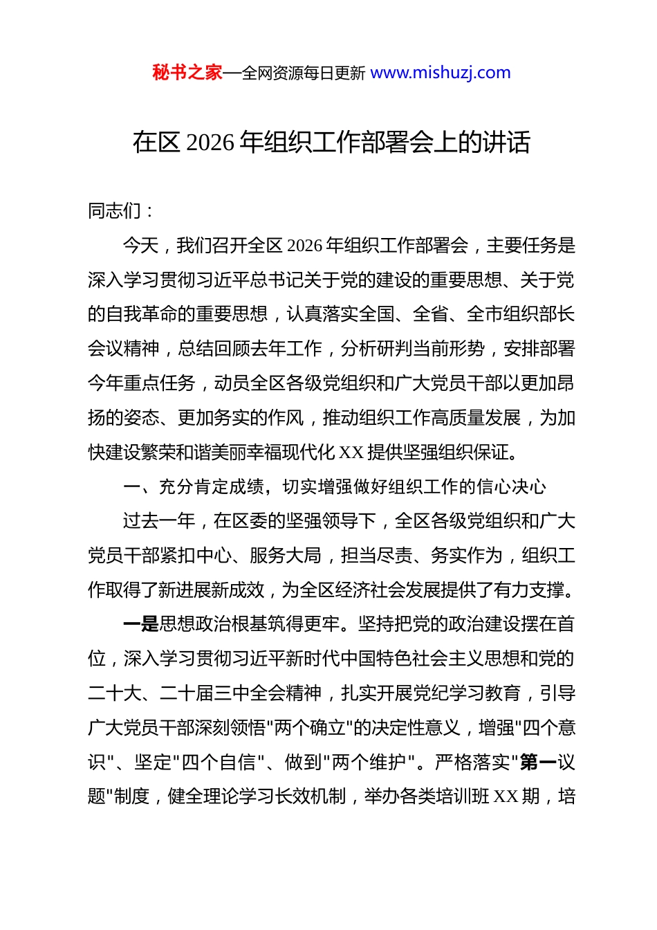 秘书之家—全网资源每日更新 www.mishuzj.com在区 2026 年组织工作部署会上的讲话 同志们:今天,我们召开全区 2026 年组织工作部署会,主要任务是深入学习贯彻习近平总书记关于党的建设的重要思想、关于党的自我革命的重要思想,认真落实全国、全省、全市组织部长会议精神,总结回顾去年工作,分析研判当前形势,安排部署今年重点任务,动员全区各级党组织和广大党员干部以更加昂扬的姿态、更加务实的作风,推动组织工作高质量发展,为加快建设繁荣和谐美丽幸福现代化 XX 提供坚强组织保证。一、充分肯定成绩,切实增强做好组织工作的信心决心过去一年,在区委的坚强领导下,全区各级党组织和广大党员干部紧扣中心、服务大局,担当尽责、务实作为,组织工作取得了新进展新成效,为全区经济社会发展提供了有力支撑。一是思想政治根基筑得更牢。坚持把党的政治建设摆在首位,深入学习贯彻习近平新时代中国特色社会主义思想和党的二十大、二十届三中全会精神,扎实开展党纪学习教育,引导广大党员干部深刻领悟"两个确立"的决定性意义,增强"四个意识"、坚定"四个自信"、做到"两个维护"。严格落实"第一议题"制度,健全理论学习长效机制,举办各类培训班 XX 期,培秘书之家—全网资源每日更新 www.mishuzj.com训干部 XX 余人次,党员干部政治判断力、政治领悟力、政治执行力持续提升。二是干部队伍活力更加充沛。坚持新时代好干部标准,鲜明"以实干论英雄、凭实绩用干部"的选人用人导向,全年提拔重用优秀干部 XX 名,其中乡村振兴一线干部 XX 名、项目建设一线干部 XX 名。加强年轻干部培养选拔,实施"薪火工程",选拔 XX 名优秀年轻干部到关键岗位历练。从严监督管理干部,开展干部谈心谈话 XX 人次,提醒函询诫勉 XX 人,干部干事创业精气神持续提振。三是党建引领作用持续彰显。深入推进抓党建促乡村振兴,培育村级集体经济收入超 XX 万元的村 XX 个。扎实开展党建引领基层治理,构建"一核多元"治理体系,化解矛盾纠纷 XX件。统筹推进各领域党建工作,新建非公企业党组织 XX 个,整顿软弱涣散党组织 XX 个。党员教育管理更加规范,发展党员 XX 名,培训党员 XX 余人次。基层党组织政治功能和组织功能不断增强。四是人才支撑作用不断强化。深入实施人才强区战略,出台人才新政 XX 条,引进高层次人才 XX 名、急需紧缺人才 XX名。深化人才发展体制机制改革,建立人才"引育用留"全链条机制,建成人才公寓 XX 套。加强本土人才培养,评选认定区秘书之家—全网资源每日更新 www.mishuzj.com级拔尖人才 XX 名,培养乡土人才 XX 名。人才发展环境持续优化,人才获得感、归属感不断增强。在肯定成绩的同时,也要清醒看到存在的问题和不足:少数基层党组织政治功能发挥不充分,战斗堡垒作用有待加强;个别干部能力素质与新形势新任务要求还有差距,担当精神有待提振;人才引进的精准性和实效性还需提高,人才结构有待优化。对此,必须高度重视,采取有效措施切实加以解决。二、准确把握形势,以更高站位谋划推进组织工作今年是"十五五"规划开局之年,也是县乡领导班子集中换届之年。站在新的历史起点上,组织工作面临新形势新任务新要求,必须准确把握、主动作为。从宏观大势看,全面从严治党向纵深推进,对组织工作提出更高要求。党的十八大以来,以习近平同志为核心的党中央把全面从严治党纳入"四个全面"战略布局,推动党的建设取得历史性成就。新时代新征程,党的建设新的伟大工程任务更加艰巨,组织工作必须在大局中找准定位、担当作为,以高质量组织工作服务保障高质量发展。从发展大局看,实现"十五五"良好开局,对组织工作提出更重任务。"十五五"时期是全面建设社会主义现代化国家的关键时期,区委确立了建设繁荣和谐美丽幸福现代化 XX 的奋斗秘书之家—全网资源每日更新 www.mishuzj.com目标,明确了经济社会发展的一系列重点任务。实现这些目标,关键在党、关键在人、关键在干部,组织工作必须更好发挥选贤任能、强基固本、聚才引智作用。从具体实际看,县乡领导班子集中换届,对组织工作提出更大考验。换届是政治生活中的一...