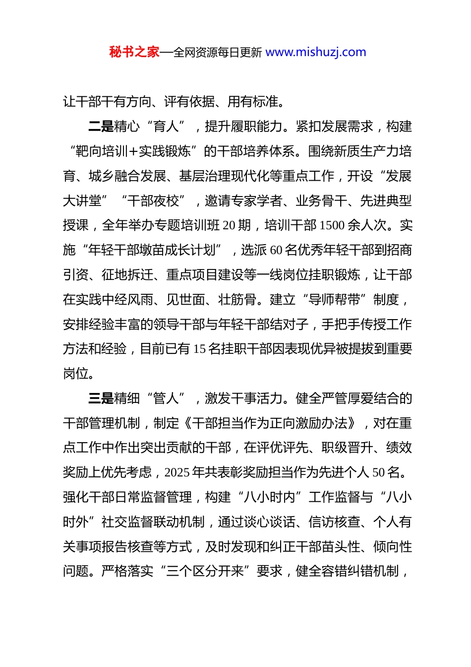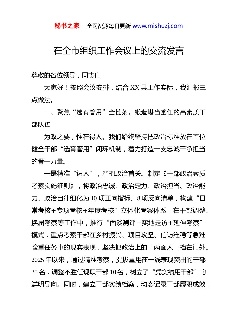 秘书之家—全网资源每日更新 www.mishuzj.com在全市组织工作会议上的交流发言 尊敬的各位领导,同志们:大家好!按照会议安排,结合 XX 县工作实际,我汇报三点做法。一、聚焦“选育管用”全链条,锻造堪当重任的高素质干部队伍为政之要,惟在得人。我们始终坚持把政治标准放在首位健全干部“选育管用”闭环机制,着力打造一支忠诚干净担当的骨干力量。一是精准“识人”,严把政治首关。制定《干部政治素质考察实施细则》,将政治忠诚、政治定力、政治担当、政治能力、政治自律细化为 10 项正向指标、8 项反向清单,构建“日常考核+专项考核+年度考核”立体化考察体系。在干部调整、换届考察等工作中,推行“面谈测评+实地走访+延伸考察”模式,重点考察干部在乡村振兴、项目攻坚、信访维稳等急难险重任务中的现实表现,坚决把政治上的“两面人”挡在门外。2025 年以来,通过精准考察,提拔重用在一线表现突出的干部35 名,调整不胜任现职干部 10 名,树立了“凭实绩用干部”的鲜明导向。同时,建立干部实绩档案,动态记录干部履职成效,秘书之家—全网资源每日更新 www.mishuzj.com让干部干有方向、评有依据、用有标准。二是精心“育人”,提升履职能力。紧扣发展需求,构建“靶向培训+实践锻炼”的干部培养体系。围绕新质生产力培育、城乡融合发展、基层治理现代化等重点工作,开设“发展大讲堂”“干部夜校”,邀请专家学者、业务骨干、先进典型授课,全年举办专题培训班 20 期,培训干部 1500 余人次。实施“年轻干部墩苗成长计划”,选派 60 名优秀年轻干部到招商引资、征地拆迁、重点项目建设等一线岗位挂职锻炼,让干部在实践中经风雨、见世面、壮筋骨。建立“导师帮带”制度,安排经验丰富的领导干部与年轻干部结对子,手把手传授工作方法和经验,目前已有 15 名挂职干部因表现优异被提拔到重要岗位。三是精细“管人”,激发干事活力。健全严管厚爱结合的干部管理机制,制定《干部担当作为正向激励办法》,对在重点工作中作出突出贡献的干部,在评优评先、职级晋升、绩效奖励上优先考虑,2025 年共表彰奖励担当作为先进个人 50 名。强化干部日常监督管理,构建“八小时内”工作监督与“八小时外”社交监督联动机制,通过谈心谈话、信访核查、个人有关事项报告核查等方式,及时发现和纠正干部苗头性、倾向性问题。严格落实“三个区分开来”要求,健全容错纠错机制,秘书之家—全网资源每日更新 www.mishuzj.com为敢于担当、踏实做事的干部撑腰鼓劲,2025 年以来共对 4 名干部予以容错纠错,营造了“为担当者担当、为负责者负责”的良好氛围。二、聚焦“强基固本”主抓手,筑牢引领基层治理的战斗堡垒基础不牢,地动山摇。我们始终坚持大抓基层的鲜明导向以提升组织力为重点,推动基层党组织全面进步、全面过硬。一是分类施策,建强基层战斗堡垒。制定《基层党组织标准化规范化建设三年行动计划》,分农村、社区、机关、两新组织等领域出台建设标准,明确组织设置、班子建设、党员管理、议事决策等 6 大类 28 项具体指标。采取“示范引领、分批推进”的方式,打造“五星级党支部”50 个,通过召开现场会、组织观摩学习等形式,以点带面推动全县基层党组织建设水平整体提升。针对农村党组织,实施“头雁领航”工程,选优配强村党组织书记,培育壮大村集体经济,2025 年全县村集体经济年收入 10 万元以上的村占比达到 88%;针对社区党组织,深化“红色物业”建设,构建“社区党组织+物业公司+业主委员会”三方联动机制,解决群众急难愁盼问题 260 余件;针对两新组织,开展“组织覆盖提质增效”行动,采取“单独建、联合建、挂靠建”等方式,新建两新党组织 18 个,实现应建尽秘书之家—全网资源每日更新 www.mishuzj.com建。二是党建引领,提升基层治理效能。健全“县委统筹、乡镇主导、村社抓落实”的基层治理体系,推行“党建+网格”治理模式,将全县划分为 300 个基础网格,配备网格员 600 名,把党支部建在网格上、党小组设在楼栋里、党员责任落实到家门口。常态化开展“党员联户”活动,组织全县 8500 余名党员联系服务...