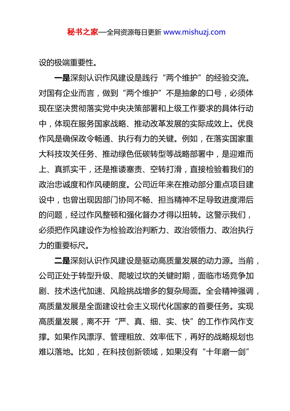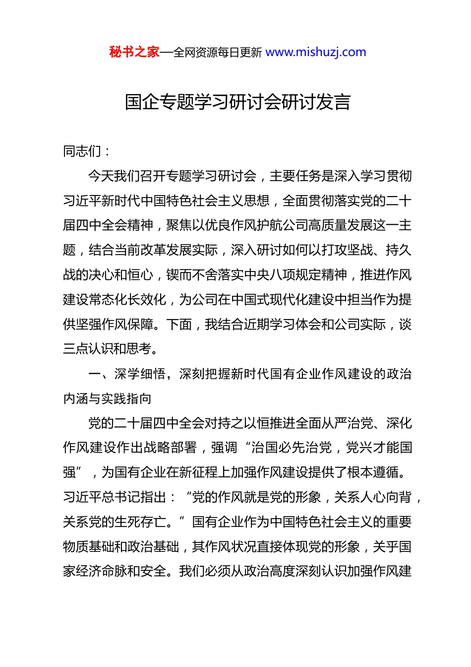 秘书之家—全网资源每日更新 www.mishuzj.com国企专题学习研讨会研讨发言 同志们:今天我们召开专题学习研讨会,主要任务是深入学习贯彻习近平新时代中国特色社会主义思想,全面贯彻落实党的二十届四中全会精神,聚焦以优良作风护航公司高质量发展这一主题,结合当前改革发展实际,深入研讨如何以打攻坚战、持久战的决心和恒心,锲而不舍落实中央八项规定精神,推进作风建设常态化长效化,为公司在中国式现代化建设中担当作为提供坚强作风保障。下面,我结合近期学习体会和公司实际,谈三点认识和思考。一、深学细悟,深刻把握新时代国有企业作风建设的政治内涵与实践指向党的二十届四中全会对持之以恒推进全面从严治党、深化作风建设作出战略部署,强调“治国必先治党,党兴才能国强”,为国有企业在新征程上加强作风建设提供了根本遵循。习近平总书记指出:“党的作风就是党的形象,关系人心向背,关系党的生死存亡。”国有企业作为中国特色社会主义的重要物质基础和政治基础,其作风状况直接体现党的形象,关乎国家经济命脉和安全。我们必须从政治高度深刻认识加强作风建秘书之家—全网资源每日更新 www.mishuzj.com设的极端重要性。一是深刻认识作风建设是践行“两个维护”的经验交流。对国有企业而言,做到“两个维护”不是抽象的口号,必须体现在坚决贯彻落实党中央决策部署和上级工作要求的具体行动中,体现在服务国家战略、推动改革发展的实际成效上。优良作风是确保政令畅通、执行有力的关键。例如,在落实国家重大科技攻关任务、推动绿色低碳转型等战略部署中,是迎难而上、真抓实干,还是推诿塞责、空转打滑,直接检验着我们的政治忠诚度和作风硬朗度。公司近年来在推动部分重点项目建设中,也曾出现因部门协同不畅、担当精神不足导致进度滞后的问题,经过作风整顿和强化督办才得以扭转。这警示我们,必须把作风建设作为检验政治判断力、政治领悟力、政治执行力的重要标尺。二是深刻认识作风建设是驱动高质量发展的动力源。当前,公司正处于转型升级、爬坡过坎的关键时期,面临市场竞争加剧、技术迭代加速、风险挑战增多的复杂局面。全会精神强调,高质量发展是全面建设社会主义现代化国家的首要任务。实现高质量发展,离不开“严、真、细、实、快”的工作作风作支撑。如果作风漂浮、管理粗放、效率低下,再好的战略规划也难以落地。比如,在科技创新领域,如果没有“十年磨一剑”秘书之家—全网资源每日更新 www.mishuzj.com的静气和“敢闯无人区”的锐气,就难以突破“卡脖子”技术;在市场竞争中,如果没有“客户至上、服务一流”的理念和快速响应机制,就难以赢得市场青睐。作风实则发展实,作风优则竞争力强。三是深刻认识作风建设是凝聚人心力量的黏合剂。国有企业的发展根基在职工群众,力量源泉也在职工群众。作风建设的核心是保持党同人民群众的血肉联系,在国有企业就具体体现为密切党群干群关系、凝聚全体职工合力。领导干部的作风形象,直接影响着职工队伍的士气和企业的向心力。如果存在官僚主义、脱离群众,甚至侵害职工利益的行为,就会涣散人心、削弱斗志。近年来,我们通过“领导接待日”“一线调研周”等方式,解决了一批职工关切的食堂伙食、通勤班车、技能培训等问题,有效提升了职工归属感。这充分说明,只有以优良作风密切联系职工,才能汇聚起攻坚克难的强大合力。二、对标检视,清醒正视当前公司作风建设存在的突出问题与深层症结近年来,公司党委坚持严字当头,狠抓作风建设,干部职工的精神面貌和干事创业状态总体向好,有力保障了生产经营和改革发展任务的推进。但对照党的二十届四中全会的高标准严要求,对照职工群众的新期待,对照高质量发展的迫切需要,秘书之家—全网资源每日更新 www.mishuzj.com我们的作风建设仍存在一些不容忽视的短板和问题,主要体现在“四个差距”上:一是政治站位与思想认识上存在“温差”。部分党员干部对作风建设的政治属性认识不深,认为作风建设主要是“约束行为”“规范礼仪”,未能从关乎党的执政基础、国有企业性质宗旨的高度来深刻把握。在落实中央八项规定精神及其实施细则时,有时存在“上紧下松...