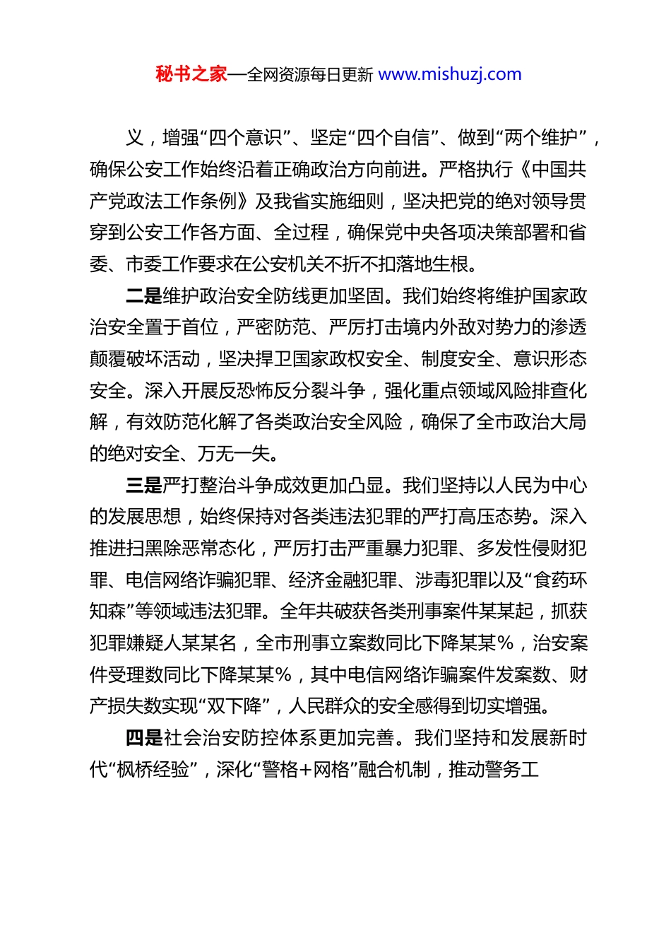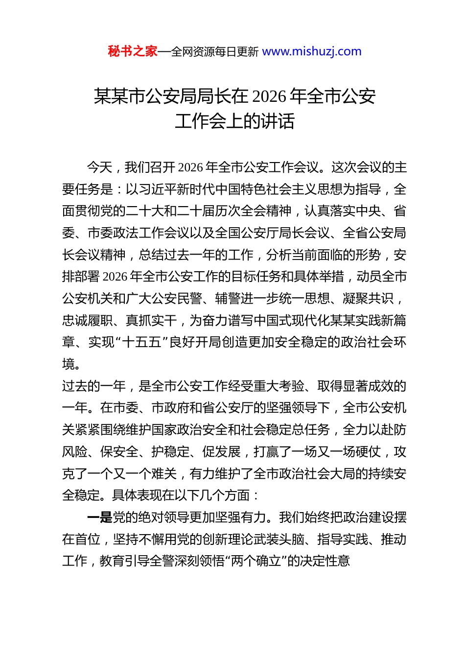 秘书之家—全网资源每日更新 www.mishuzj.com某某市公安局局长在 2026 年全市公安工作会上的讲话 今天,我们召开 2026 年全市公安工作会议。这次会议的主要任务是:以习近平新时代中国特色社会主义思想为指导,全面贯彻党的二十大和二十届历次全会精神,认真落实中央、省委、市委政法工作会议以及全国公安厅局长会议、全省公安局长会议精神,总结过去一年的工作,分析当前面临的形势,安排部署 2026 年全市公安工作的目标任务和具体举措,动员全市公安机关和广大公安民警、辅警进一步统一思想、凝聚共识,忠诚履职、真抓实干,为奋力谱写中国式现代化某某实践新篇“”章、实现 十五五 良好开局创造更加安全稳定的政治社会环境。过去的一年,是全市公安工作经受重大考验、取得显著成效的一年。在市委、市政府和省公安厅的坚强领导下,全市公安机关紧紧围绕维护国家政治安全和社会稳定总任务,全力以赴防风险、保安全、护稳定、促发展,打赢了一场又一场硬仗,攻克了一个又一个难关,有力维护了全市政治社会大局的持续安全稳定。具体表现在以下几个方面:一是党的绝对领导更加坚强有力。我们始终把政治建设摆在首位,坚持不懈用党的创新理论武装头脑、指导实践、推动“”工作,教育引导全警深刻领悟 两个确立 的决定性意秘书之家—全网资源每日更新 www.mishuzj.com“”“”“”义,增强 四个意识 、坚定 四个自信 、做到 两个维护 ,确保公安工作始终沿着正确政治方向前进。严格执行《中国共产党政法工作条例》及我省实施细则,坚决把党的绝对领导贯穿到公安工作各方面、全过程,确保党中央各项决策部署和省委、市委工作要求在公安机关不折不扣落地生根。二是维护政治安全防线更加坚固。我们始终将维护国家政治安全置于首位,严密防范、严厉打击境内外敌对势力的渗透颠覆破坏活动,坚决捍卫国家政权安全、制度安全、意识形态安全。深入开展反恐怖反分裂斗争,强化重点领域风险排查化解,有效防范化解了各类政治安全风险,确保了全市政治大局的绝对安全、万无一失。三是严打整治斗争成效更加凸显。我们坚持以人民为中心的发展思想,始终保持对各类违法犯罪的严打高压态势。深入推进扫黑除恶常态化,严厉打击严重暴力犯罪、多发性侵财犯“罪、电信网络诈骗犯罪、经济金融犯罪、涉毒犯罪以及 食药环”知森 等领域违法犯罪。全年共破获各类刑事案件某某起,抓获犯罪嫌疑人某某名,全市刑事立案数同比下降某某%,治安案件受理数同比下降某某%,其中电信网络诈骗案件发案数、财“”产损失数实现 双下降 ,人民群众的安全感得到切实增强。四是社会治安防控体系更加完善。我们坚持和发展新时“”代 枫桥经验 ,“深化 警格+”网格 融合机制,推动警务工秘书之家—全网资源每日更新 www.mishuzj.com作 与 社 会 治 理 深 度 融 合 。 加 强 社 会 面 巡 逻 防 控 , 优“化 1、3、5”分钟 快速反应机制,提高见警率、管事率和控制力、震慑力。强化重点行业、重点场所、重点物品的安全监管,排查整治各类安全隐患某某处。特别是面对去年我市文旅“”市场阶段性 流量出圈 带来的巨大安保压力,我们超前谋划、“周密部署、全警动员,实现了重大活动、重要节点 零差错、零”事故、零负面舆情 ,确保了社会面秩序平稳有序。五是警务运行机制改革更加深入。我们聚焦战斗力标准,“立足实战化要求,持续深化警务运行机制改革。优化 情指”行 一体化运行机制,提升预测预警预防和应急处突能力。推动“”“派出所 两队一室 改革提质增效,夯实基层基础。深化 放管”服 改革,推出了一系列便民利企新举措,在户籍、交管、出入“”境等领域实现了更多事项 网上办、掌上办、一次办 ,群众和企业办事更加便捷高效,服务经济社会发展的成色更足。六是公安铁军队伍建设更加扎实。我们严格落实全面从严管党治警要求,扎实开展主题教育,强化纪律作风教育整顿。加强实战化教育训练,组织开展各类专业培训和比武竞赛,队伍履职能力得到新提升。坚持严管厚爱结合、激励约束并重,落实从优待警各项措施,队伍的凝聚力、向心力、战斗力进一步增强...