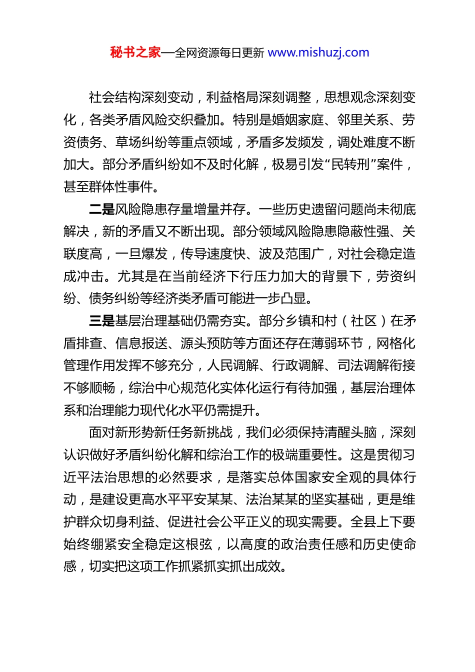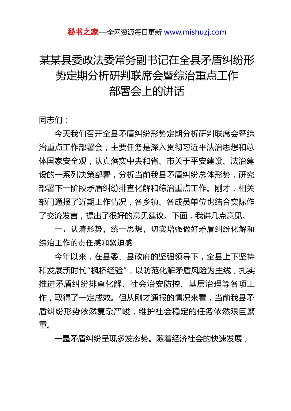 秘书之家—全网资源每日更新 www.mishuzj.com某某县委政法委常务副书记在全县矛盾纠纷形势定期分析研判联席会暨综治重点工作部署会上的讲话 同志们:今天我们召开全县矛盾纠纷形势定期分析研判联席会暨综治重点工作部署会,主要任务是深入贯彻习近平法治思想和总体国家安全观,认真落实中央和省、市关于平安建设、法治建设的一系列决策部署,分析当前我县矛盾纠纷总体形势,研究部署下一阶段矛盾纠纷排查化解和综治重点工作。刚才,相关部门通报了近期工作情况,各乡镇、各成员单位也结合实际作了交流发言,提出了很好的意见建议。下面,我讲几点意见。一、认清形势,统一思想,切实增强做好矛盾纠纷化解和综治工作的责任感和紧迫感今年以来,在县委、县政府的坚强领导下,全县上下坚持“”和发展新时代 枫桥经验 ,以防范化解矛盾风险为主线,扎实推进矛盾纠纷排查化解、社会治安防控、基层治理等各项工作,取得了一定成效。但从刚才通报的情况来看,当前我县矛盾纠纷形势依然复杂严峻,维护社会稳定的任务依然艰巨繁重。一是矛盾纠纷呈现多发态势。随着经济社会的快速发展,秘书之家—全网资源每日更新 www.mishuzj.com社会结构深刻变动,利益格局深刻调整,思想观念深刻变化,各类矛盾风险交织叠加。特别是婚姻家庭、邻里关系、劳资债务、草场纠纷等重点领域,矛盾多发频发,调处难度不断“”加大。部分矛盾纠纷如不及时化解,极易引发 民转刑 案件,甚至群体性事件。二是风险隐患存量增量并存。一些历史遗留问题尚未彻底解决,新的矛盾又不断出现。部分领域风险隐患隐蔽性强、关联度高,一旦爆发,传导速度快、波及范围广,对社会稳定造成冲击。尤其是在当前经济下行压力加大的背景下,劳资纠纷、债务纠纷等经济类矛盾可能进一步凸显。三是基层治理基础仍需夯实。部分乡镇和村(社区)在矛盾排查、信息报送、源头预防等方面还存在薄弱环节,网格化管理作用发挥不够充分,人民调解、行政调解、司法调解衔接不够顺畅,综治中心规范化实体化运行有待加强,基层治理体系和治理能力现代化水平仍需提升。面对新形势新任务新挑战,我们必须保持清醒头脑,深刻认识做好矛盾纠纷化解和综治工作的极端重要性。这是贯彻习近平法治思想的必然要求,是落实总体国家安全观的具体行动,是建设更高水平平安某某、法治某某的坚实基础,更是维护群众切身利益、促进社会公平正义的现实需要。全县上下要始终绷紧安全稳定这根弦,以高度的政治责任感和历史使命感,切实把这项工作抓紧抓实抓出成效。秘书之家—全网资源每日更新 www.mishuzj.com二、聚焦重点,靶向发力,扎实推动矛盾纠纷排查化解走深走实“做好矛盾纠纷排查化解工作,关键在于 预防在前、调解优”先、依法处置、源头治理 。我们要坚持问题导向,紧盯重点领域、重点人群、重点环节,下好先手棋,打好主动仗。(一)坚持预防为主,筑牢源头防线。要健全完善常态化排查机制,组织力量下沉到村(社区)、网格、工地、牧区等“”一线,做到 底数清、情况明、早发现、早调处 。要充分发挥网格员、人民调解员、村(社区)“”干部、 法律明白人 等基层力量的作用,织密织牢矛盾纠纷排查网络。要加强对重点领域、重点行业、重点群体的动态监测和分析研判,及时发现苗头性、倾向性问题,提前介入、有效干预,防止小事拖大、大事拖炸。(二)坚持调解优先,多元化解纷争。要充分发挥人民调“解 第一”道防线 作用,健全完善县、乡、村三级调解网络,提高调解工作的专业化、规范化水平。要积极拓展行业性、专业性调解组织,在劳动争议、交通事故、医疗纠纷、物业管理等领域,引入专业力量参与调解。要健全诉调对接、警调对接、访调对接机制,推动行政调解、司法调解与人民调解有效衔“接、优势互补。要探索 互联网+”调解 模式,为当事人提供更加便捷高效的调解服务。对于调解不成的矛盾纠纷,要引导当事人依法理性表达诉求,通过诉讼、仲裁等秘书之家—全网资源每日更新 www.mishuzj.com法律途径解决,防止矛盾激化。(三)坚持依法处置,维护法治权威。要善于运用法治思维和法治方式化解矛盾、维护稳定。在处理信访问题、...