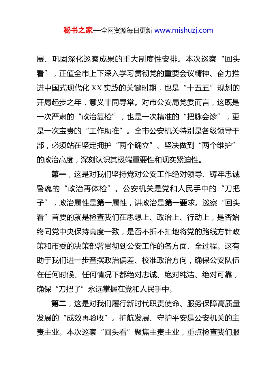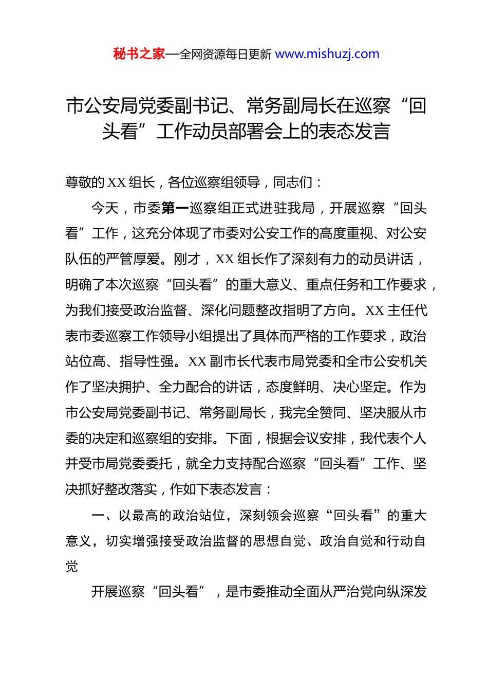 秘书之家—全网资源每日更新 www.mishuzj.com市公安局党委副书记、常务副局长在巡察“回头看”工作动员部署会上的表态发言 尊敬的 XX 组长,各位巡察组领导,同志们:今天,市委第一巡察组正式进驻我局,开展巡察“回头看”工作,这充分体现了市委对公安工作的高度重视、对公安队伍的严管厚爱。刚才,XX 组长作了深刻有力的动员讲话,明确了本次巡察“回头看”的重大意义、重点任务和工作要求,为我们接受政治监督、深化问题整改指明了方向。XX 主任代表市委巡察工作领导小组提出了具体而严格的工作要求,政治站位高、指导性强。XX 副市长代表市局党委和全市公安机关作了坚决拥护、全力配合的讲话,态度鲜明、决心坚定。作为市公安局党委副书记、常务副局长,我完全赞同、坚决服从市委的决定和巡察组的安排。下面,根据会议安排,我代表个人并受市局党委委托,就全力支持配合巡察“回头看”工作、坚决抓好整改落实,作如下表态发言:一、以最高的政治站位,深刻领会巡察“回头看”的重大意义,切实增强接受政治监督的思想自觉、政治自觉和行动自觉开展巡察“回头看”,是市委推动全面从严治党向纵深发秘书之家—全网资源每日更新 www.mishuzj.com展、巩固深化巡察成果的重大制度性安排。本次巡察“回头看”,正值全市上下深入学习贯彻党的重要会议精神、奋力推进中国式现代化 XX 实践的关键时期,也是“十五五”规划的开局起步之年,意义非同寻常。对市公安局党委而言,这既是一次严肃的“政治复检”,也是一次精准的“把脉会诊”,更是一次宝贵的“工作助推”。全市公安机关特别是各级领导干部,必须站在坚定拥护“两个确立”、坚决做到“两个维护”的政治高度,深刻认识其极端重要性和现实紧迫性。第一,这是对我们坚持党对公安工作绝对领导、铸牢忠诚警魂的“政治再体检”。公安机关是党和人民手中的“刀把子”,政治属性是第一属性,讲政治是第一要求。巡察“回头看”首要的就是检查我们在思想上、政治上、行动上,是否始终同党中央保持高度一致,是否不折不扣地将党的路线方针政策和市委的决策部署贯彻到公安工作的各方面、全过程。这有助于我们进一步查摆政治偏差、校准政治方向,确保公安队伍在任何时候、任何情况下都绝对忠诚、绝对纯洁、绝对可靠,确保“刀把子”永远掌握在党和人民手中。第二,这是对我们履行新时代职责使命、服务保障高质量发展的“成效再验收”。护航发展、守护平安是公安机关的主责主业。本次巡察“回头看”聚焦主责主业,重点检查我们服秘书之家—全网资源每日更新 www.mishuzj.com务保障经济社会发展、防范化解重大安全风险、提升执法司法质效等方面的情况。这实际上是对我们过去一个阶段工作成效的全面评估和再次检验。通过巡察组的专业视角和深入检查,能够帮助我们更精准地发现工作理念、机制、能力、作风上与新时代新要求不相适应的地方,特别是执法办案、服务群众、风险防控中的短板弱项,从而推动我们更好地统筹发展与安全,以更高水平的平安法治服务保障 XX 高质量发展。第三,这是对我们践行正确政绩观、整治群众身边不正之风和腐败问题的“作风再淬炼”。巡察是党内监督的“前哨”,是发现问题的“尖兵”。本次“回头看”将整治群众身边的不正之风和腐败问题作为重要内容,直指作风建设的要害。公安工作直面社会、直面群众,一言一行关乎党和政府形象。巡察组的深入监督,将帮助我们更深层次地检视是否存在形式主义、官僚主义问题,是否存在漠视侵害群众利益的行为,是否存在执法不公、司法不廉甚至腐败现象。这必将有力推动全市公安机关进一步树立和践行正确权力观、政绩观、事业观,持续净化警营政治生态,让人民群众在每一起案件办理、每一件事情处理中都能感受到公平正义,不断提升安全感和满意度。第四,这是对我们强化班子队伍建设、推进全面从严管党治警的“责任再压实”。班子强则队伍强,队伍强则事业兴。秘书之家—全网资源每日更新 www.mishuzj.com巡察“回头看”重点检查班子建设、选人用人、全面从严治党主体责任落实等情况。这既是对市局党委班子的一次“政治扫描”,也是对全市公安机关各级领导班子和干部队...