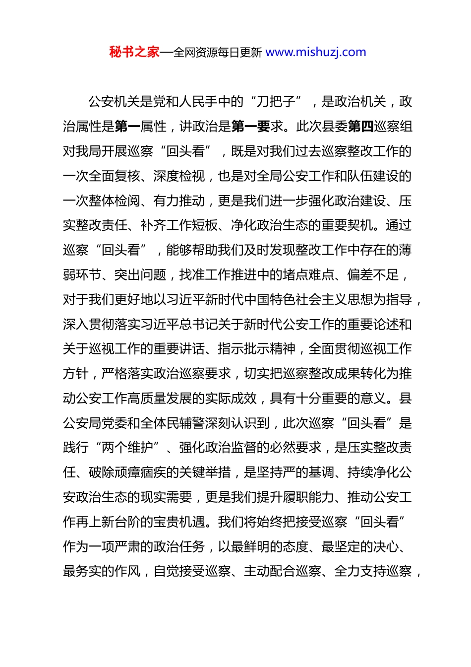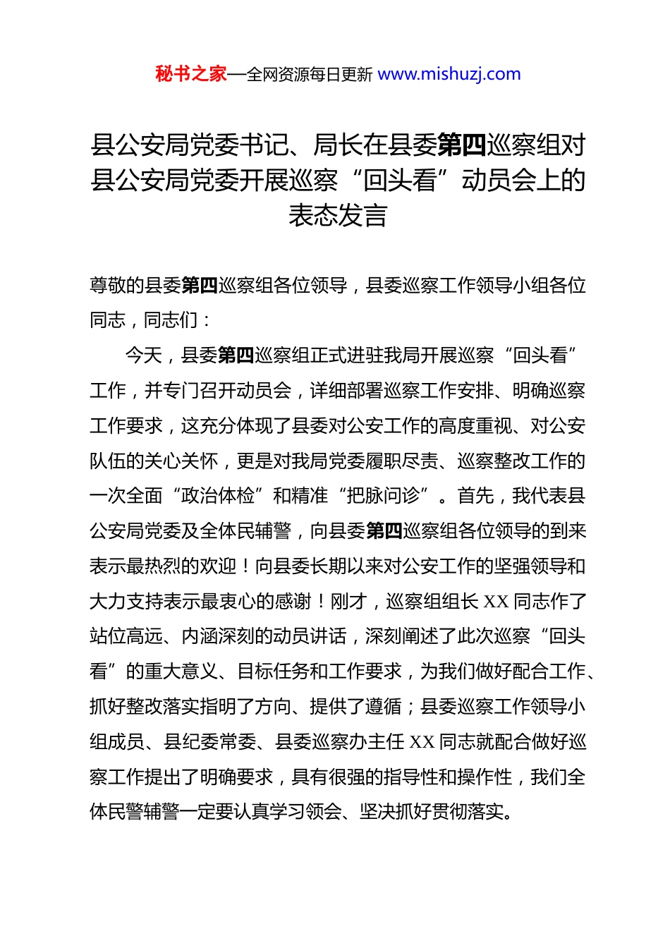 秘书之家—全网资源每日更新 www.mishuzj.com县公安局党委书记、局长在县委第四巡察组对县公安局党委开展巡察“回头看”动员会上的表态发言 尊敬的县委第四巡察组各位领导,县委巡察工作领导小组各位同志,同志们:今天,县委第四巡察组正式进驻我局开展巡察“回头看”工作,并专门召开动员会,详细部署巡察工作安排、明确巡察工作要求,这充分体现了县委对公安工作的高度重视、对公安队伍的关心关怀,更是对我局党委履职尽责、巡察整改工作的一次全面“政治体检”和精准“把脉问诊”。首先,我代表县公安局党委及全体民辅警,向县委第四巡察组各位领导的到来表示最热烈的欢迎!向县委长期以来对公安工作的坚强领导和大力支持表示最衷心的感谢!刚才,巡察组组长 XX 同志作了站位高远、内涵深刻的动员讲话,深刻阐述了此次巡察“回头看”的重大意义、目标任务和工作要求,为我们做好配合工作、抓好整改落实指明了方向、提供了遵循;县委巡察工作领导小组成员、县纪委常委、县委巡察办主任 XX 同志就配合做好巡察工作提出了明确要求,具有很强的指导性和操作性,我们全体民警辅警一定要认真学习领会、坚决抓好贯彻落实。秘书之家—全网资源每日更新 www.mishuzj.com公安机关是党和人民手中的“刀把子”,是政治机关,政治属性是第一属性,讲政治是第一要求。此次县委第四巡察组对我局开展巡察“回头看”,既是对我们过去巡察整改工作的一次全面复核、深度检视,也是对全局公安工作和队伍建设的一次整体检阅、有力推动,更是我们进一步强化政治建设、压实整改责任、补齐工作短板、净化政治生态的重要契机。通过巡察“回头看”,能够帮助我们及时发现整改工作中存在的薄弱环节、突出问题,找准工作推进中的堵点难点、偏差不足,对于我们更好地以习近平新时代中国特色社会主义思想为指导,深入贯彻落实习近平总书记关于新时代公安工作的重要论述和关于巡视工作的重要讲话、指示批示精神,全面贯彻巡视工作方针,严格落实政治巡察要求,切实把巡察整改成果转化为推动公安工作高质量发展的实际成效,具有十分重要的意义。县公安局党委和全体民辅警深刻认识到,此次巡察“回头看”是践行“两个维护”、强化政治监督的必然要求,是压实整改责任、破除顽瘴痼疾的关键举措,是坚持严的基调、持续净化公安政治生态的现实需要,更是我们提升履职能力、推动公安工作再上新台阶的宝贵机遇。我们将始终把接受巡察“回头看”作为一项严肃的政治任务,以最鲜明的态度、最坚定的决心、最务实的作风,自觉接受巡察、主动配合巡察、全力支持巡察,秘书之家—全网资源每日更新 www.mishuzj.com坚决服从巡察组的各项工作安排,确保此次巡察“回头看”工作顺利开展、取得实效。下面,我代表县公安局党委,作四点表态发言:一、提高政治站位,深刻领悟巡察“回头看”的核心要义切实把思想和行动统一到县委决策部署上来党的十八大以来,以习近平同志为核心的党中央高度重视巡视巡察工作,将其作为推进全面从严治党、强化党内监督的重要战略性制度安排,巡视巡察的政治性、权威性、针对性不断增强。巡察“回头看”是巡视巡察工作的重要组成部分,是对前期巡察整改工作的“再体检”“再督促”,更是对党员干部政治担当的“再考验”“再锤炼”。县委部署此次巡察“回头看”,既是对县委各项决策部署在公安系统落地落实情况的监督检查,也是对我们公安队伍凝聚力、战斗力、执行力的实际检验。县公安局党委将始终把政治建设摆在首位,深刻领悟“两个确立”的决定性意义,增强“四个意识”、坚定“四个自信”、做到“两个维护”,切实把思想和行动统一到县委的决策部署上来,统一到巡察组的工作要求上来。全体班子成员、各科室所队负责人和全体党员干部要牢固树立“一盘棋”思想,把配合支持巡察“回头看”工作作为重要的政治纪律和政治规秘书之家—全网资源每日更新 www.mishuzj.com矩,深刻认识到巡察“回头看”不是“回头翻账”,而是“查漏补缺”;不是“挑刺找茬”,而是“精准帮扶”,真正从思想上高度重视、政治上高度清醒、行动上高度自觉,坚决摒弃任何敷衍应付、消极抵触的思想,坚决杜绝任何遮...