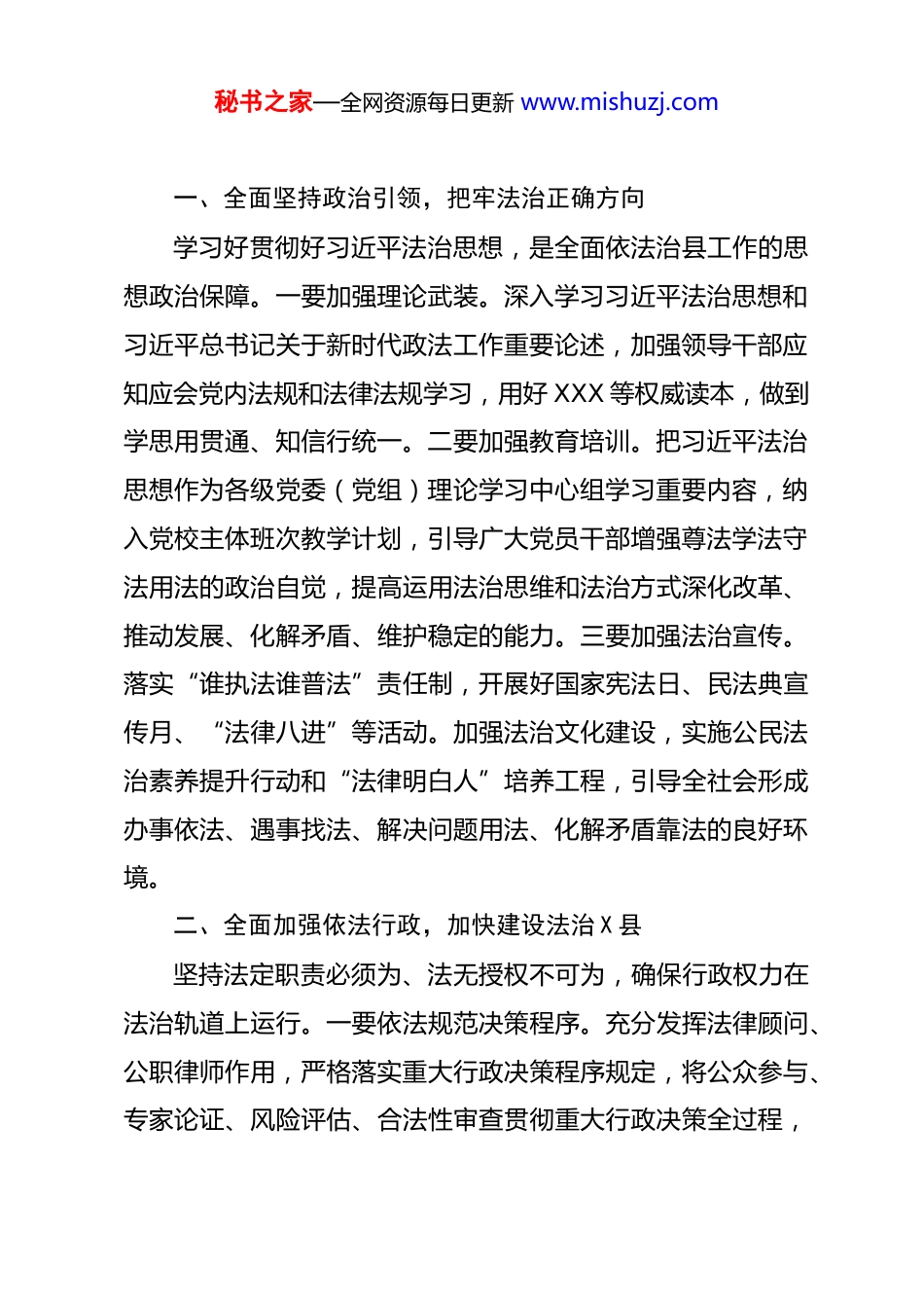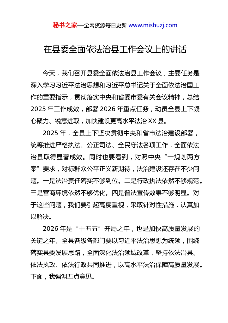 秘书之家—全网资源每日更新 www.mishuzj.com在县委全面依法治县工作会议上的讲话今天,我们召开县委全面依法治县工作会议,主要任务是深入学习习近平法治思想和习近平总书记关于全面依法治国工作的重要指示,贯彻落实中央和省委市委有关会议精神,总结2025 年工作成效,部署 2026 年重点任务,动员全县上下凝心聚力、锐意进取,加快建设更高水平法治 XX 县。2025 年,全县上下坚决贯彻中央和省市法治建设部署,统筹推进严格执法、公正司法、全民守法各项工作,全面依法治县取得显著成效。同时也要看到,对照中央“一规划两方案”要求,对标群众公平正义新期待,法治建设还存在不少问题。一是法治责任落实不够到位。二是行政执法依然不够规范。三是营商环境依然不够优化。四是普法宣传效果不够明显。对于这些问题,我们要引起高度重视,采取针对性措施,认真加以解决。2026 年是“十五五”开局之年,也是加快高质量发展的关键之年。全县各级各部门要以习近平法治思想为统领,围绕落实县委发展思路,全面深化法治领域改革,坚持依法治县、依法执政、依法行政共同推进,以高水平法治保障高质量发展。下面,我强调五点意见。秘书之家—全网资源每日更新 www.mishuzj.com一、全面坚持政治引领,把牢法治正确方向学习好贯彻好习近平法治思想,是全面依法治县工作的思想政治保障。一要加强理论武装。深入学习习近平法治思想和习近平总书记关于新时代政法工作重要论述,加强领导干部应知应会党内法规和法律法规学习,用好 XXX 等权威读本,做到学思用贯通、知信行统一。二要加强教育培训。把习近平法治思想作为各级党委(党组)理论学习中心组学习重要内容,纳入党校主体班次教学计划,引导广大党员干部增强尊法学法守法用法的政治自觉,提高运用法治思维和法治方式深化改革、推动发展、化解矛盾、维护稳定的能力。三要加强法治宣传。落实“谁执法谁普法”责任制,开展好国家宪法日、民法典宣传月、“法律八进”等活动。加强法治文化建设,实施公民法治素养提升行动和“法律明白人”培养工程,引导全社会形成办事依法、遇事找法、解决问题用法、化解矛盾靠法的良好环境。二、全面加强依法行政,加快建设法治 X 县坚持法定职责必须为、法无授权不可为,确保行政权力在法治轨道上运行。一要依法规范决策程序。充分发挥法律顾问、公职律师作用,严格落实重大行政决策程序规定,将公众参与、专家论证、风险评估、合法性审查贯彻重大行政决策全过程,秘书之家—全网资源每日更新 www.mishuzj.com建立重大决策终身责任追究和倒查机制,防止因违法决策、不当决策引发社会风险、造成重大损失。二要依法规范行政执法。扎实开展规范涉企执法专项行动,全面推行“综合查一次”“亮码检查”“扫码入企”等执法模式,集中整治乱收费、乱罚款、乱检查、乱查封以及违规异地执法、趋利性执法、知法犯法、一刀切执法、简单粗暴执法等突出问题,让企业专心经营、安心发展。三要用好行政复议主渠道。加强行政复议队伍建设,配齐配强法律专业人员,提升案件审理专业性公正性。要健全行政复议与信访、调解、仲裁、诉讼之间的衔接协同机制,对复议纠错、诉讼败诉案件进行深度剖析,推动源头治理与机制完善,发挥行政复议对行政执法的纠偏功能。三、全面推进公正司法,维护社会公平正义坚持以法为据、以理服人、以情感人,努力实现法律效果政治效果、社会效果相统一。一要完善司法工作机制。健全完善监察机关、公安机关、检察机关、审判机关、司法行政机关各司其职,监察权、侦查权、检察权、审判权、执行权相互配合、相互制约的工作机制,确保执法司法各环节全过程在有效制约监督下运行。二要规范司法权力运行。严格落实立案登记制度,规立案和调解工作,坚决做到应立必立、能调则调、当判则判。要坚决整治消极执行、选择性执行、违规终结执行等秘书之家—全网资源每日更新 www.mishuzj.com“执行难”问题。三要加强司法监督工作。完善和落实好人民陪审员、人民监督员制度,拓宽群众参与司法监督渠道。各级党政部门和领导干部要支持司法机关依法独立行使职权,坚决落实防止干预司法“三个规定”。...