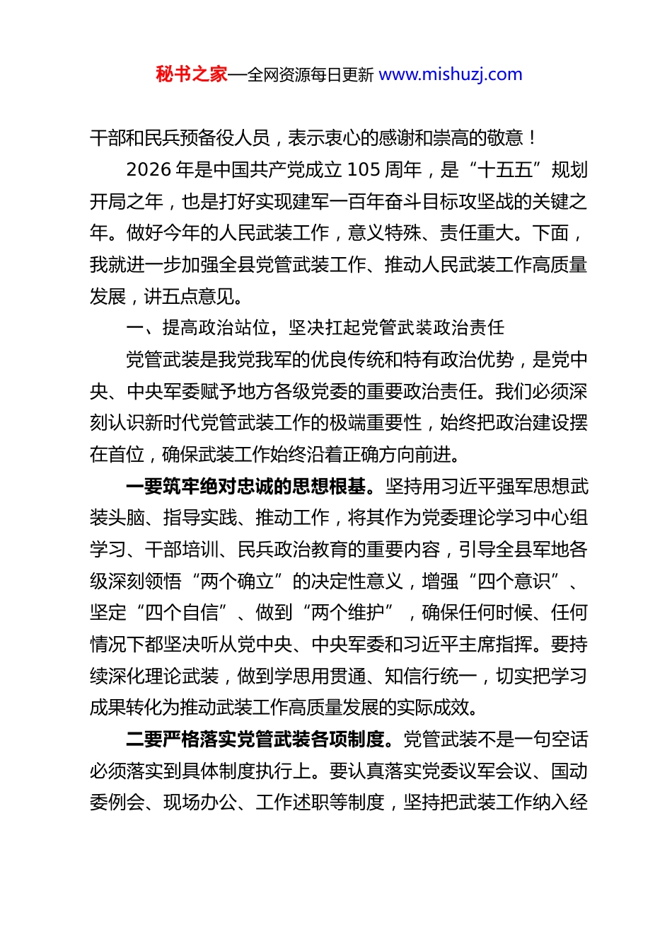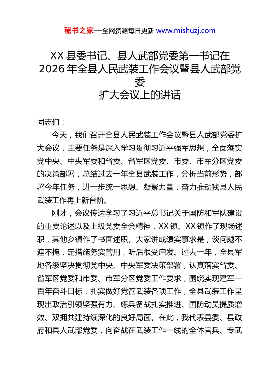 秘书之家—全网资源每日更新 www.mishuzj.comXX 县委书记、县人武部党委第一书记在2026 年全县人民武装工作会议暨县人武部党委扩大会议上的讲话同志们:今天,我们召开全县人民武装工作会议暨县人武部党委扩大会议,主要任务是深入学习贯彻习近平强军思想,全面落实党中央、中央军委和省委、省军区党委、市委、市军分区党委的决策部署,总结过去一年全县武装工作,分析当前形势,部署今年任务,进一步统一思想、凝聚力量,奋力推动我县人民武装工作再上新台阶。刚才,会议传达学习了习近平总书记关于国防和军队建设的重要论述以及上级党委全会精神,XX 镇、XX 镇作了现场述职,其他乡镇作了书面述职。大家讲成绩实事求是,谈问题不遮不掩,定措施务实管用,听后很受启发。过去一年,全县军地各级坚决贯彻党中央、中央军委决策部署,认真落实省委、省军区党委和市委、市军分区党委工作要求,围绕实现建军一百年奋斗目标,扎实做好党管武装各项工作,全县武装工作呈现出政治引领坚强有力、练兵备战扎实推进、国防动员提质增效、双拥共建持续深化的良好局面。在此,我代表县委、县政府和县人武部党委,向奋战在武装工作一线的全体官兵、专武秘书之家—全网资源每日更新 www.mishuzj.com干部和民兵预备役人员,表示衷心的感谢和崇高的敬意!2026 年是中国共产党成立 105 周年,是“十五五”规划开局之年,也是打好实现建军一百年奋斗目标攻坚战的关键之年。做好今年的人民武装工作,意义特殊、责任重大。下面,我就进一步加强全县党管武装工作、推动人民武装工作高质量发展,讲五点意见。一、提高政治站位,坚决扛起党管武装政治责任党管武装是我党我军的优良传统和特有政治优势,是党中央、中央军委赋予地方各级党委的重要政治责任。我们必须深刻认识新时代党管武装工作的极端重要性,始终把政治建设摆在首位,确保武装工作始终沿着正确方向前进。一要筑牢绝对忠诚的思想根基。坚持用习近平强军思想武装头脑、指导实践、推动工作,将其作为党委理论学习中心组学习、干部培训、民兵政治教育的重要内容,引导全县军地各级深刻领悟“两个确立”的决定性意义,增强“四个意识”、坚定“四个自信”、做到“两个维护”,确保任何时候、任何情况下都坚决听从党中央、中央军委和习近平主席指挥。要持续深化理论武装,做到学思用贯通、知信行统一,切实把学习成果转化为推动武装工作高质量发展的实际成效。二要严格落实党管武装各项制度。党管武装不是一句空话必须落实到具体制度执行上。要认真落实党委议军会议、国动委例会、现场办公、工作述职等制度,坚持把武装工作纳入经秘书之家—全网资源每日更新 www.mishuzj.com济社会发展总体规划、纳入党委政府重要议事日程、纳入领导干部考核评价体系,做到经济社会发展与国防建设两副担子一起挑、两项任务一起抓。各级党委书记作为党管武装第一责任人,要亲自抓、带头干,定期听取武装工作汇报,及时研究解决矛盾问题,真正做到知责于心、担责于身、履责于行。三要准确把握当前面临的形势任务。当前,世界百年未有之大变局加速演进,我国安全形势复杂严峻,国防和军队建设进入新阶段,对人民武装工作提出了新的更高要求。我们要胸怀“国之大者”,深刻认识加强国防动员和后备力量建设是应对复杂安全威胁的战略支撑,是巩固提高一体化国家战略体系和能力的重要基础,切实增强抓好武装工作的责任感和紧迫感。要自觉把武装工作放在强国强军事业全局中谋划推进,以更高标准、更严要求、更实举措,推动党管武装工作落地见效。二、聚焦练兵备战,持续提升遂行任务能力能打仗、打胜仗是军队的根本职能,也是人民武装工作的核心指向。我们要牢固树立战斗力这个唯一的根本的标准,大抓实战化军事训练,全面提升应急应战能力。一要突出练兵备战主责主业。坚持按纲施训、从严治训,严格落实民兵军事训练大纲要求,科学制定年度训练计划,广泛开展群众性练兵比武活动。要紧贴遂行多样化军事任务需求,突出抓好应急维稳、抢险救灾、支援保障等针对性训练,练强指挥能力,练好战斗本领,练硬战斗作风。要加大实案化、实秘书之家—全网资源每日更新 ww...
