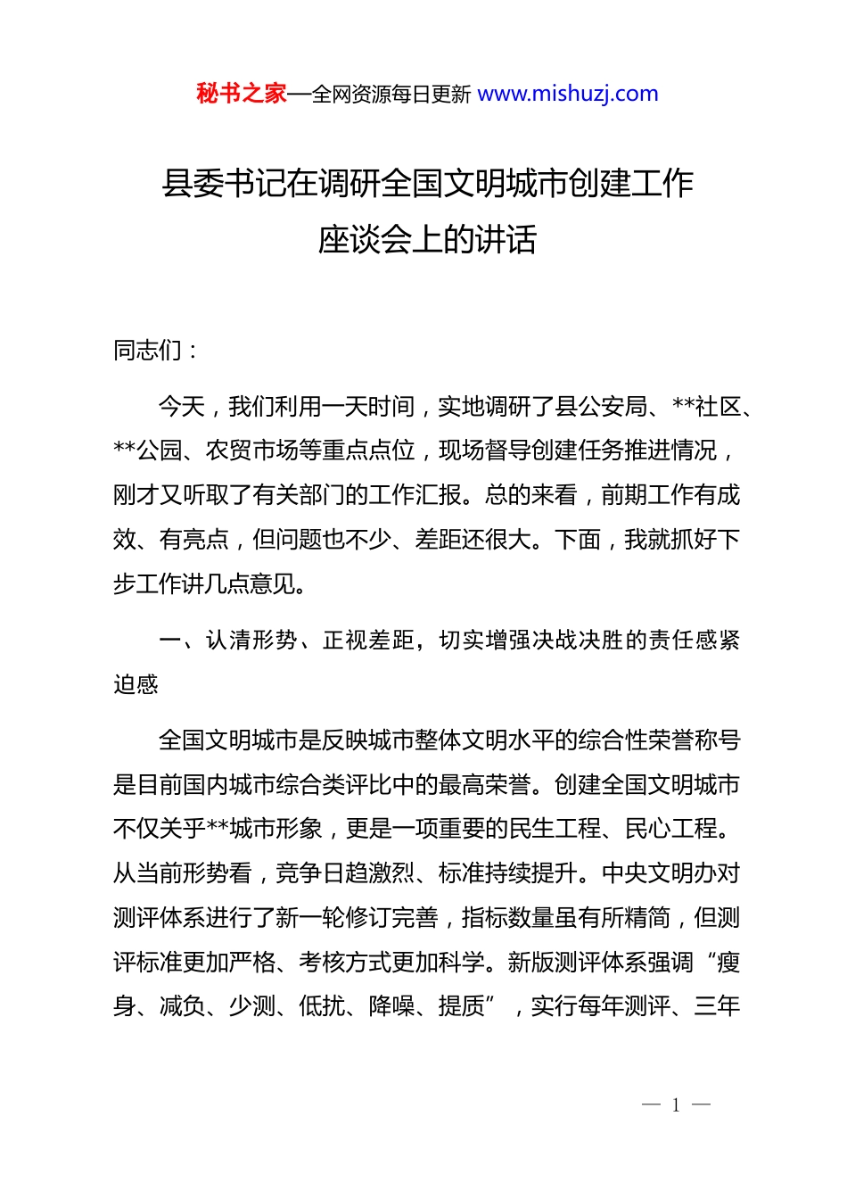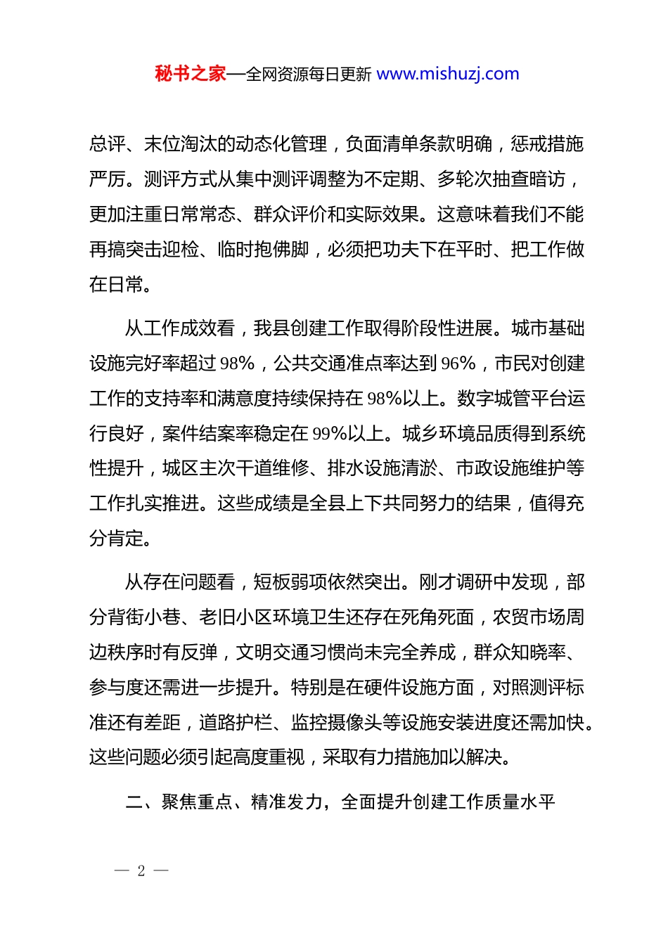 秘书之家—全网资源每日更新 www.mishuzj.com县委书记在调研全国文明城市创建工作座谈会上的讲话同志们:今天,我们利用一天时间,实地调研了县公安局、**社区、**公园、农贸市场等重点点位,现场督导创建任务推进情况,刚才又听取了有关部门的工作汇报。总的来看,前期工作有成效、有亮点,但问题也不少、差距还很大。下面,我就抓好下步工作讲几点意见。一、认清形势、正视差距,切实增强决战决胜的责任感紧迫感全国文明城市是反映城市整体文明水平的综合性荣誉称号是目前国内城市综合类评比中的最高荣誉。创建全国文明城市不仅关乎**城市形象,更是一项重要的民生工程、民心工程。从当前形势看,竞争日趋激烈、标准持续提升。中央文明办对测评体系进行了新一轮修订完善,指标数量虽有所精简,但测评标准更加严格、考核方式更加科学。新版测评体系强调“瘦身、减负、少测、低扰、降噪、提质”,实行每年测评、三年— 1 —秘书之家—全网资源每日更新 www.mishuzj.com总评、末位淘汰的动态化管理,负面清单条款明确,惩戒措施严厉。测评方式从集中测评调整为不定期、多轮次抽查暗访,更加注重日常常态、群众评价和实际效果。这意味着我们不能再搞突击迎检、临时抱佛脚,必须把功夫下在平时、把工作做在日常。从工作成效看,我县创建工作取得阶段性进展。城市基础设施完好率超过 98%,公共交通准点率达到 96%,市民对创建工作的支持率和满意度持续保持在 98%以上。数字城管平台运行良好,案件结案率稳定在 99%以上。城乡环境品质得到系统性提升,城区主次干道维修、排水设施清淤、市政设施维护等工作扎实推进。这些成绩是全县上下共同努力的结果,值得充分肯定。从存在问题看,短板弱项依然突出。刚才调研中发现,部分背街小巷、老旧小区环境卫生还存在死角死面,农贸市场周边秩序时有反弹,文明交通习惯尚未完全养成,群众知晓率、参与度还需进一步提升。特别是在硬件设施方面,对照测评标准还有差距,道路护栏、监控摄像头等设施安装进度还需加快。这些问题必须引起高度重视,采取有力措施加以解决。二、聚焦重点、精准发力,全面提升创建工作质量水平— 2 —秘书之家—全网资源每日更新 www.mishuzj.com创建全国文明城市是一项系统工程,必须突出重点、统筹推进,在关键环节上集中攻坚、务求突破。第一,着力补齐硬件设施短板。硬件设施是城市文明的物质基础,也是测评的重要内容。要坚持问题导向,对照测评标准逐项排查、逐项整改、逐项达标。要加快推进道路护栏、监控摄像头安装等工作,优先保障重点点位标准化建设。数据显示,我县城市基础设施完好率已超过 98%,但这还不够,要确保各项硬件指标全面达标。要统筹推进老旧小区改造、背街小巷整治、公共厕所建设、无障碍设施完善等工作,切实改善群众生活环境。要加快数字城管系统建设,运用物联网、大数据、人工智能等现代信息技术提升城市管理智能化水平。目前我县数字城管平台案件结案率达到 99%以上,要进一步发挥平台作用,提高问题发现、派遣、处置、反馈效率。第二,持续浓厚创建宣传氛围。创建工作需要全民参与,没有群众的积极参与和广泛支持,创建工作就成了无源之水、无本之木。要统筹用好县级宣传载体,持续深化“小手拉大手”、文明红黑榜等活动,推动各社区同步发力、同向发力。要深入开展“敲门行动”,层层开展宣传动员,强化市民素质教育,引导群众自觉支持参与创建,营造人人关心、人人支持、— 3 —秘书之家—全网资源每日更新 www.mishuzj.com人人参与的浓厚氛围。要注重发挥先进典型示范引领作用,大力宣传文明市民、文明家庭、文明单位等先进事迹,用身边事教育身边人,提升群众对创建工作的知晓率、参与度和满意度。从各地经验看,群众满意度是检验创建成效的重要标尺,群众满意度达到 92%以上的社区,创建工作基础就更加扎实。第三,扎实开展环境综合整治。环境卫生是城市文明的第一印象。要聚焦背街小巷、老旧小区、公园广场、农贸市场等重点区域和薄弱环节,全面开展环境卫生大清理大整治,持续改善城市人居环境。要扎实开展“扫街行动”,做到全覆盖、无死角。要加强农贸市场管理...
