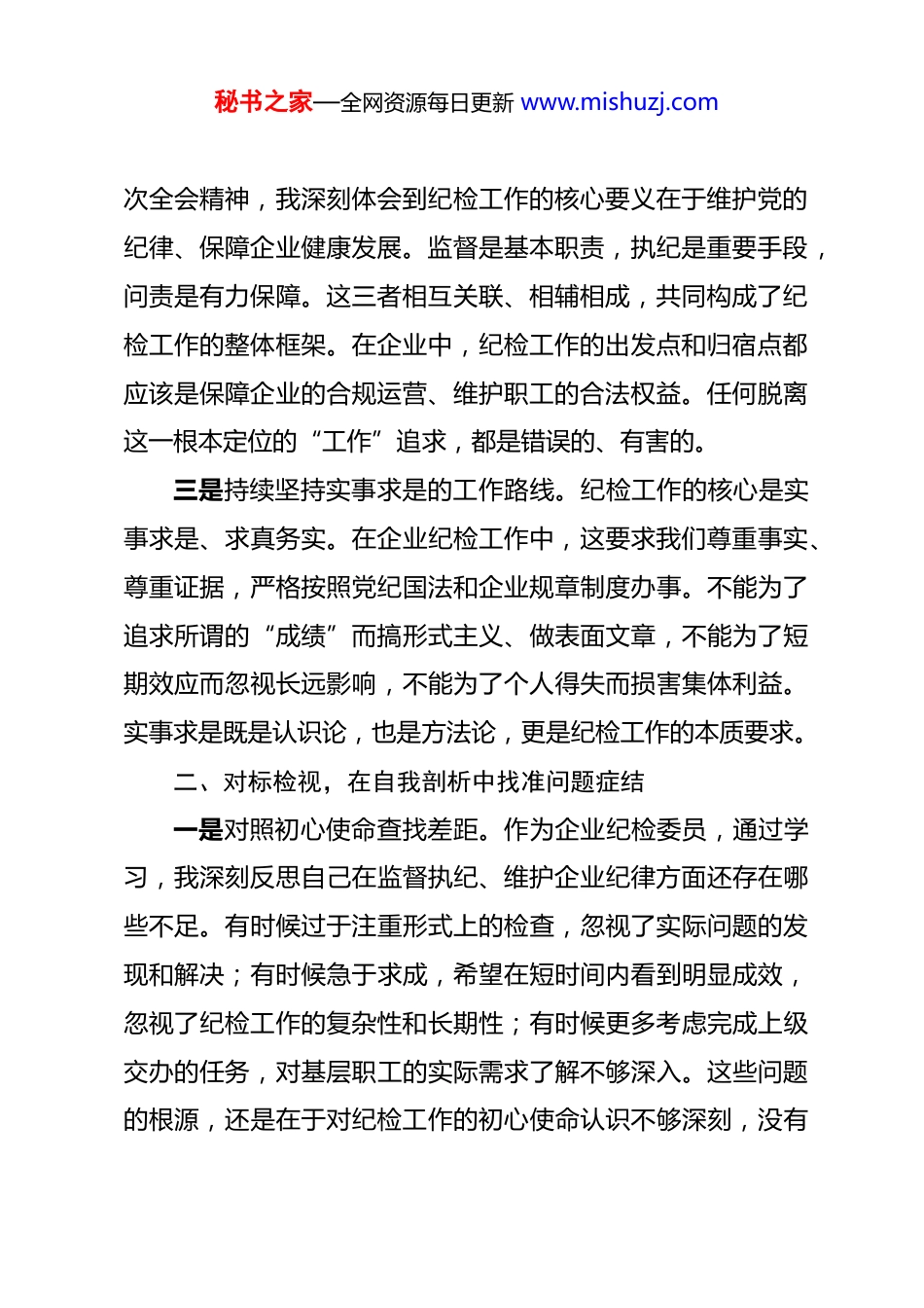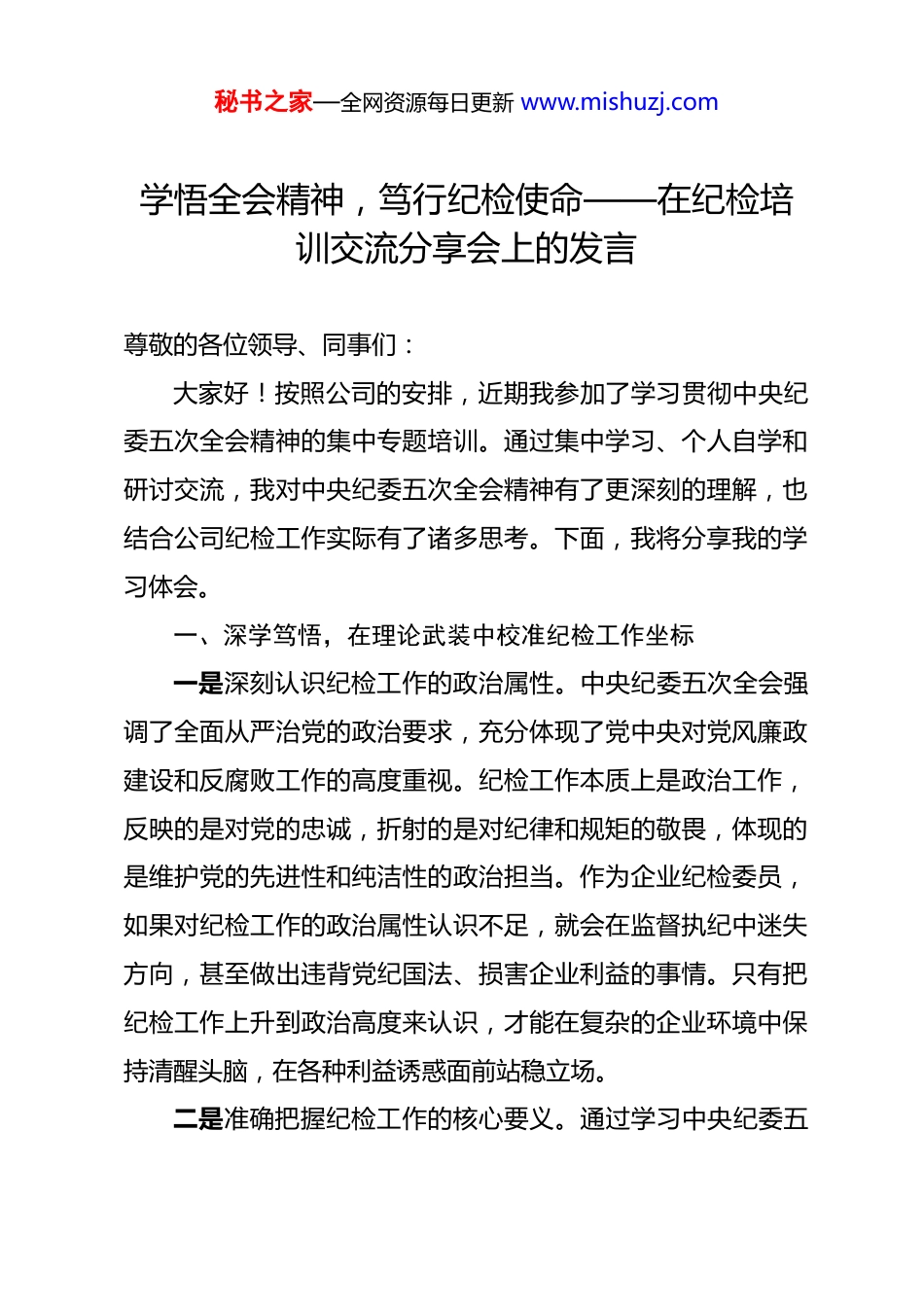 秘书之家—全网资源每日更新 www.mishuzj.com学悟全会精神,笃行纪检使命——在纪检培训交流分享会上的发言 尊敬的各位领导、同事们:大家好!按照公司的安排,近期我参加了学习贯彻中央纪委五次全会精神的集中专题培训。通过集中学习、个人自学和研讨交流,我对中央纪委五次全会精神有了更深刻的理解,也结合公司纪检工作实际有了诸多思考。下面,我将分享我的学习体会。一、深学笃悟,在理论武装中校准纪检工作坐标一是深刻认识纪检工作的政治属性。中央纪委五次全会强调了全面从严治党的政治要求,充分体现了党中央对党风廉政建设和反腐败工作的高度重视。纪检工作本质上是政治工作,反映的是对党的忠诚,折射的是对纪律和规矩的敬畏,体现的是维护党的先进性和纯洁性的政治担当。作为企业纪检委员,如果对纪检工作的政治属性认识不足,就会在监督执纪中迷失方向,甚至做出违背党纪国法、损害企业利益的事情。只有把纪检工作上升到政治高度来认识,才能在复杂的企业环境中保持清醒头脑,在各种利益诱惑面前站稳立场。二是准确把握纪检工作的核心要义。通过学习中央纪委五秘书之家—全网资源每日更新 www.mishuzj.com次全会精神,我深刻体会到纪检工作的核心要义在于维护党的纪律、保障企业健康发展。监督是基本职责,执纪是重要手段,问责是有力保障。这三者相互关联、相辅相成,共同构成了纪检工作的整体框架。在企业中,纪检工作的出发点和归宿点都应该是保障企业的合规运营、维护职工的合法权益。任何脱离这一根本定位的“工作”追求,都是错误的、有害的。三是持续坚持实事求是的工作路线。纪检工作的核心是实事求是、求真务实。在企业纪检工作中,这要求我们尊重事实、尊重证据,严格按照党纪国法和企业规章制度办事。不能为了追求所谓的“成绩”而搞形式主义、做表面文章,不能为了短期效应而忽视长远影响,不能为了个人得失而损害集体利益。实事求是既是认识论,也是方法论,更是纪检工作的本质要求。二、对标检视,在自我剖析中找准问题症结一是对照初心使命查找差距。作为企业纪检委员,通过学习,我深刻反思自己在监督执纪、维护企业纪律方面还存在哪些不足。有时候过于注重形式上的检查,忽视了实际问题的发现和解决;有时候急于求成,希望在短时间内看到明显成效,忽视了纪检工作的复杂性和长期性;有时候更多考虑完成上级交办的任务,对基层职工的实际需求了解不够深入。这些问题的根源,还是在于对纪检工作的初心使命认识不够深刻,没有秘书之家—全网资源每日更新 www.mishuzj.com真正把“维护企业利益、保障职工权益”作为一切工作的出发点和落脚点。二是对照党性修养查找根源。纪检工作者的党性修养直接关系到纪检工作的质量和效果。反思自己,在党性锤炼上还不够严格,在世界观、人生观、价值观这个“总开关”上还拧得不够紧。理论学习有时浮于表面,没有真正做到入脑入心、融会贯通;实践锻炼有时蜻蜓点水,没有真正深入基层、了解实际情况;自我革命有时力度不够,没有真正做到刀刃向内、刮骨疗毒。这些问题的存在,直接影响了纪检工作的权威性和公信力。三是对照工作实际查找短板。在企业纪检工作中,是否存在重“显绩”轻“潜绩”的倾向?是否存在重短期效果轻长远发展的倾向?是否存在重上级满意轻职工认可的倾向?通过深入查摆,我认识到自己在监督方式、执纪力度、问责效果等方面,确实存在急于求成、贪大求全等问题。有时候为了完成任务而完成任务,忽视了工作的质量和效果;有时候为了出亮点、出成绩,忽视了基础性、长远性的工作。这些都是政绩观偏差在纪检工作中的具体表现,必须认真加以纠正。三、真抓实干,在履职尽责中践行纪检使命一是坚持以企业发展为中心的工作导向。企业纪检工作的秘书之家—全网资源每日更新 www.mishuzj.com对象是企业内部的各个部门和全体职工,服务对象是企业的健康发展。要始终把保障企业的合规运营、促进企业的可持续发展作为工作的根本目的,把企业领导和职工满意不满意作为检验工作成效的根本标准。要深入了解企业各部门的工作流程和业务特点,真心实意为他们提供纪律保障和监督服务。要加强对企业重大决策、...