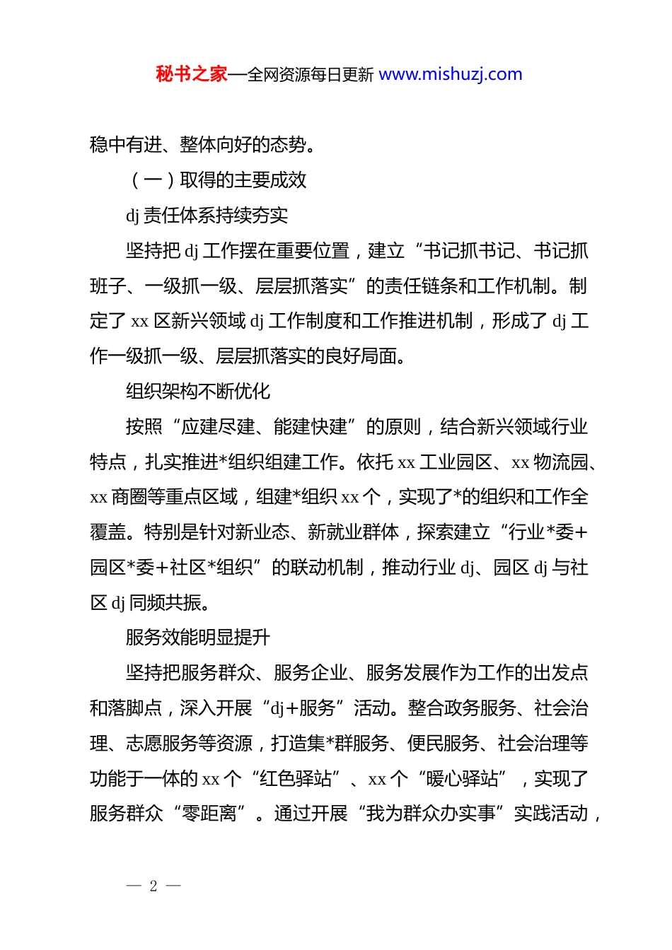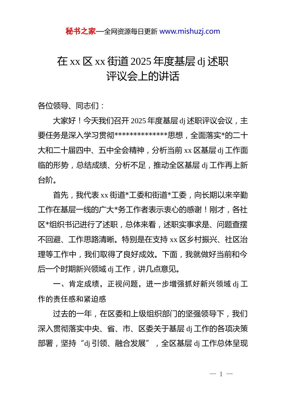秘书之家—全网资源每日更新 www.mishuzj.com在 xx 区 xx 街道 2025 年度基层 dj 述职评议会上的讲话各位领导、同志们:大家好!今天我们召开 2025 年度基层 dj 述职评议会议,主要任务是深入学习贯彻**************思想,全面落实*的二十大和二十届四中、五中全会精神,分析当前 xx 区基层 dj 工作面临的形势,总结成绩、分析不足,推动全区基层 dj 工作再上新台阶。首先,我代表 xx 街道*工委和街道*工委,向长期以来辛勤工作在基层一线的广大*务工作者表示衷心的感谢!刚才,各社区*组织书记进行了述职,总体来看,述职实事求是、问题查摆不回避、工作思路清晰。特别是在支持 xx 区乡村振兴、社区治理等工作中,我们取得了良好成效。下面,我就做好当前和今后一个时期新兴领域 dj 工作,讲几点意见。一、肯定成绩,正视问题,进一步增强抓好新兴领域 dj 工作的责任感和紧迫感过去的一年,在区委和上级组织部门的坚强领导下,我们深入贯彻落实中央、省、市、区委关于基层 dj 工作的各项决策部署,坚持“dj 引领、融合发展”,全区基层 dj 工作总体呈现— 1 —秘书之家—全网资源每日更新 www.mishuzj.com稳中有进、整体向好的态势。(一)取得的主要成效dj 责任体系持续夯实坚持把 dj 工作摆在重要位置,建立“书记抓书记、书记抓班子、一级抓一级、层层抓落实”的责任链条和工作机制。制定了 xx 区新兴领域 dj 工作制度和工作推进机制,形成了 dj 工作一级抓一级、层层抓落实的良好局面。组织架构不断优化按照“应建尽建、能建快建”的原则,结合新兴领域行业特点,扎实推进*组织组建工作。依托 xx 工业园区、xx 物流园、xx 商圈等重点区域,组建*组织 xx 个,实现了*的组织和工作全覆盖。特别是针对新业态、新就业群体,探索建立“行业*委+园区*委+社区*组织”的联动机制,推动行业 dj、园区 dj 与社区 dj 同频共振。服务效能明显提升坚持把服务群众、服务企业、服务发展作为工作的出发点和落脚点,深入开展“dj+服务”活动。整合政务服务、社会治理、志愿服务等资源,打造集*群服务、便民服务、社会治理等功能于一体的 xx 个“红色驿站”、xx 个“暖心驿站”,实现了服务群众“零距离”。通过开展“我为群众办实事”实践活动,— 2 —秘书之家—全网资源每日更新 www.mishuzj.com累计解决群众实际困难 xx 余件,群众获得感、幸福感、安全感持续增强。基层治理效能显著增强坚持 dj 引领基层治理,积极探索“dj+网格”治理模式。推动*组织向网格延伸、*员作用在网格发挥,建立“街道*工委—社区*组织—网格*支部(*小组)”三级组织体系,整合网格员、楼栋长、志愿者等力量,构建起共建共治共享的基层治理新格局。(二)存在的突出问题在肯定成绩的同时,我们也要清醒地看到,对照新时代*的建设总要求和上级*组织的期望,基层 dj 工作还存在一些差距和不足:思想认识有偏差个别*组织书记对 dj 工作重视程度不够,存在“重业务、轻 dj”的思想,认为 dj 工作是软任务、虚指标,抓不抓关系不大,导致 dj 工作与业务工作融合不深、结合不紧。工作推进不平衡各社区、各行业之间 dj 工作发展不均衡,有的社区 dj 工作基础扎实、亮点突出;有的社区则存在组织生活不规范、*员教育管理不到位等问题,影响了整体工作水平。— 3 —秘书之家—全网资源每日更新 www.mishuzj.com创新意识不够强面对新形势下基层 dj 出现的新情况、新问题,部分*组织习惯于按部就班、照抄照搬,缺乏创新思维和改革精神,工作亮点不够突出。队伍建设有待加强基层*务工作者队伍力量相对薄弱,部分*务工作者业务不熟练、能力不足,难以适应新时代基层 dj 工作的新要求。二、明确任务,狠抓落实,全力推动新兴领域 dj 工作高质量发展2026 年是“十五五”规划的开局之年,也是新兴领域 dj 工作提质增效的关键之年。作为分管 dj 工作的领导,我深感责任重大、使命光荣。下一步,我们要坚持以**************思想为指导,深入贯彻落实*的二十大和二十届四中、五中全会精神,聚焦“提升组织力、突出政治功能”,重点抓...