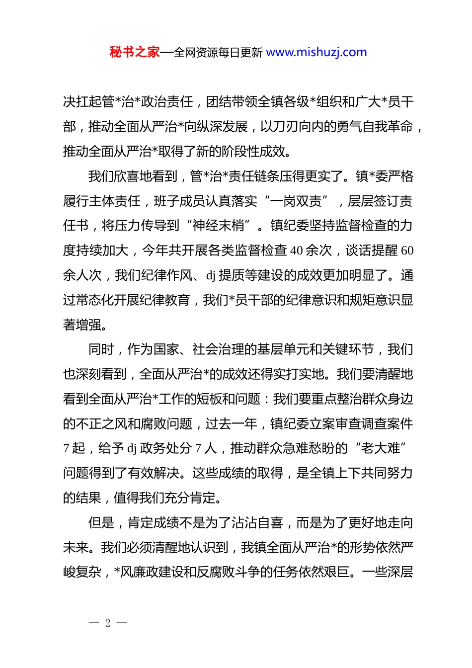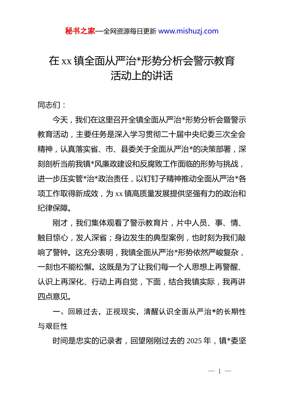 秘书之家—全网资源每日更新 www.mishuzj.com在 xx 镇全面从严治*形势分析会警示教育活动上的讲话同志们:今天,我们在这里召开全镇全面从严治*形势分析会暨警示教育活动,主要任务是深入学习贯彻二十届中央纪委三次全会精神,认真落实省、市、县委关于全面从严治*的决策部署,深刻剖析当前我镇*风廉政建设和反腐败工作面临的形势与挑战,进一步压实管*治*政治责任,以钉钉子精神推动全面从严治*各项工作取得新成效,为 xx 镇高质量发展提供坚强有力的政治和纪律保障。刚才,我们集体观看了警示教育片,片中人员、事、情、触目惊心,发人深省;身边发生的典型案例,也时刻为我们敲响了警钟。这充分表明,我镇全面从严治*形势依然严峻复杂,一刻也不能松懈。这既是为了让我们每一个人思想上再警醒、认识上再深化、行动上再自觉,下面,结合我镇实际,我再讲四点意见。一、回顾过去,正视现实,清醒认识全面从严治*的长期性与艰巨性时间是忠实的记录者,回望刚刚过去的 2025 年,镇*委坚— 1 —秘书之家—全网资源每日更新 www.mishuzj.com决扛起管*治*政治责任,团结带领全镇各级*组织和广大*员干部,推动全面从严治*向纵深发展,以刀刃向内的勇气自我革命,推动全面从严治*取得了新的阶段性成效。我们欣喜地看到,管*治*责任链条压得更实了。镇*委严格履行主体责任,班子成员认真落实“一岗双责”,层层签订责任书,将压力传导到“神经末梢”。镇纪委坚持监督检查的力度持续加大,今年共开展各类监督检查 40 余次,谈话提醒 60余人次,我们纪律作风、dj 提质等建设的成效更加明显了。通过常态化开展纪律教育,我们*员干部的纪律意识和规矩意识显著增强。同时,作为国家、社会治理的基层单元和关键环节,我们也深刻看到,全面从严治*的成效还得实打实地。我们要清醒地看到全面从严治*工作的短板和问题:我们要重点整治群众身边的不正之风和腐败问题,过去一年,镇纪委立案审查调查案件7 起,给予 dj 政务处分 7 人,推动群众急难愁盼的“老大难”问题得到了有效解决。这些成绩的取得,是全镇上下共同努力的结果,值得我们充分肯定。但是,肯定成绩不是为了沾沾自喜,而是为了更好地走向未来。我们必须清醒地认识到,我镇全面从严治*的形势依然严峻复杂,*风廉政建设和反腐败斗争的任务依然艰巨。一些深层— 2 —秘书之家—全网资源每日更新 www.mishuzj.com次、顽固性的问题尚未得到根本解决,新的问题还在不断出现。从我们掌握的情况看,突出表现在五个方面:第一是“思想松懈”的苗头依然存在。少数干部认为反腐败已经抓得差不多了,产生了“歇歇脚”的心态,对从严治*、对纪律规矩的敬畏之心有所淡化。第二是“基层小微权力”不规范的问题依然存在。有的干部担当精神不足,面对矛盾绕道走,面对难题往上推,工作满足于“开会发文、传达部署”,抓落实“重留痕、不重实效”,解决群众急难愁盼的锐气和钉子精神不够。第三是“庸懒散”的顽疾依然存在。个别干部、职工敷衍应付、推诿扯皮,工作安于现状、不思进取,在镇域范围和监管区依然存在,有的不收敛、不收手的现象在个别岗位上依然存在,有群众反映的“隐形腐败”问题隐患未绝。第四是“作风顽疾”依然根深蒂固。形式主义、官僚主义问题仍有遗存,文山会海、过度留痕等现象时有反弹,增加了基层负担,影响了工作实效。这些问题,看似在作风、实质在纪律,关乎*的形象和公信力,侵蚀着干群关系。我们必须以高度的政治自觉,正视这些问题,拿出壮士断腕的决心、攻坚克难的举措,切实加以解决。二、以“敬畏之心”自固根基,筑牢拒腐防变的思想堤坝古人云:“心有所畏,言有所戒,行有所止。”敬畏是最好的“护身符”。广大*员干部,特别是手握公权力的同志们,— 3 —秘书之家—全网资源每日更新 www.mishuzj.com必须常怀敬畏之心。时刻保持对 dj、国法、法纪的敬畏,这是我们安身立命的根本,也是拒腐防变的思想堤坝。要敬畏 dj,做到绝对忠诚。要始终牢记自己的第一身份是共产*员、第一职责是为*工作,平时在入*时在*旗下的庄严宣誓,要内化于心、外化于行。要自觉学习*章*规,任何情况下都同*中...