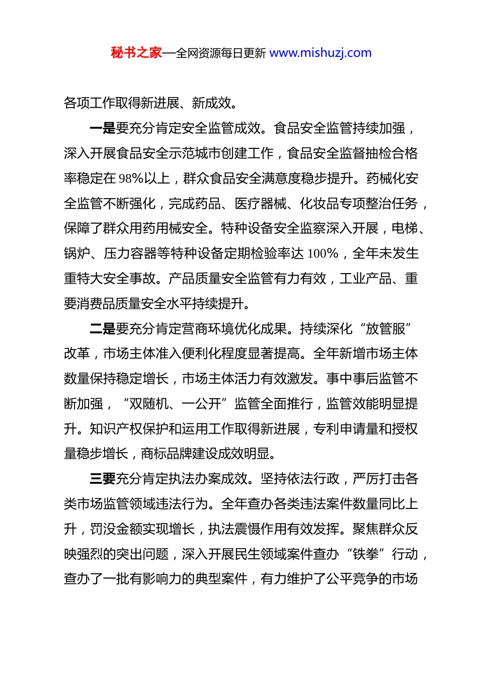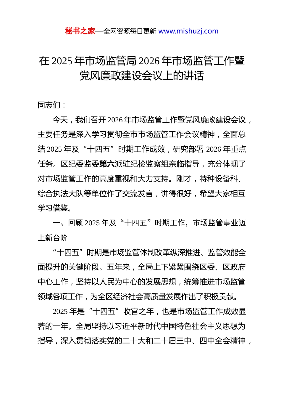 秘书之家—全网资源每日更新 www.mishuzj.com在 2025 年市场监管局 2026 年市场监管工作暨党风廉政建设会议上的讲话 同志们:今天,我们召开 2026 年市场监管工作暨党风廉政建设会议,主要任务是深入学习贯彻全市市场监管工作会议精神,全面总结 2025 年及“十四五”时期工作成效,研究部署 2026 年重点任务。区纪委监委第六派驻纪检监察组亲临指导,充分体现了对市场监管工作的高度重视和大力支持。刚才,特种设备科、综合执法大队等单位作了交流发言,讲得很好,希望大家相互学习借鉴。一、回顾 2025 年及“十四五”时期工作,市场监管事业迈上新台阶“十四五”时期是市场监管体制改革纵深推进、监管效能全面提升的关键阶段。五年来,全局上下紧紧围绕区委、区政府中心工作,坚持以人民为中心的发展思想,统筹推进市场监管领域各项工作,为全区经济社会高质量发展作出了积极贡献。2025 年是“十四五”收官之年,也是市场监管工作成效显著的一年。全局坚持以习近平新时代中国特色社会主义思想为指导,深入贯彻落实党的二十大和二十届三中、四中全会精神,秘书之家—全网资源每日更新 www.mishuzj.com各项工作取得新进展、新成效。一是要充分肯定安全监管成效。食品安全监管持续加强,深入开展食品安全示范城市创建工作,食品安全监督抽检合格率稳定在 98%以上,群众食品安全满意度稳步提升。药械化安全监管不断强化,完成药品、医疗器械、化妆品专项整治任务,保障了群众用药用械安全。特种设备安全监察深入开展,电梯、锅炉、压力容器等特种设备定期检验率达 100%,全年未发生重特大安全事故。产品质量安全监管有力有效,工业产品、重要消费品质量安全水平持续提升。二是要充分肯定营商环境优化成果。持续深化“放管服”改革,市场主体准入便利化程度显著提高。全年新增市场主体数量保持稳定增长,市场主体活力有效激发。事中事后监管不断加强,“双随机、一公开”监管全面推行,监管效能明显提升。知识产权保护和运用工作取得新进展,专利申请量和授权量稳步增长,商标品牌建设成效明显。三要充分肯定执法办案成效。坚持依法行政,严厉打击各类市场监管领域违法行为。全年查办各类违法案件数量同比上升,罚没金额实现增长,执法震慑作用有效发挥。聚焦群众反映强烈的突出问题,深入开展民生领域案件查办“铁拳”行动,查办了一批有影响力的典型案件,有力维护了公平竞争的市场秘书之家—全网资源每日更新 www.mishuzj.com秩序和消费者合法权益。四要充分肯定队伍建设成果。扎实开展党纪学习教育,干部队伍政治素质和业务能力明显提升。持续推进党风廉政建设,严格执行中央八项规定及其实施细则精神,干部作风明显好转。基层基础建设不断加强,监管执法条件持续改善。二、准确把握形势任务,增强做好 2026 年市场监管工作的责任感和紧迫感2026 年是“十五五”规划开局之年,也是市场监管事业高质量发展的关键之年。当前,市场监管工作面临新形势、新任务、新挑战。从宏观层面看,构建新发展格局、推动高质量发展对市场监管工作提出更高要求,需要我们在优化营商环境、激发市场活力方面发挥更大作用。从群众期待看,人民群众对食品安全、消费维权等方面的需求日益增长,需要我们在保障民生、维护权益方面持续发力。从监管实践看,新产业、新业态、新模式层出不穷,传统监管方式面临严峻挑战,需要我们在监管理念、监管方式、监管手段方面加快创新。与此同时,也要清醒认识到工作中存在的问题和不足。一是安全风险隐患仍然存在。部分领域安全基础不够牢固,农村地区、城乡结合部食品安全监管存在薄弱环节,小作坊、小餐饮、小摊贩“三小”业态监管难度较大。二是监管能力有待提秘书之家—全网资源每日更新 www.mishuzj.com升。基层监管力量相对薄弱,专业人才缺乏,监管装备和信息化水平有待提高。三是执法规范化建设需进一步加强。个别执法行为不够规范,执法文书制作不够严谨,执法程序意识需进一步增强。四是作风建设仍需持续用力。少数干部服务意识不够强,工作作风不够扎实,庸懒散拖现象仍然存在。对此,必须高度重视,采取有力措施加以解决。三、聚...