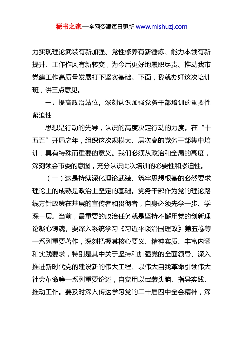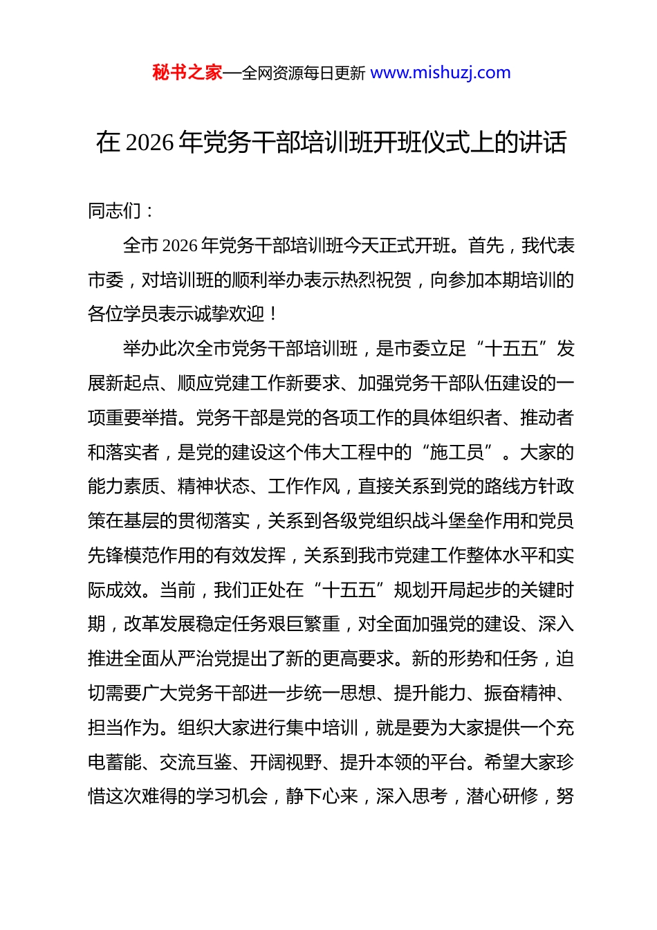 秘书之家—全网资源每日更新 www.mishuzj.com在 2026 年党务干部培训班开班仪式上的讲话 同志们:全市 2026 年党务干部培训班今天正式开班。首先,我代表市委,对培训班的顺利举办表示热烈祝贺,向参加本期培训的各位学员表示诚挚欢迎!举办此次全市党务干部培训班,是市委立足“十五五”发展新起点、顺应党建工作新要求、加强党务干部队伍建设的一项重要举措。党务干部是党的各项工作的具体组织者、推动者和落实者,是党的建设这个伟大工程中的“施工员”。大家的能力素质、精神状态、工作作风,直接关系到党的路线方针政策在基层的贯彻落实,关系到各级党组织战斗堡垒作用和党员先锋模范作用的有效发挥,关系到我市党建工作整体水平和实际成效。当前,我们正处在“十五五”规划开局起步的关键时期,改革发展稳定任务艰巨繁重,对全面加强党的建设、深入推进全面从严治党提出了新的更高要求。新的形势和任务,迫切需要广大党务干部进一步统一思想、提升能力、振奋精神、担当作为。组织大家进行集中培训,就是要为大家提供一个充电蓄能、交流互鉴、开阔视野、提升本领的平台。希望大家珍惜这次难得的学习机会,静下心来,深入思考,潜心研修,努秘书之家—全网资源每日更新 www.mishuzj.com力实现理论武装有新加强、党性修养有新锤炼、能力本领有新提升、工作作风有新转变,为今后更好地履职尽责、推动我市党建工作高质量发展打下坚实基础。下面,我就办好这次培训班,讲三点意见。一、提高政治站位,深刻认识加强党务干部培训的重要性紧迫性思想是行动的先导,认识的高度决定行动的力度。在“十五五”开局之年,组织这次规模大、层次高的党务干部集中培训,具有特殊而重要的意义。我们必须从政治和全局的高度,深刻领会市委的意图,充分认识此次培训的必要性和紧迫性。(一)这是持续深化理论武装、筑牢思想根基的必然要求理论上的成熟是政治上坚定的基础。党务干部作为党的理论路线方针政策在基层的宣传者和贯彻者,自身必须先学一步、学深一层。当前,最重要的政治任务就是坚持不懈用党的创新理论凝心铸魂。要深入系统学习《习近平谈治国理政》第五卷等一系列重要著作,深刻把握其核心要义、精神实质、丰富内涵和实践要求,特别是其中关于坚持和加强党的全面领导、深入推进新时代党的建设新的伟大工程、以伟大自我革命引领伟大社会革命等一系列重要论述,自觉用以武装头脑、指导实践、推动工作。要及时深入传达学习党的二十届四中全会精神,深秘书之家—全网资源每日更新 www.mishuzj.com刻领会党中央关于坚持和完善中国特色社会主义制度、推进国家治理体系和治理能力现代化的战略部署,准确把握其中对党的建设提出的新任务新要求。通过培训,就是要引导大家进一步深刻领悟“两个确立”的决定性意义,增强“四个意识”、坚定“四个自信”、做到“两个维护”,不断提高政治判断力、政治领悟力、政治执行力,始终在思想上政治上行动上同党中央保持高度一致,确保党务工作的正确政治方向。(二)这是适应新形势新任务、提升履职能力的迫切需要“十五五”时期,我国发展进入新阶段,面临的环境、条件和任务都发生了深刻变化。党建工作同样面临许多新课题、新挑战。比如,如何推动党建工作更好地围绕中心、服务大局,为高质量发展提供坚强政治保证;如何有效提升基层党组织的政治功能和组织功能,增强组织体系的严密性和战斗力;如何在新兴领域、新就业群体中扩大党的组织覆盖和工作覆盖;如何运用信息化手段提升党建工作智慧化水平;如何健全全面从严治党体系,推动管党治党责任落实落细等等。这些都对党务干部的政治素养、理论水平、专业能力、实践本领提出了新的更高要求。我们有些同志在理念思路、方法手段、能力素质上,与新时代党建工作的要求相比,还存在不适应、跟不上、有差距的问题。这次培训,就是要帮助大家认清形势、明确任务,秘书之家—全网资源每日更新 www.mishuzj.com补齐能力短板、克服本领恐慌,系统掌握做好新时代党建工作的看家本领,努力成为政治上的明白人、党建工作的内行人、干部职工的贴心人。(三)这是加强干部队伍建设、锻造过硬党务铁军的关...