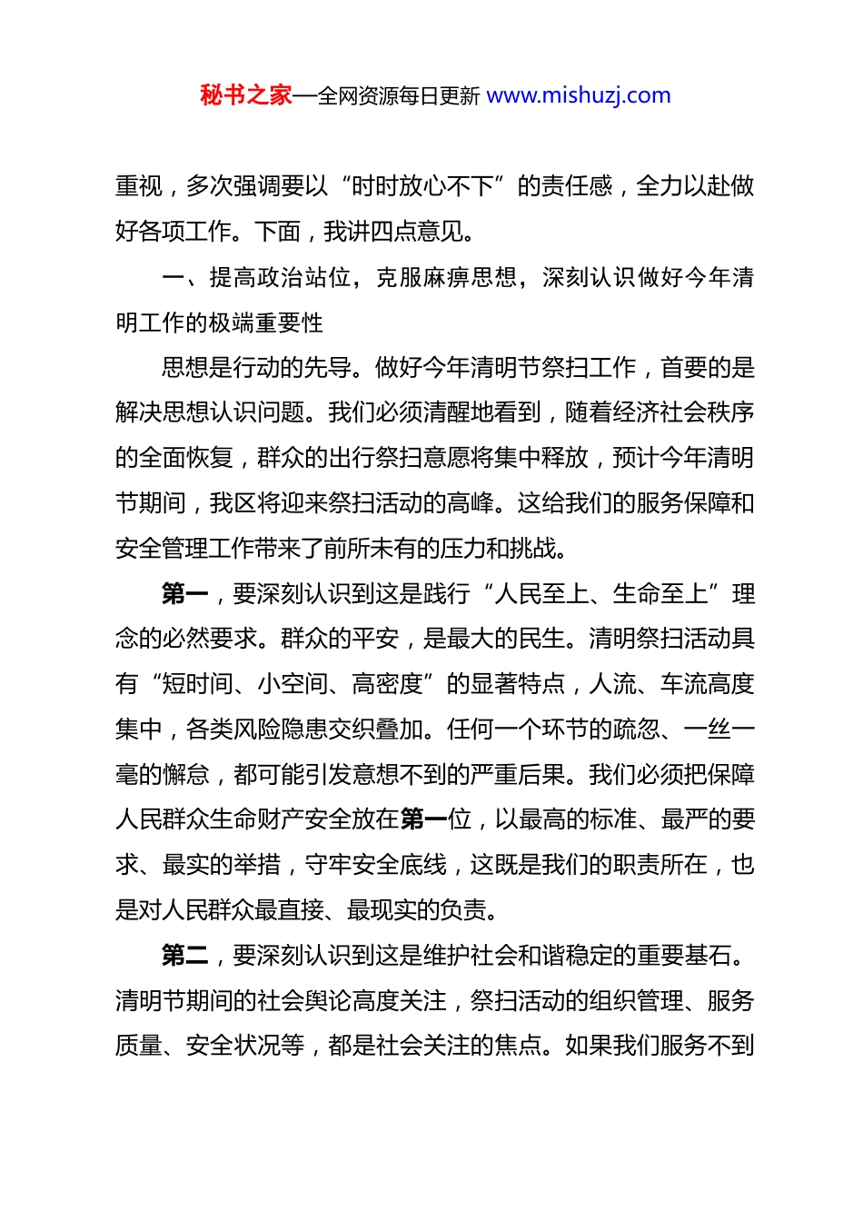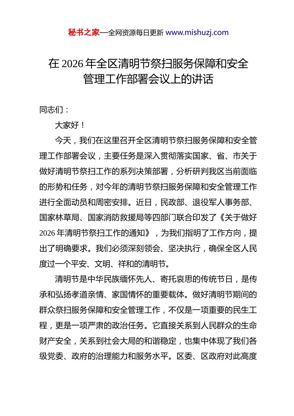 秘书之家—全网资源每日更新 www.mishuzj.com在 2026 年全区清明节祭扫服务保障和安全管理工作部署会议上的讲话 同志们:大家好!今天,我们在这里召开全区清明节祭扫服务保障和安全管理工作部署会议,主要任务是深入贯彻落实国家、省、市关于做好清明节祭扫工作的系列决策部署,分析研判我区当前面临的形势和任务,对今年的清明节祭扫服务保障和安全管理工作进行全面动员和周密安排。近日,民政部、退役军人事务部、国家林草局、国家消防救援局等四部门联合印发了《关于做好2026 年清明节祭扫工作的通知》,为我们指明了工作方向,提出了明确要求。我们必须深刻领会、坚决执行,确保全区人民度过一个平安、文明、祥和的清明节。清明节是中华民族缅怀先人、寄托哀思的传统节日,是传承和弘扬孝道亲情、家国情怀的重要载体。做好清明节期间的群众祭扫服务保障和安全管理工作,不仅是一项重要的民生工程,更是一项严肃的政治任务。它直接关系到人民群众的生命财产安全,关系到社会大局的和谐稳定,也集中体现了我们各级党委、政府的治理能力和服务水平。区委、区政府对此高度秘书之家—全网资源每日更新 www.mishuzj.com重视,多次强调要以“时时放心不下”的责任感,全力以赴做好各项工作。下面,我讲四点意见。一、提高政治站位,克服麻痹思想,深刻认识做好今年清明工作的极端重要性思想是行动的先导。做好今年清明节祭扫工作,首要的是解决思想认识问题。我们必须清醒地看到,随着经济社会秩序的全面恢复,群众的出行祭扫意愿将集中释放,预计今年清明节期间,我区将迎来祭扫活动的高峰。这给我们的服务保障和安全管理工作带来了前所未有的压力和挑战。第一,要深刻认识到这是践行“人民至上、生命至上”理念的必然要求。群众的平安,是最大的民生。清明祭扫活动具有“短时间、小空间、高密度”的显著特点,人流、车流高度集中,各类风险隐患交织叠加。任何一个环节的疏忽、一丝一毫的懈怠,都可能引发意想不到的严重后果。我们必须把保障人民群众生命财产安全放在第一位,以最高的标准、最严的要求、最实的举措,守牢安全底线,这既是我们的职责所在,也是对人民群众最直接、最现实的负责。第二,要深刻认识到这是维护社会和谐稳定的重要基石。清明节期间的社会舆论高度关注,祭扫活动的组织管理、服务质量、安全状况等,都是社会关注的焦点。如果我们服务不到秘书之家—全网资源每日更新 www.mishuzj.com位,引发群众不满;如果管理有疏漏,造成安全事故,就可能演变为影响社会稳定的公共事件。因此,各单位、各部门必须站在维护社会稳定大局的高度,将各项工作想在前面、做在实处,积极回应群众关切,用心用情用力解决群众的急难愁盼问题,营造安定祥和的社会氛围。第三,要坚决克服麻痹松懈和经验主义思想。有的同志可能会觉得,清明节保障工作年年都做,已经轻车熟路,按部就班就行。这种思想是极其危险的。我们必须认识到,每年的情况都在变化,新的风险点会不断出现。比如,今年春季天气干燥,森林火险等级持续偏高;部分祭扫场所周边道路交通压力巨大;群众对祭扫服务的需求也更加多元化。我们必须保持清醒的头脑,摒弃“老办法”“旧经验”,用发展的眼光审视问题,用创新的思路谋划工作,把困难估计得更充分一些,把预案做得更周全一些,绝不能因为麻痹大意而“失守”,绝不能因为心存侥幸而“出事”。二、聚焦风险防范,坚持底线思维,全面筑牢清明祭扫安全管理防线安全是清明祭扫工作的“底板”和“红线”,是“1”和“0”的关系,没有安全,一切都无从谈起。我们必须以“万无一失”的标准防止“一失万无”的发生,下好先手棋,打好主秘书之家—全网资源每日更新 www.mishuzj.com动仗,全面开展隐患排查,堵塞安全漏洞,确保祭扫活动安全平稳有序。(一)构建协同高效的指挥保障体系。成立由区政府分管领导牵头,区民政局、公安分局、应急管理局、消防救援大队、林业、交通运输、卫健、市场监管、城管等部门组成的*区清明节祭扫工作联合指挥部,实行集中办公、统一调度。各相关部门要按照职责分工,既各司其职,又密切配合,形成强大工作合力。民政部门要发...